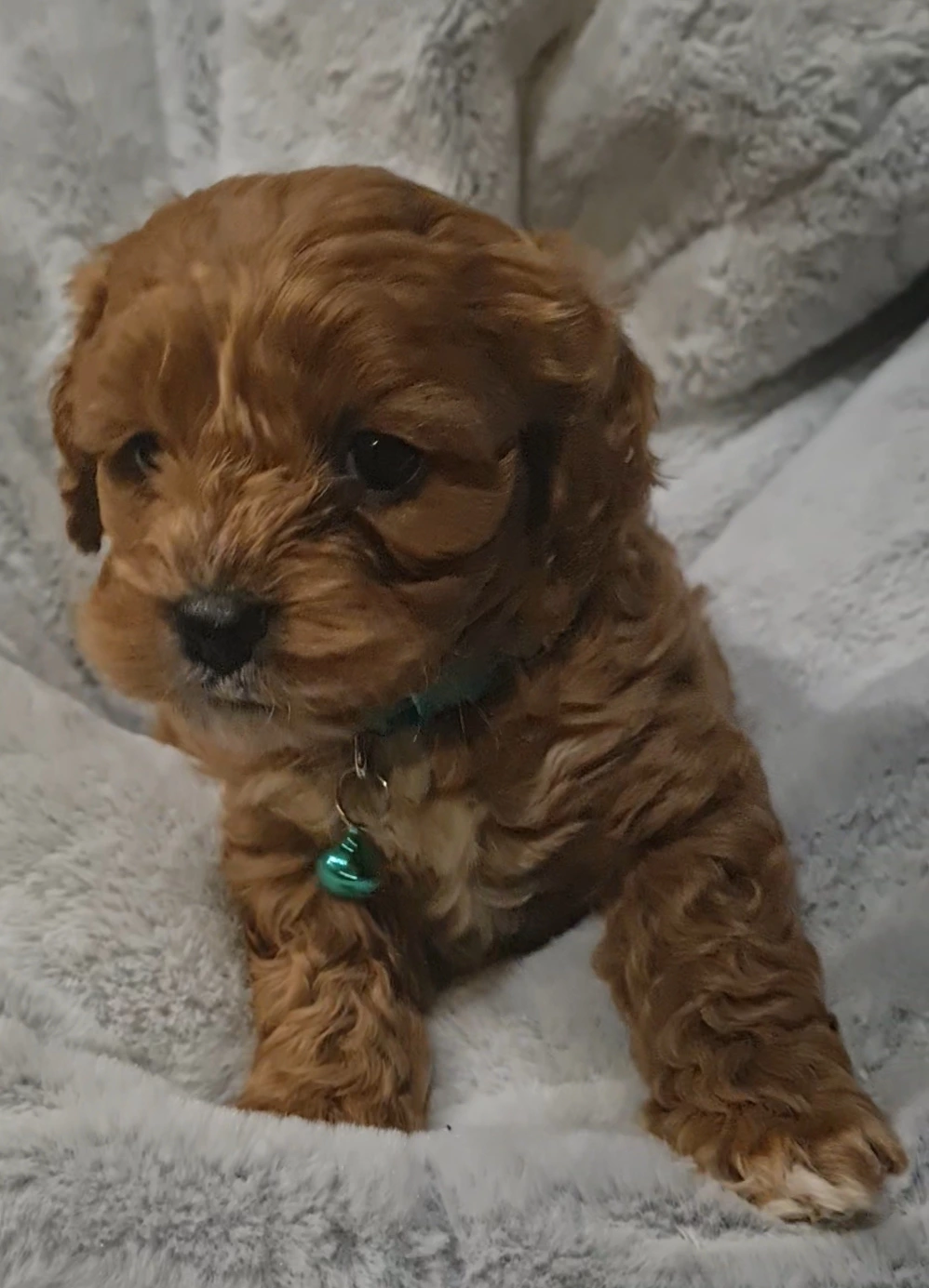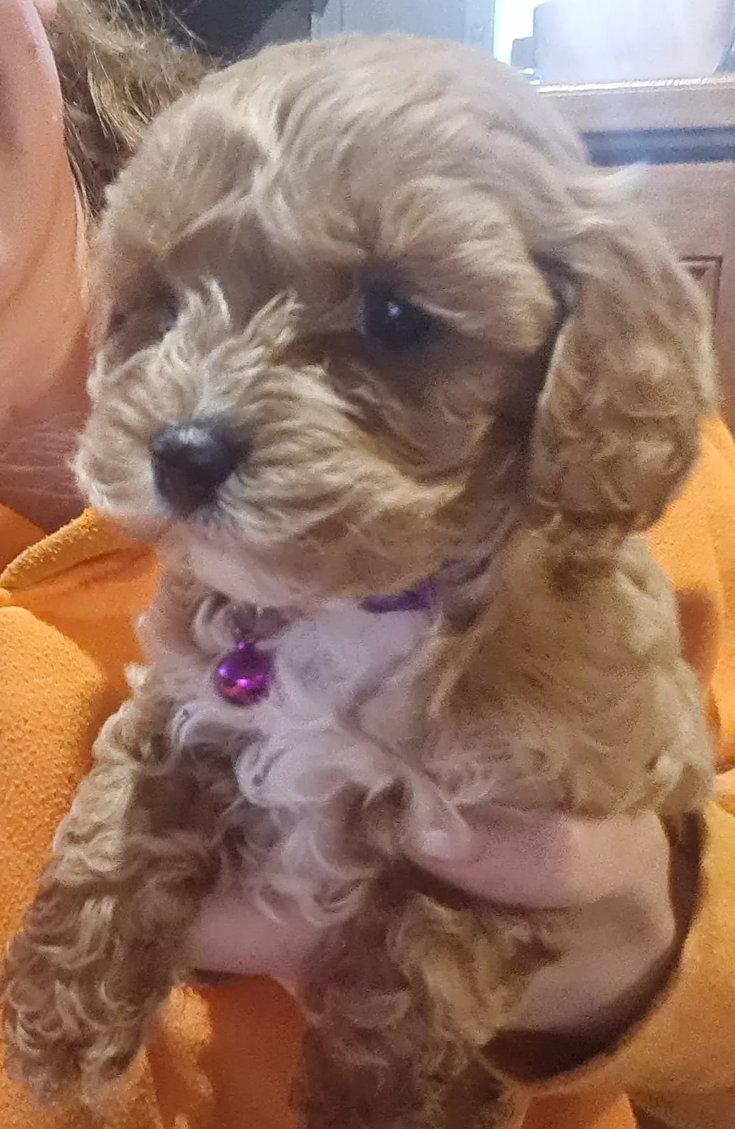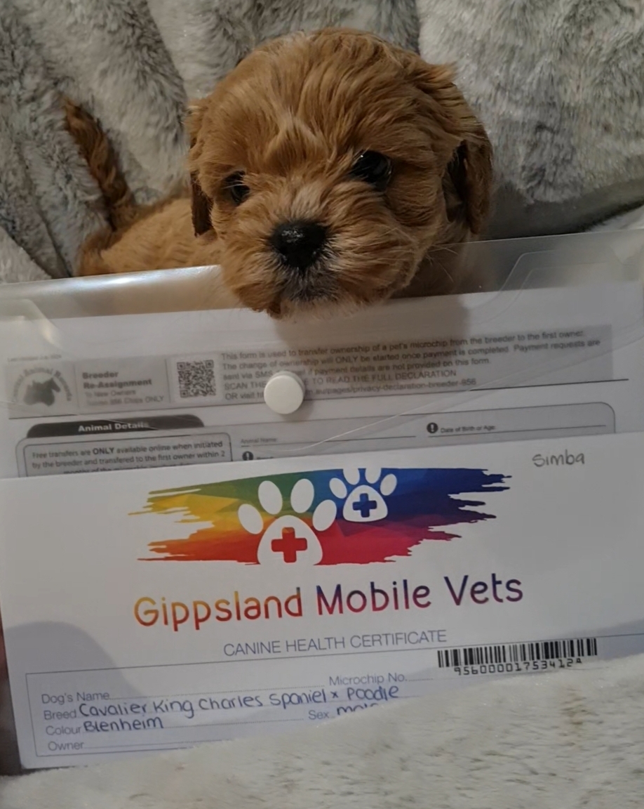 Male Cavoodle puppies available to be loved. Pure bred King Charles Cavelier mother and pure bred Toy Poodle father. Papers available for viewing. Our Cavoodles have been bred to a very high standard and loved by our family. We have only males left. Cavoodles are famous for their lovely dispositions, shed-free fur, companionship, and low maintenance care. They are great with children and elderly, and are most happy when in the company of their human family. Our Cavoodles grow to about the size of a small Cavelier. They come fully vet checked, wormed, vaccinated, and microchipped. There are no female pups left, but don't be dismayed, our little boys are absolutely GORGEOUS and so snuggly and playful. You'll love them. The green, yellow, and tiel pups are from Winnie, our blenheim Caevelier, and available from July 20. (mum pictured above). The purple, silver, red, and collarless (blenheim pictured in the grey blanket) pups are from Tilly, our ruby coloured Cavelier, and available from July 12. (mum pictured above with Winnie). We are asking $2,200 ono per puppy. We are located in the Latrobe Valley. Serious buyers only please. Viewings welcome. We look forward to hearing from you. 0407944108.