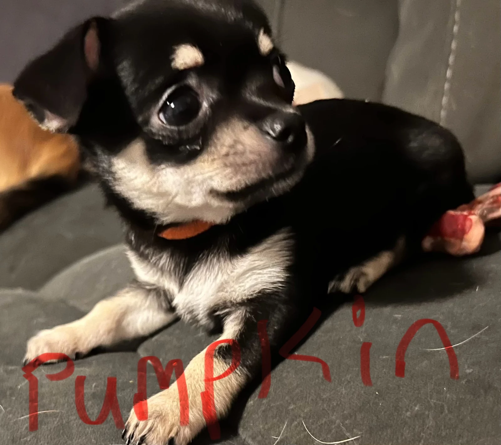 PUMPKIN ; Everyone’s favorite curly tailed pup. Black and white & little tan. Short haired. Thinks she’s the biggest dog in the park whilst being the smallest A little fire cracker.