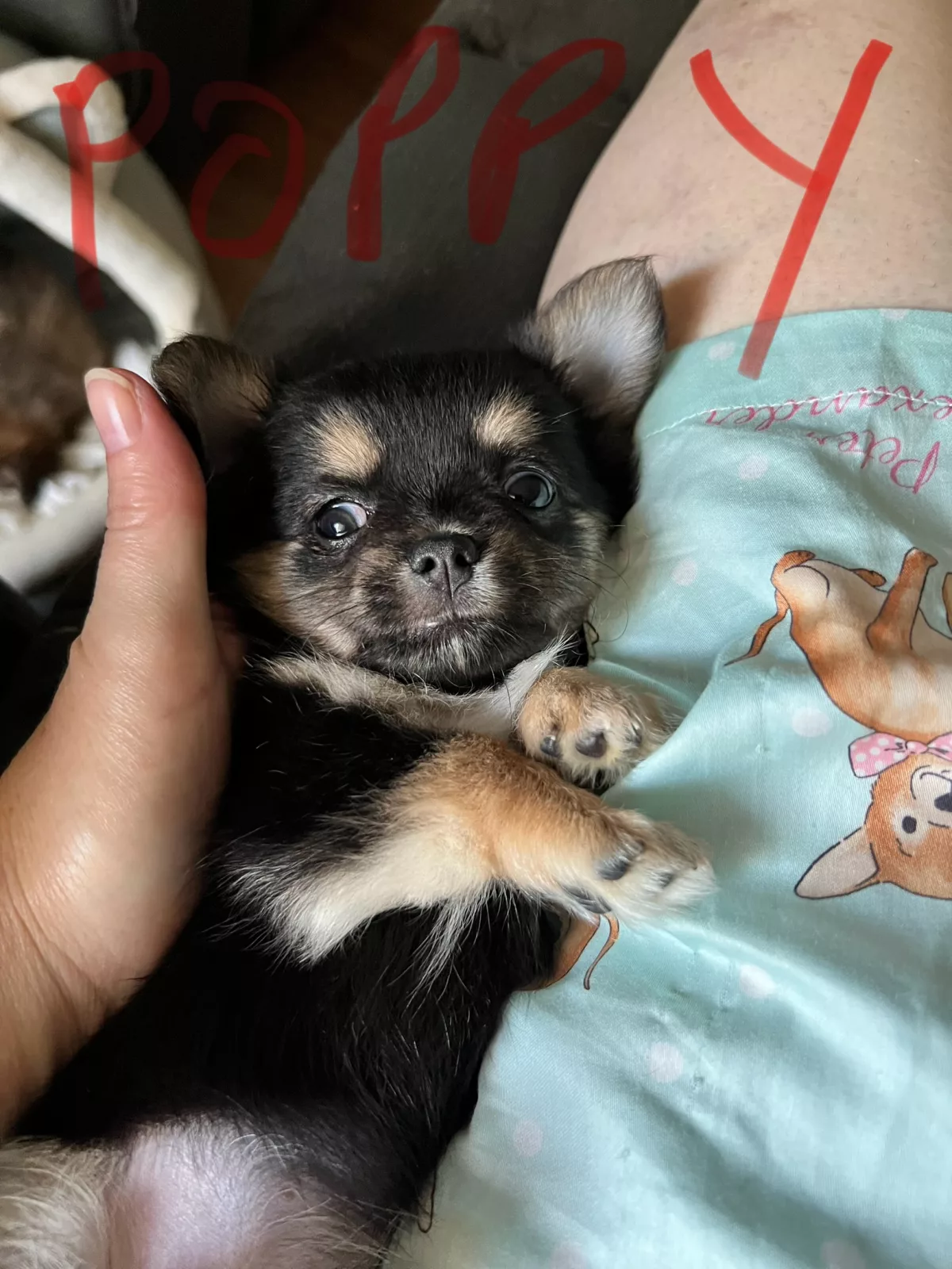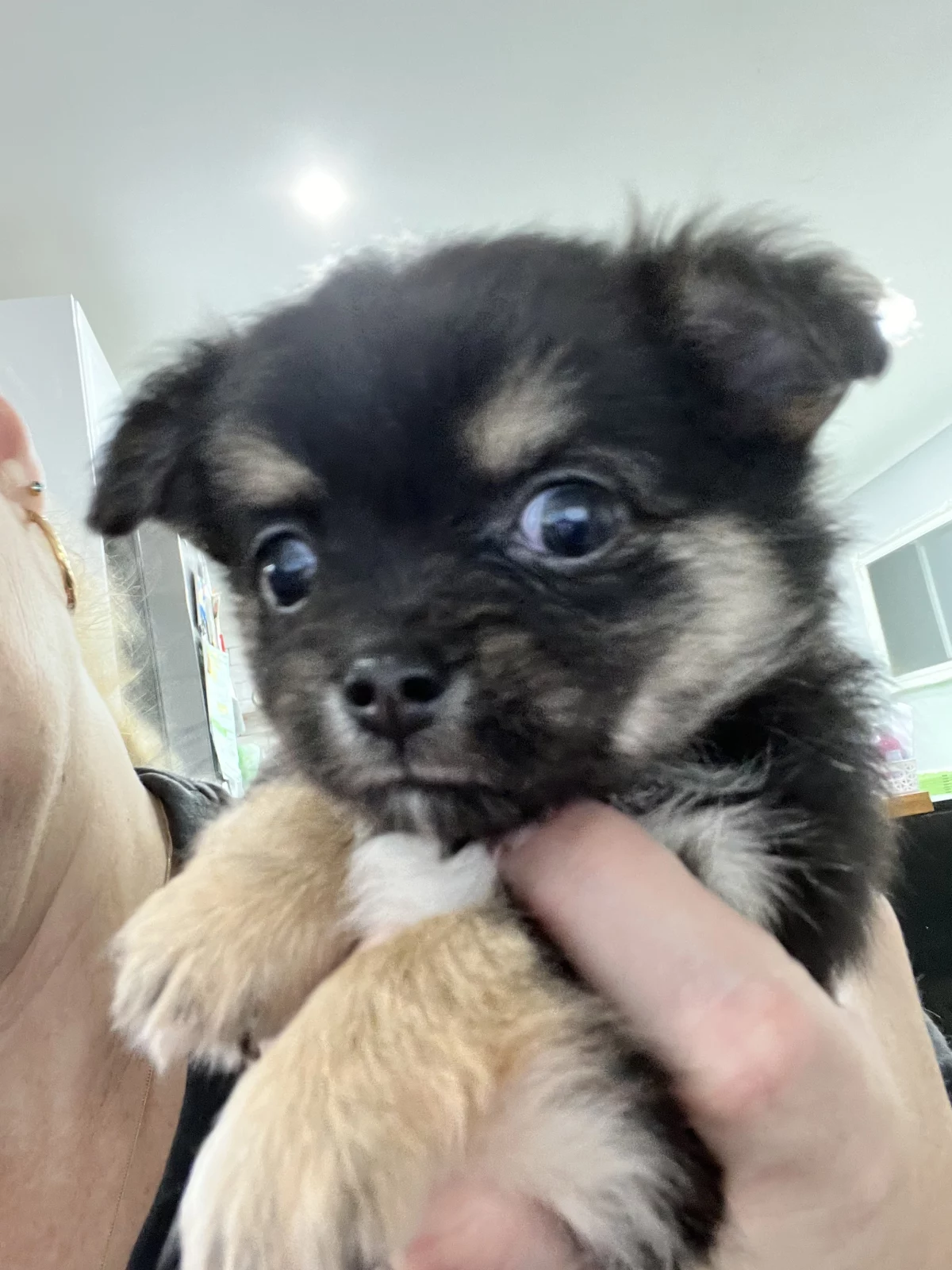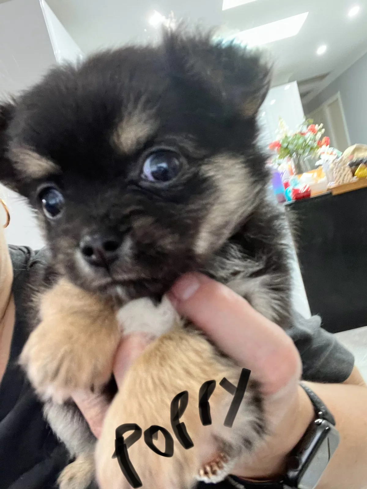 POPPY; Black white and tan. Super affectionate real fluff ball. long haired very cuddly. Loves neck cuddles and sleeping on your chest. Seeks out love and attention.