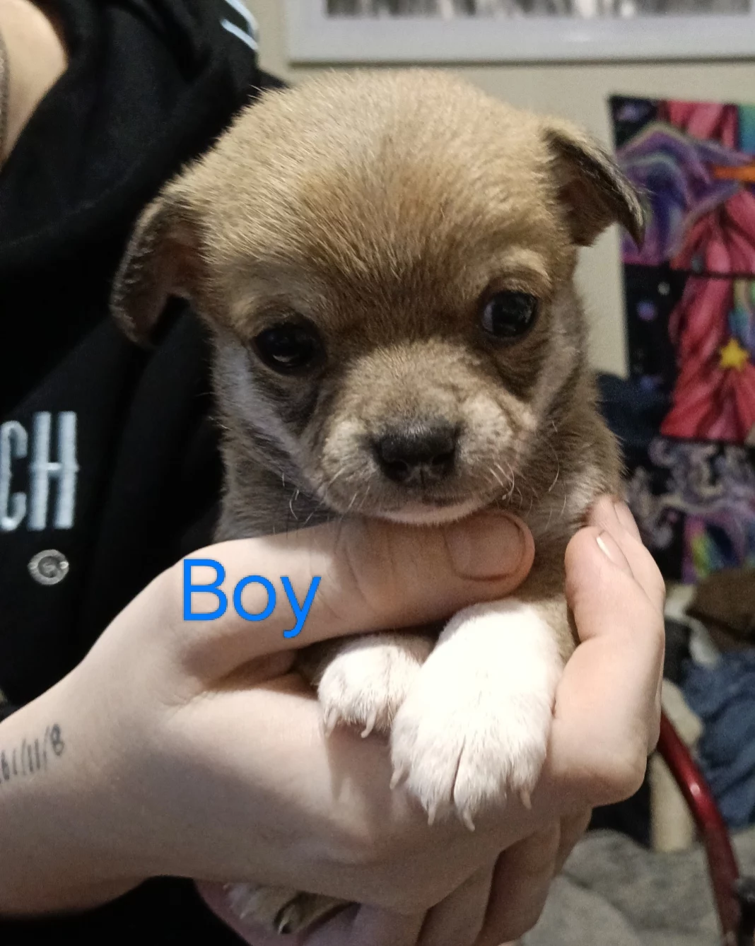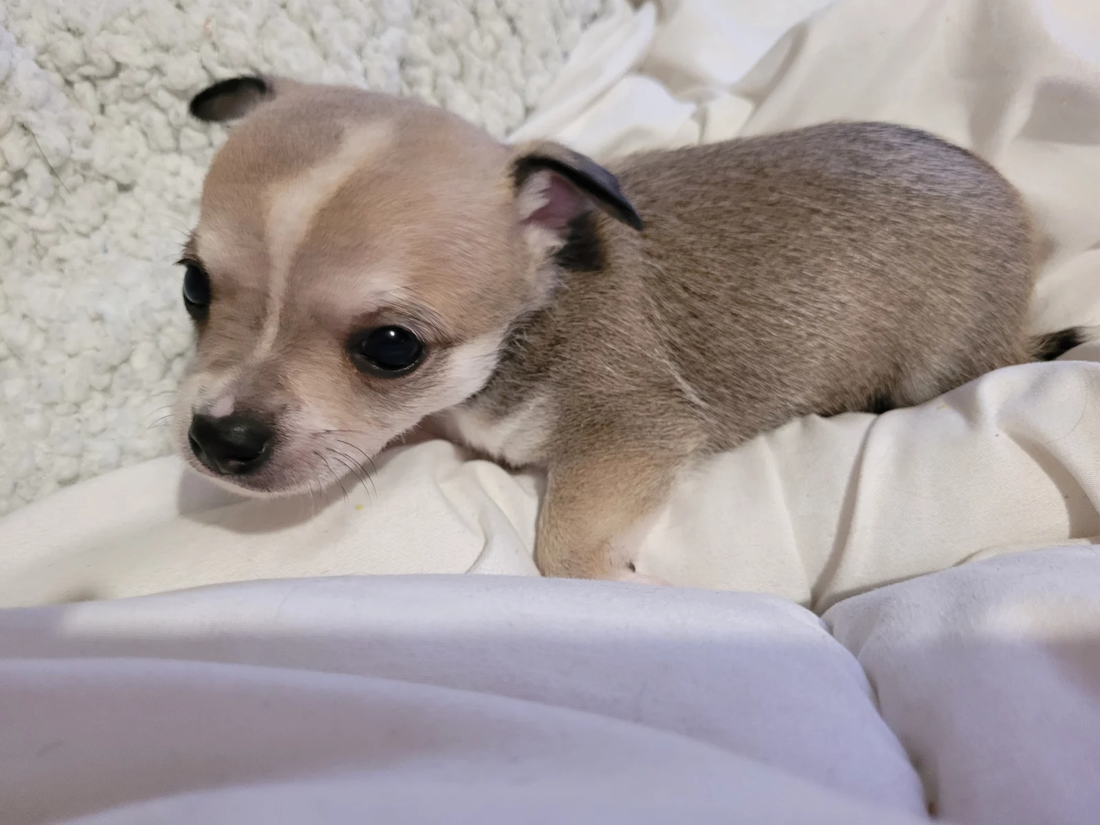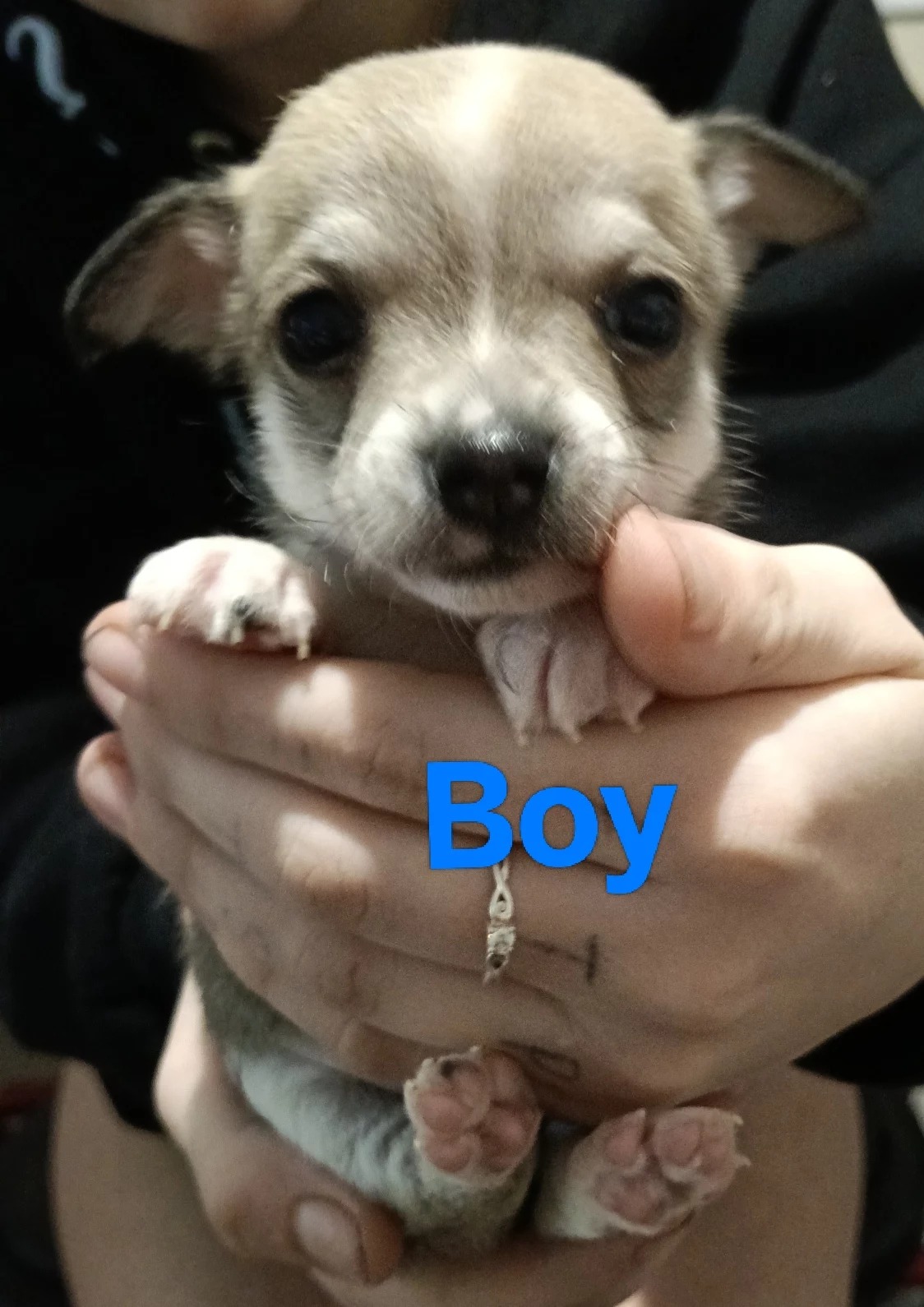 Two male chihuahuas one majority brown with white on legs and chest he is full of energy playing with the other pups and cat. The other is the runt he has white legs white on his chest and around his neck and grey everywhere else. He loves to play with toys and was the first to open his eyes, walk and bark. They are eating solids and lapping milk and water. They have been wormed twice so far, next is at 8 weeks. At 6 weeks they will be chipped vaccinated and vet checked.