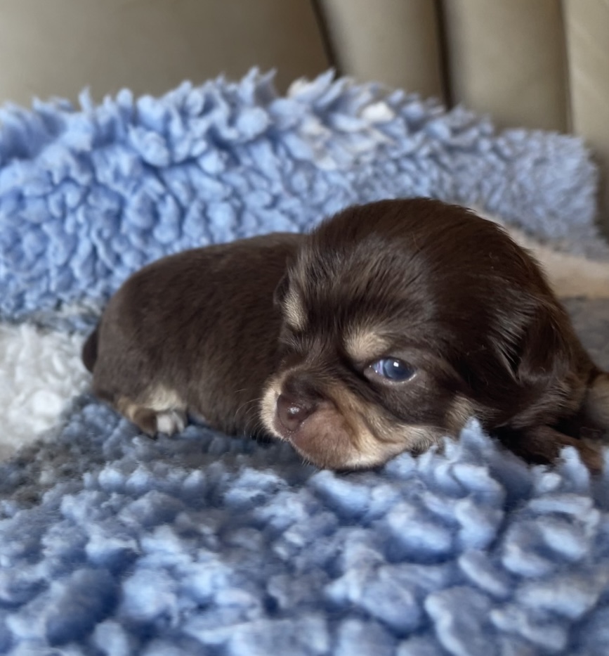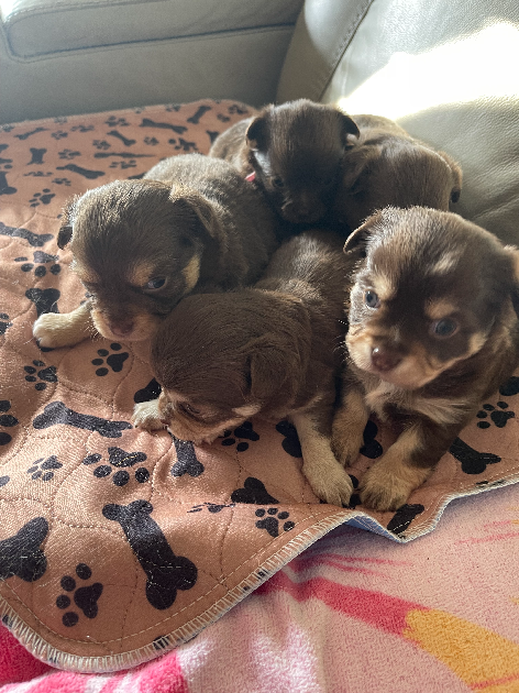 Long Coat dark chocolate chihuahuas born 5/9/24 . 2 makes 3 females . Puppies are wormed every 2 weeks will be vaccinated, mirochipped at 6 weeks with a vet health check.. DNA parentage . Will freight at buyers expense or delivered Brisbane are at 10-12 weeks of age . Beautiful puppies raised indoors .