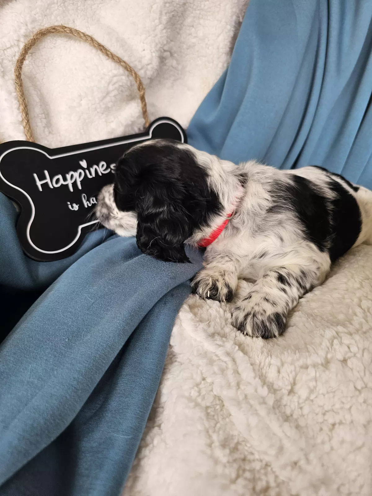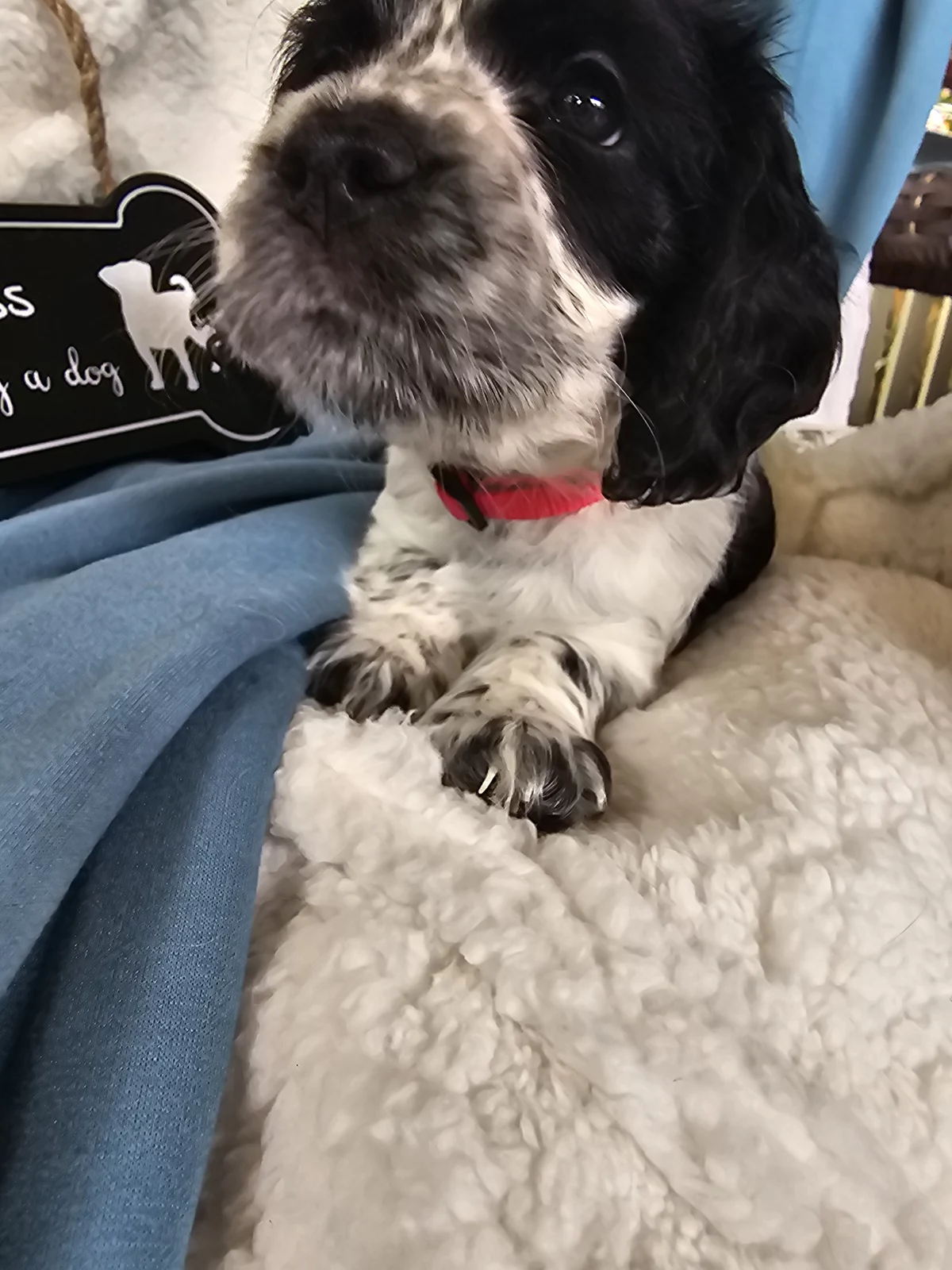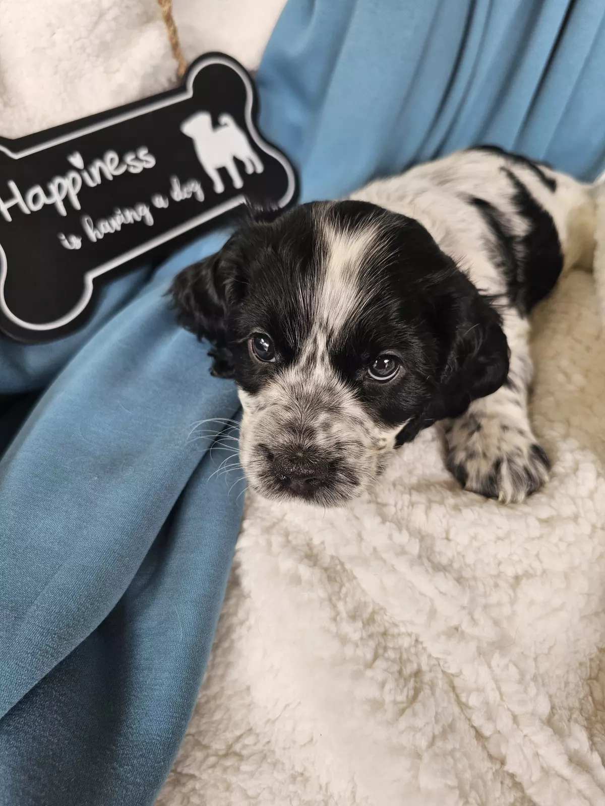 Mr Red is a perfect combination of playful and cuddly. Not to mention CUTE!!! He loves everybody, attention and affection (typical of this breed) and will happily go wherever you go (cafe, walks, work?). As you can see he's black and white, with some of his Mum's Roan markings coming through in his white areas.