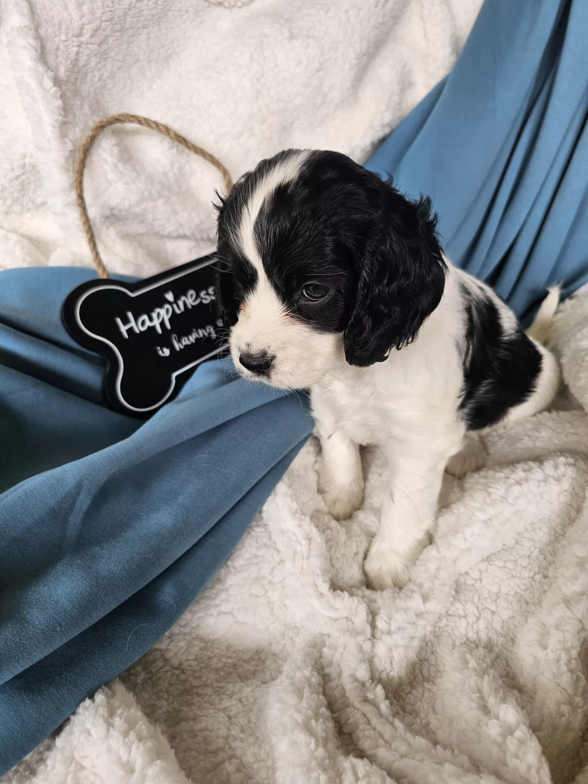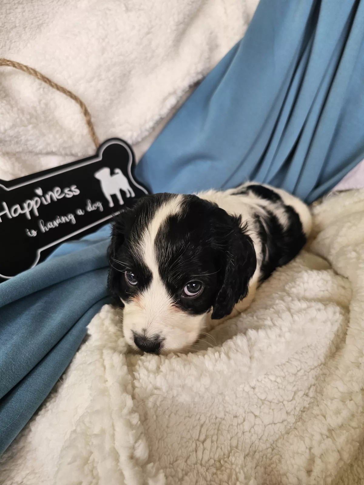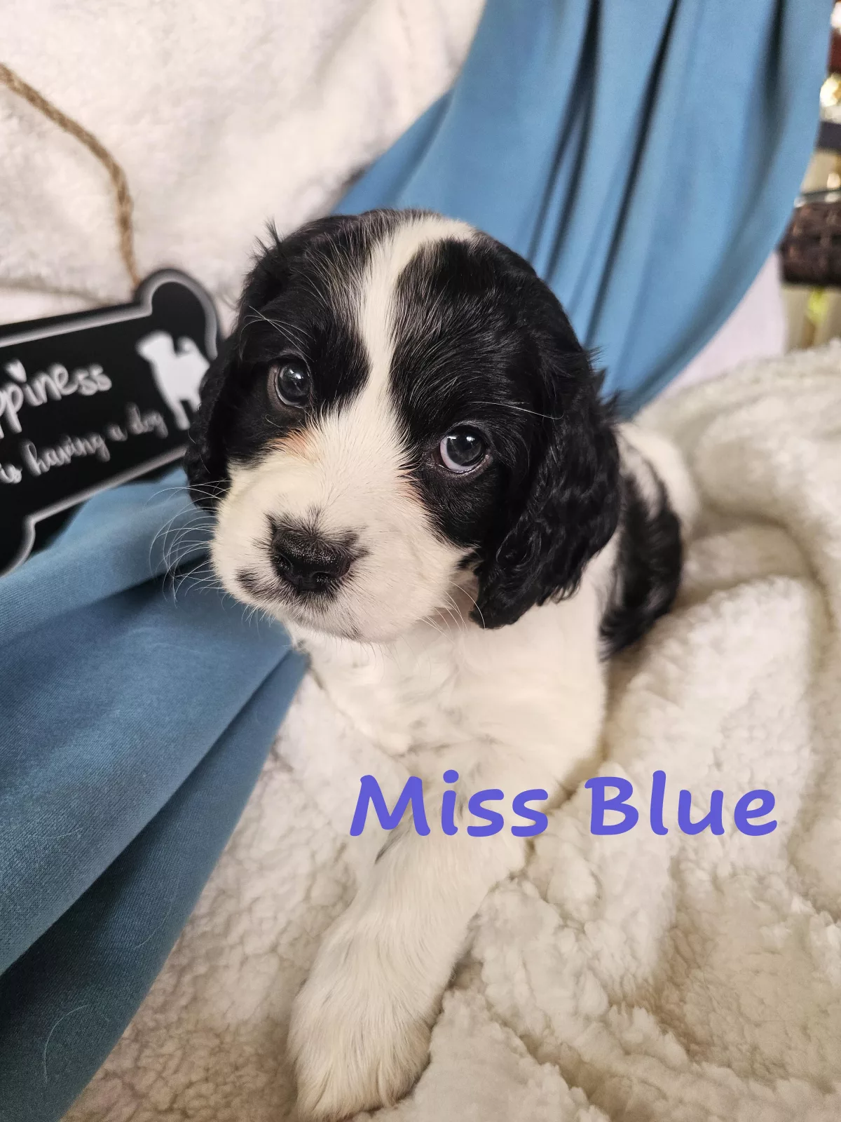 Miss Blue is a perfect combination of playful and cuddly. Not to mention CUTE!!! She loves everybody, attention and affection (typical of this breed) and will happily go wherever you go (cafe, walks, work?). As you can see she's black and white, with a marking on her left side shaped like a heart! :). She also the clever cookie of this litter - taking to potty training and eating solids like a champ!