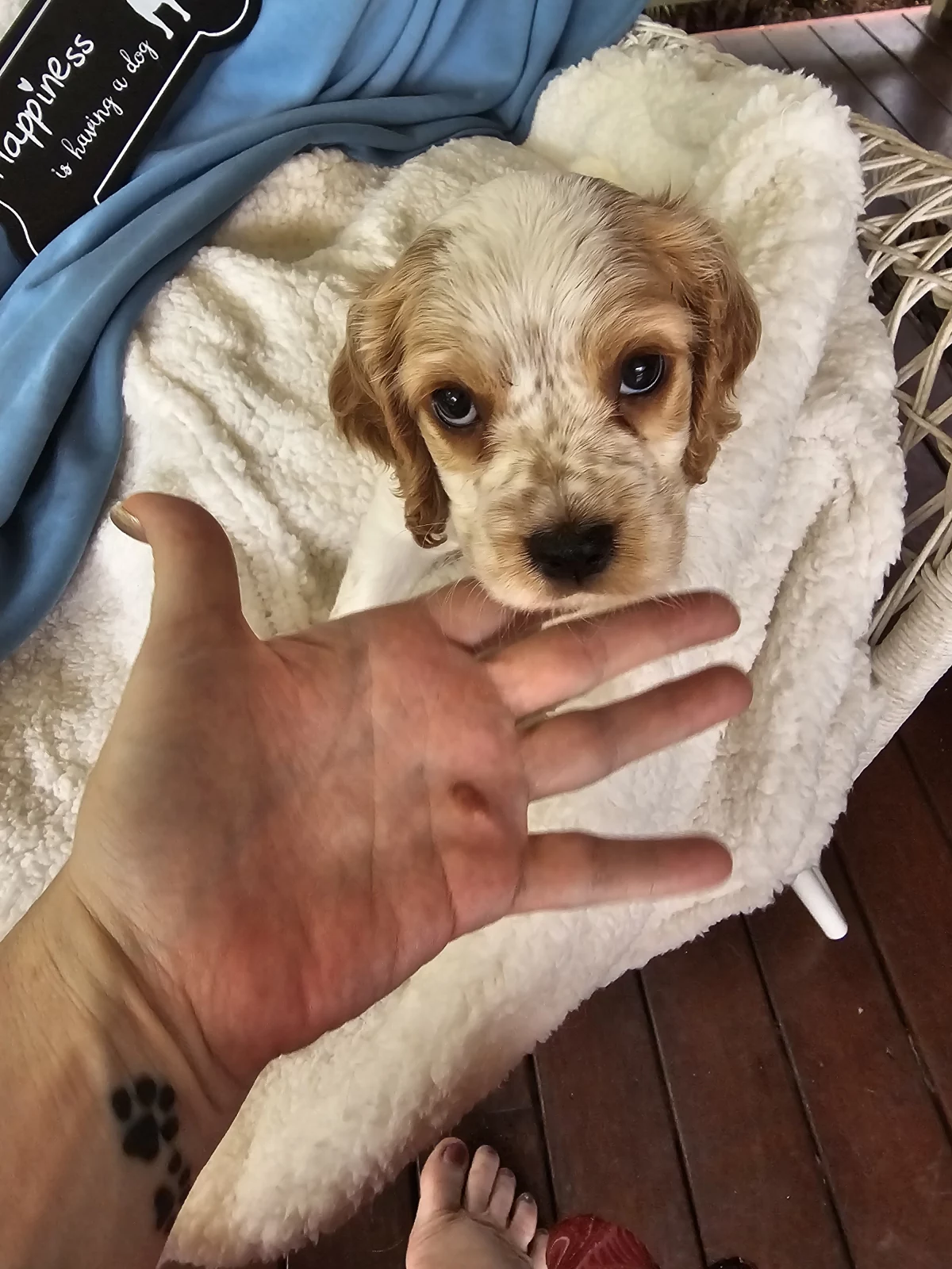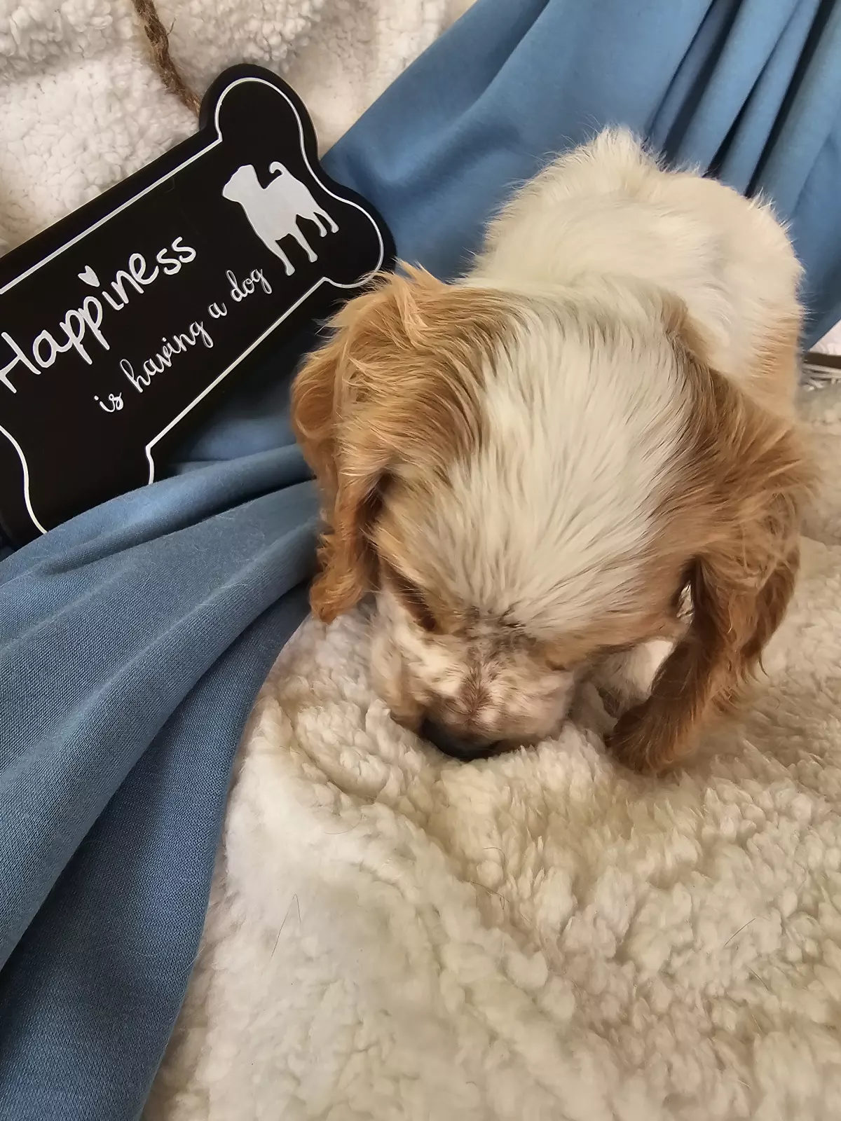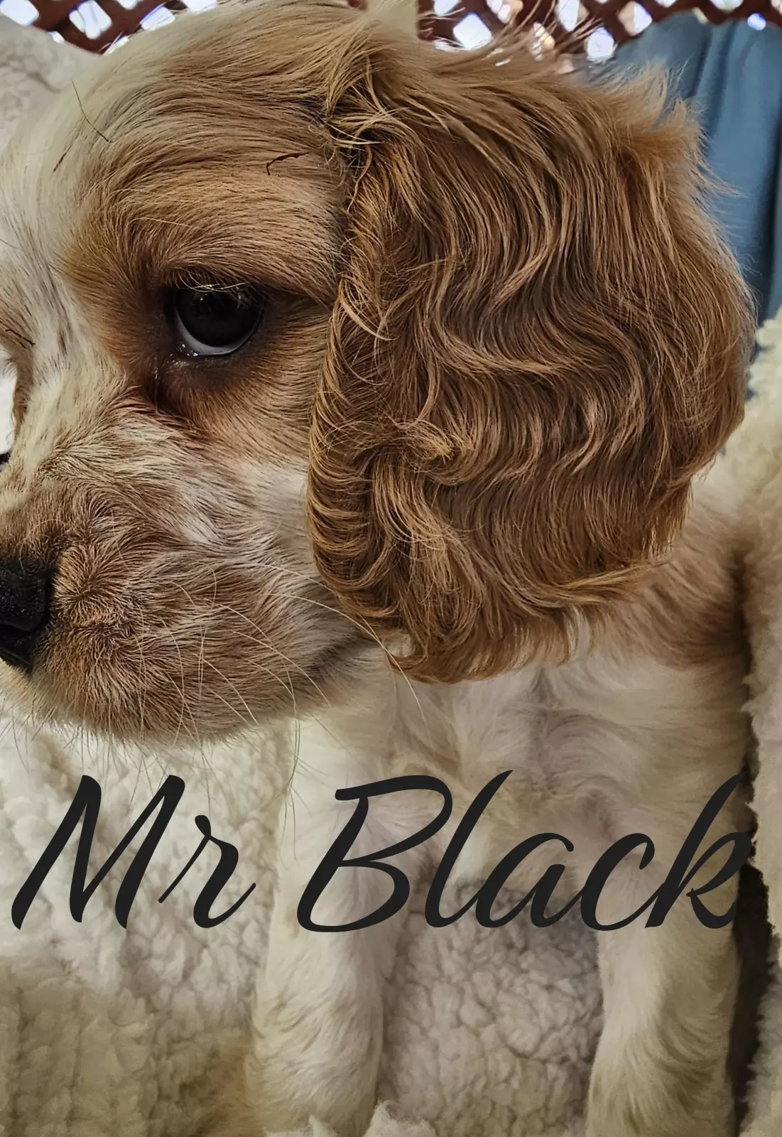 Mr Black is a perfect combination of playful and cuddly. Not to mention CUTE!!! He loves everybody, attention and affection (typical of this breed) and will happily go wherever you go (cafe, walks, work?). As you can see he's gold and white, with some of his Mum's Roan markings coming through in a little bit of his white areas.