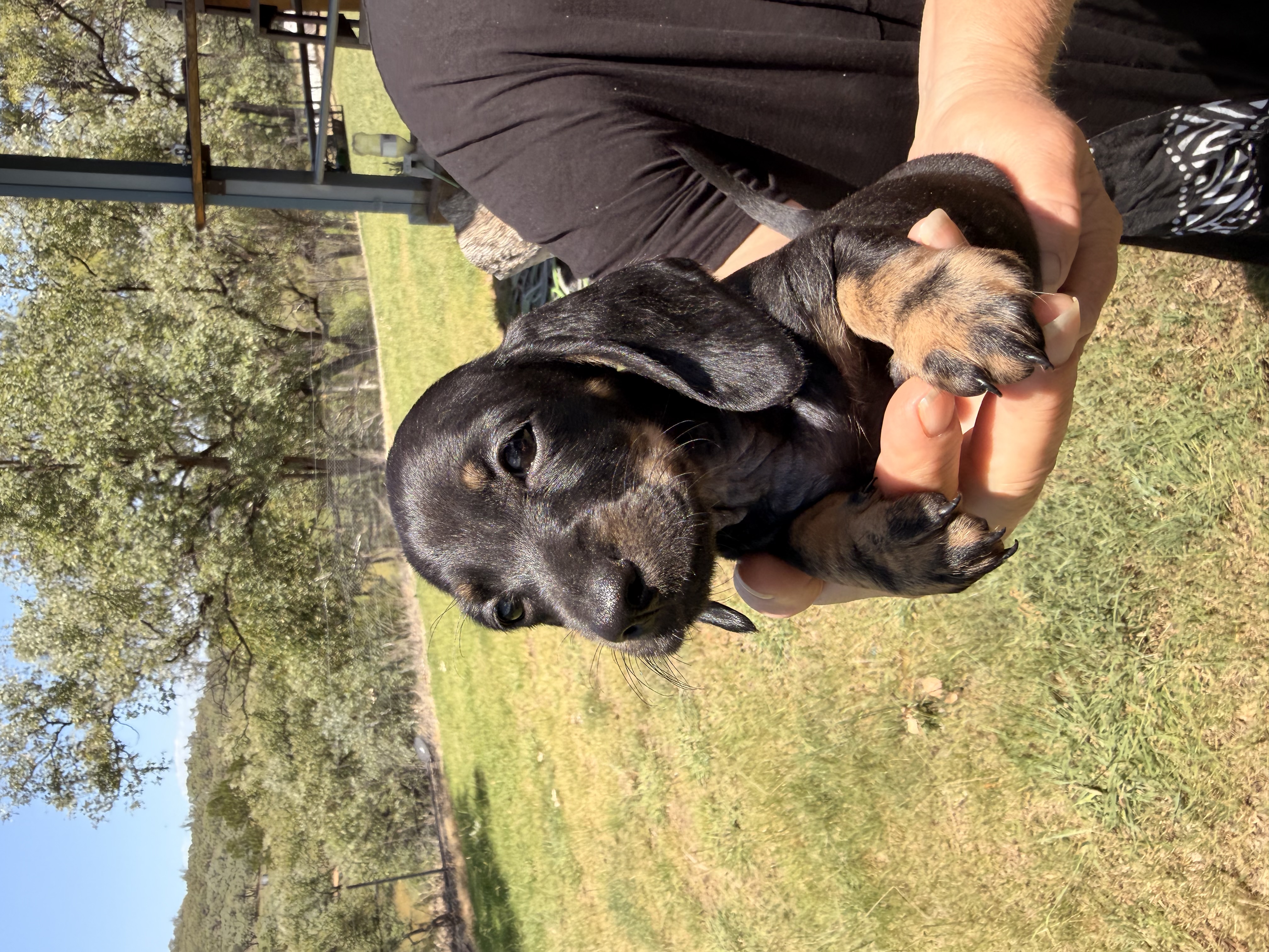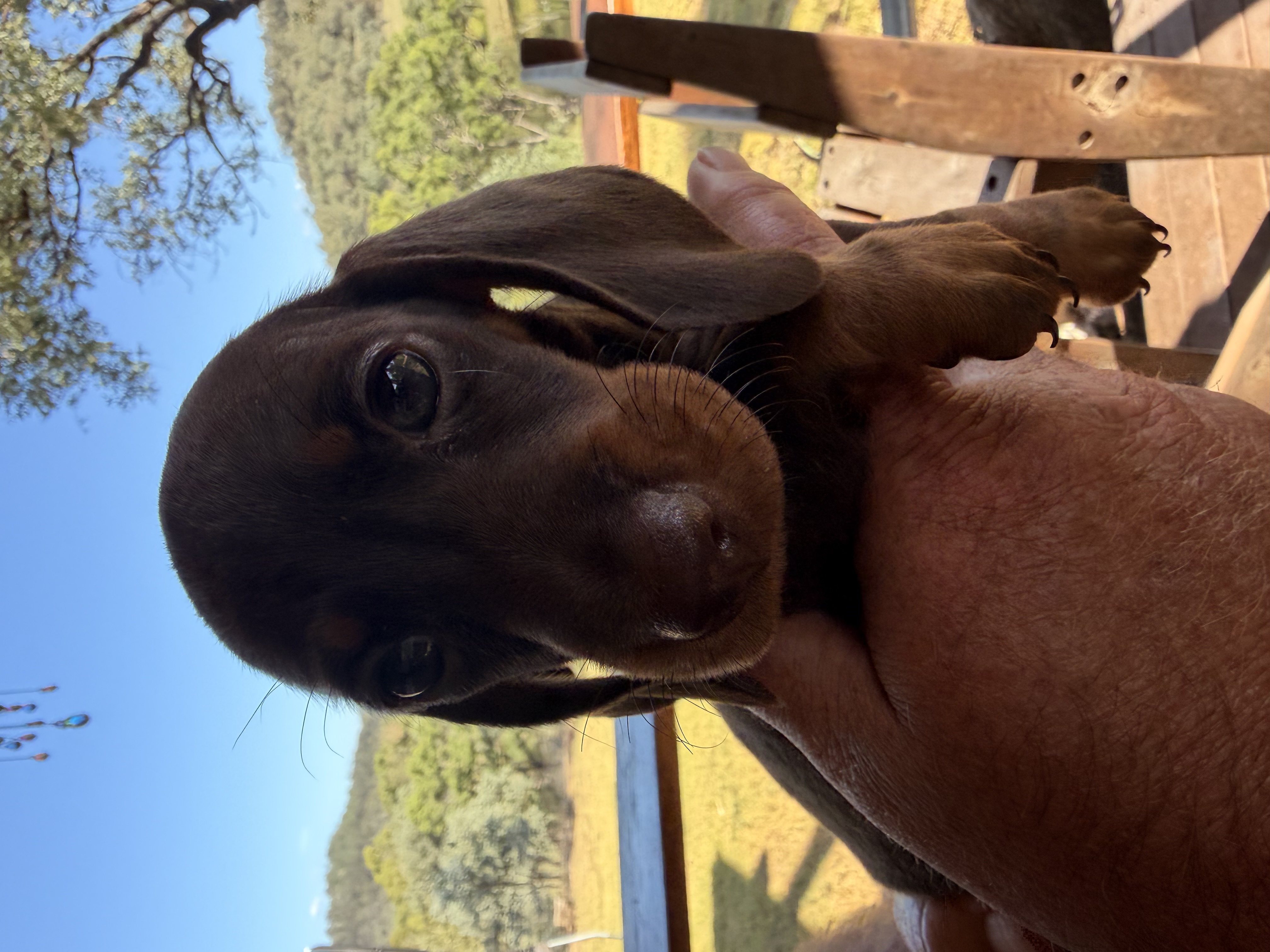 She is a beautiful 8-week-old chocolate and tan female, with short hair and a very sweet nature. Raised on our property and handled daily by children, she is well‑socialised, confident, and gentle. She gets along wonderfully with other animals and has a lovely temperament.
