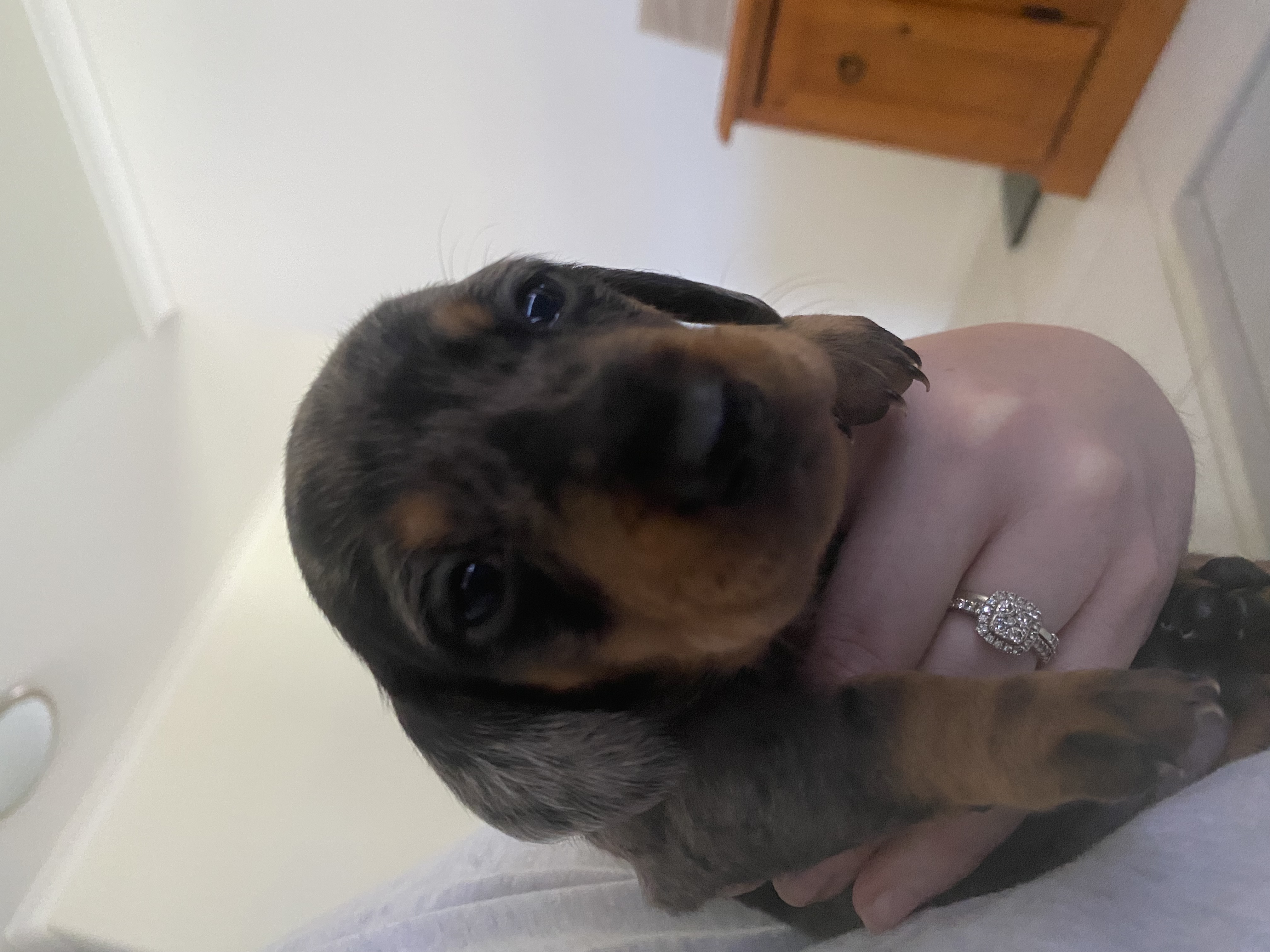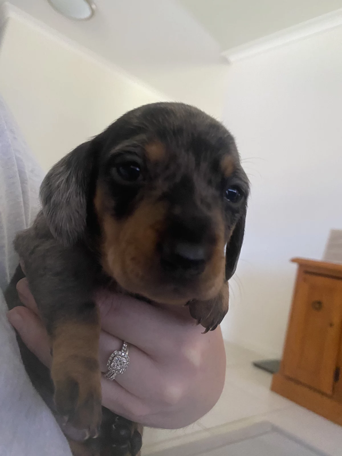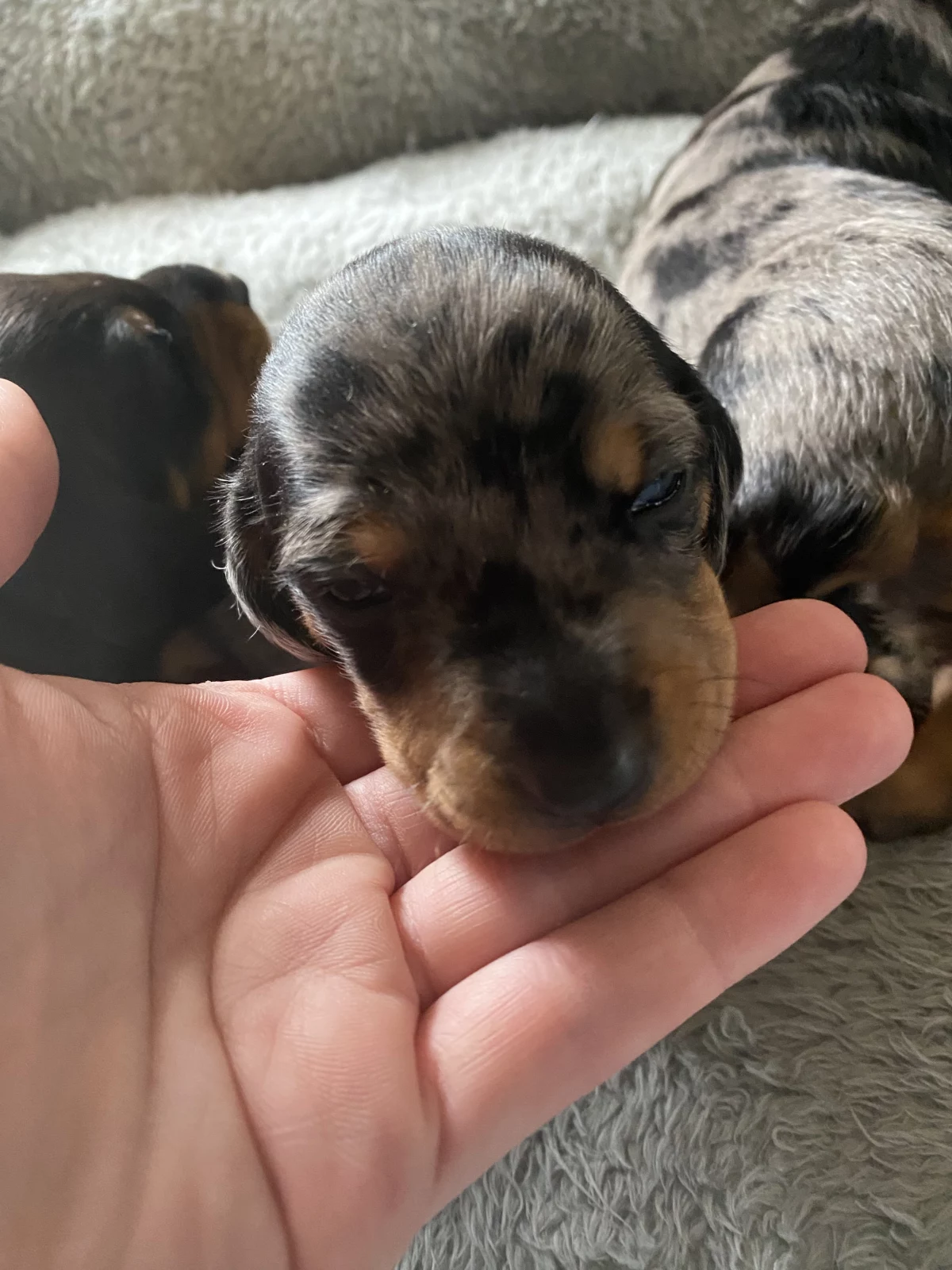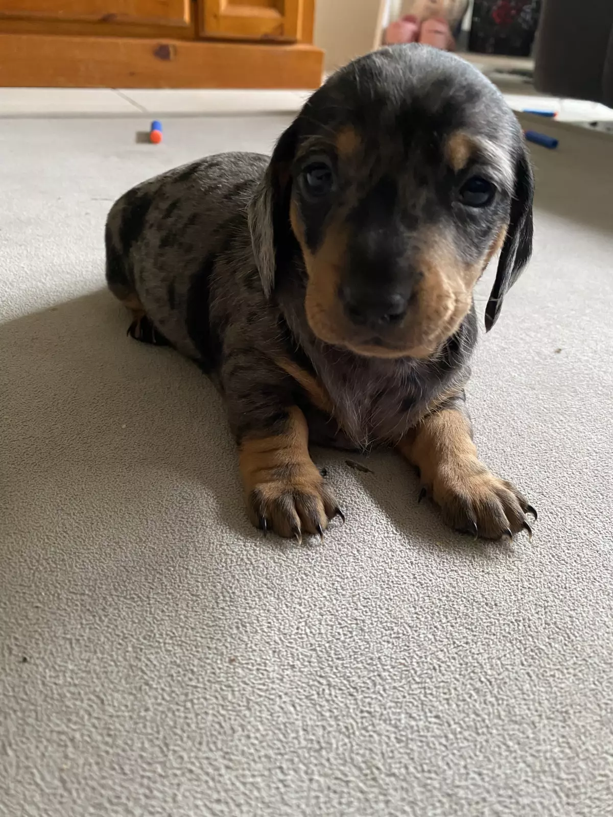 X1 male standard short haired dapple dachshund for sale. Ready to go Easter weekend to a new home! Will come with 1st lot of vax and microchipped. Puppies have just started toilet training. He may have dual coloured eyes (blue & brown) due to dad being a dapple with the two tone eyes. Eyes are still developing and changing from blue. Very playful and have been raised up until now around our children so would make a great family pet. Available to view. Located in Ballarat victoria $3500