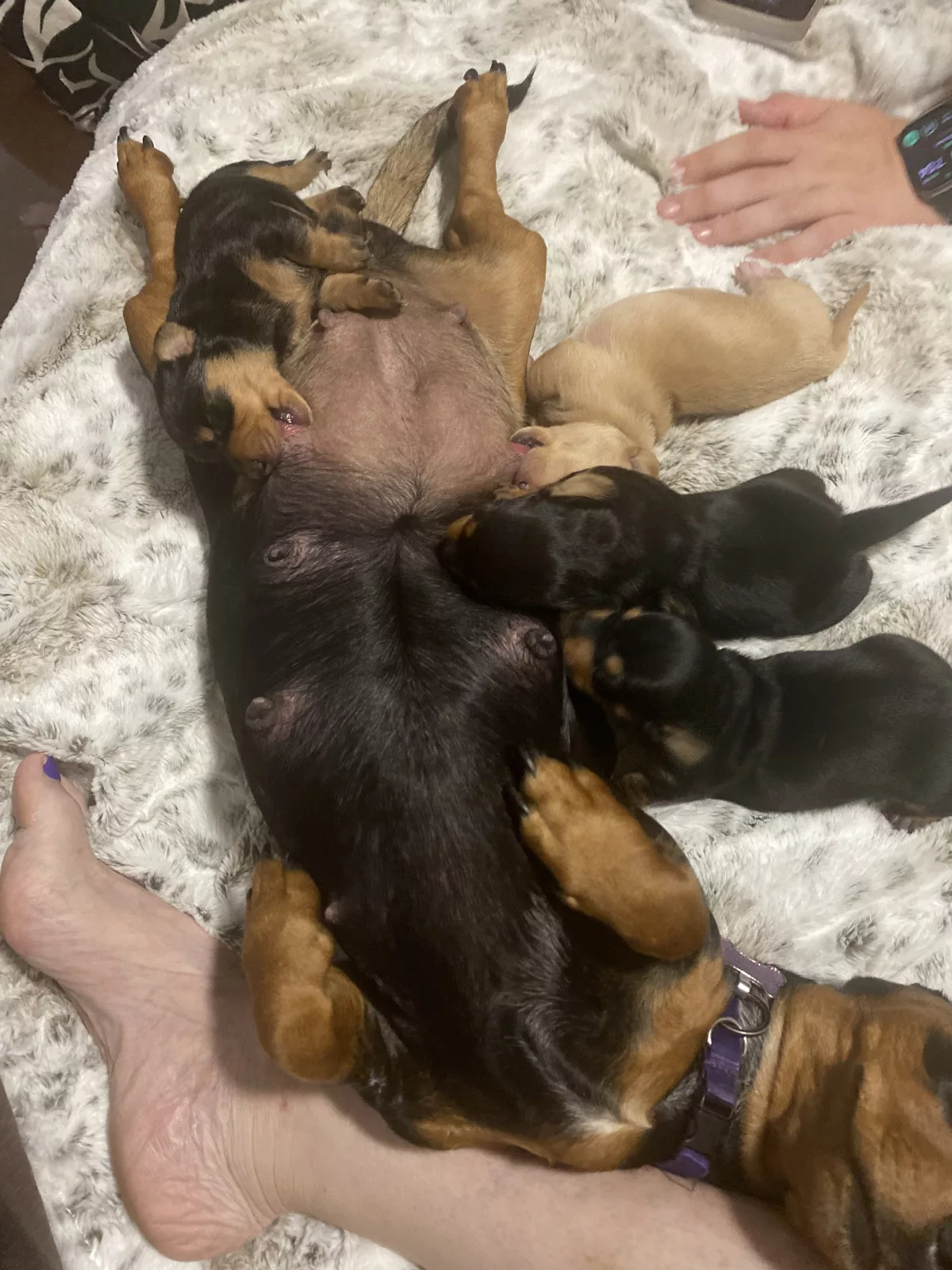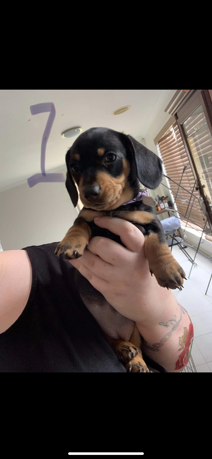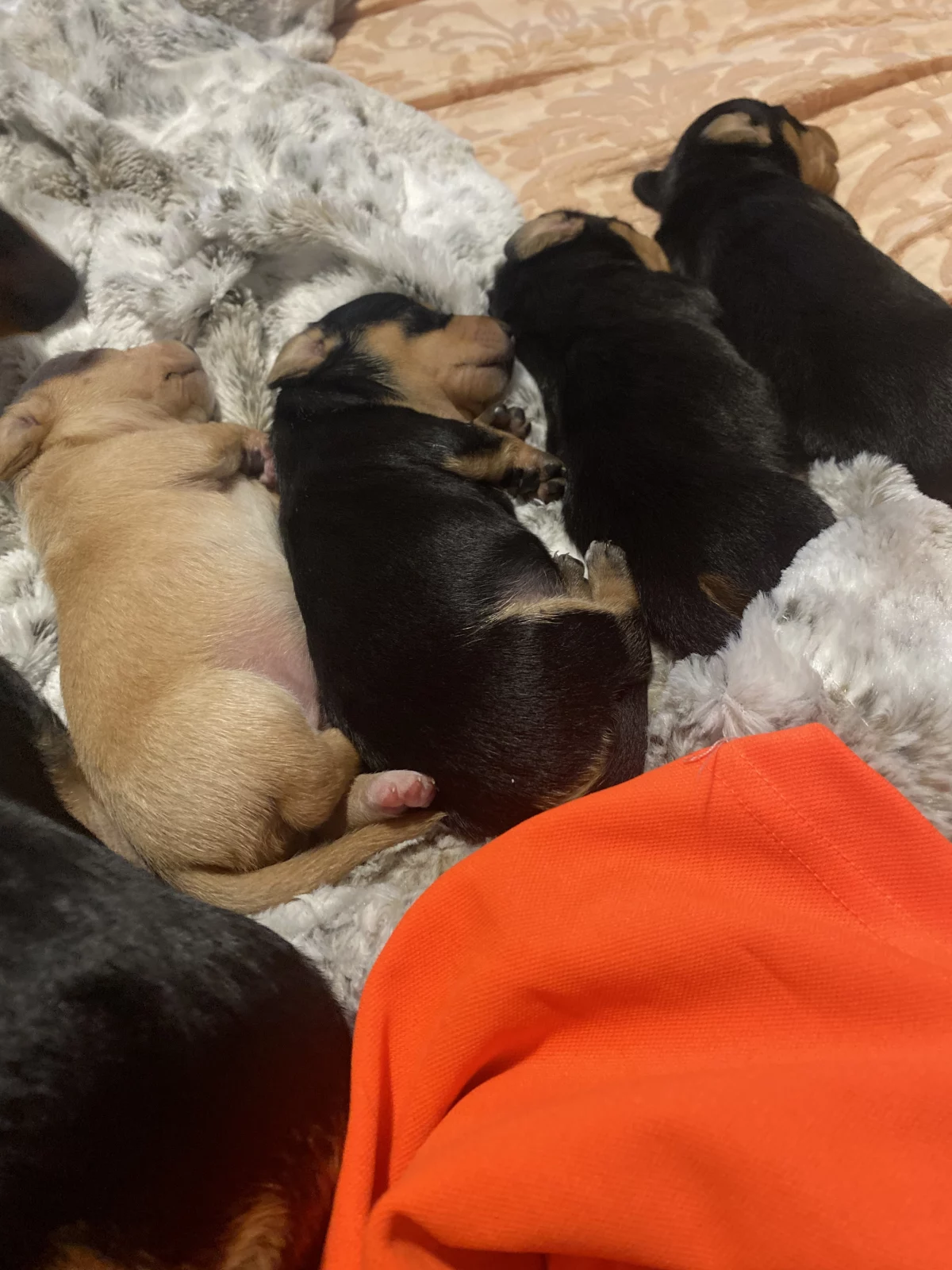 We have 3 black and tan smooth haired miniature Dachshunds available.
