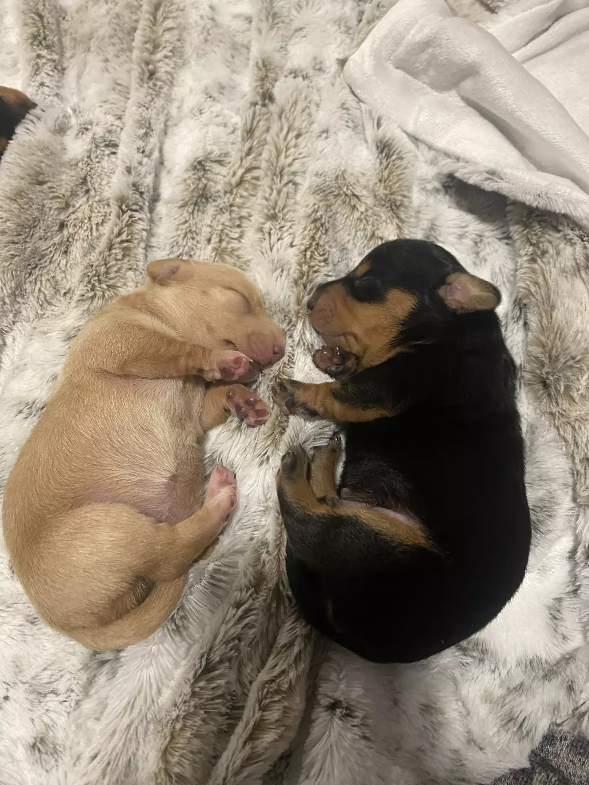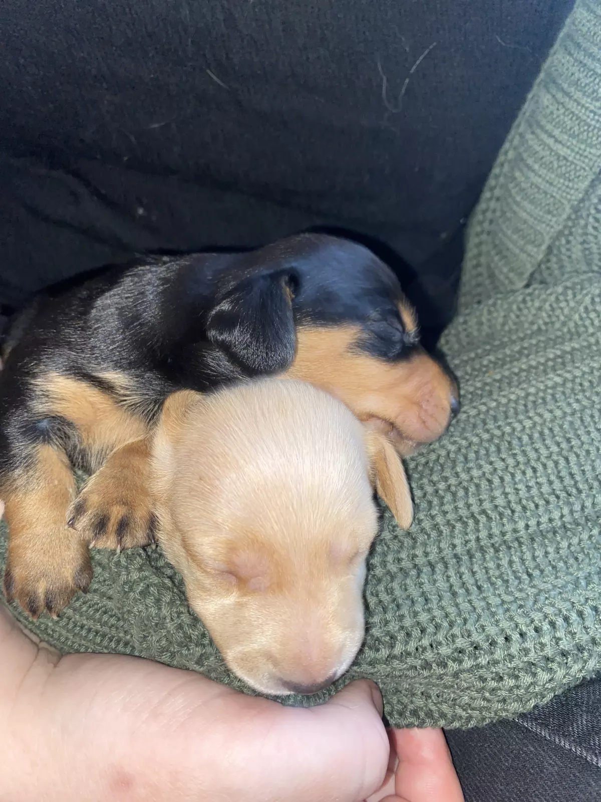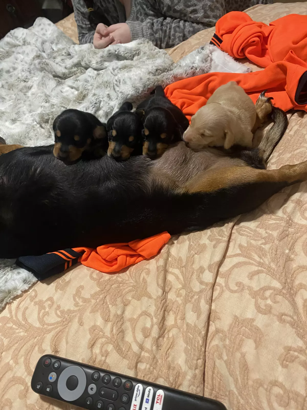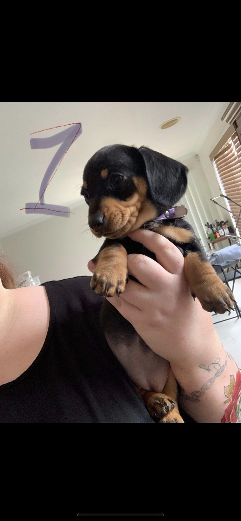 We have 3 black and tan smooth haired miniature Dachshunds available.
