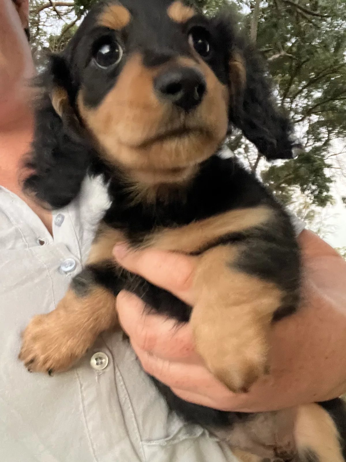 One female long hair mini Dachshund for sale. This little girl has been lovingly raised on a farm with other dogs and cats, and has been well handled by both adults and children.