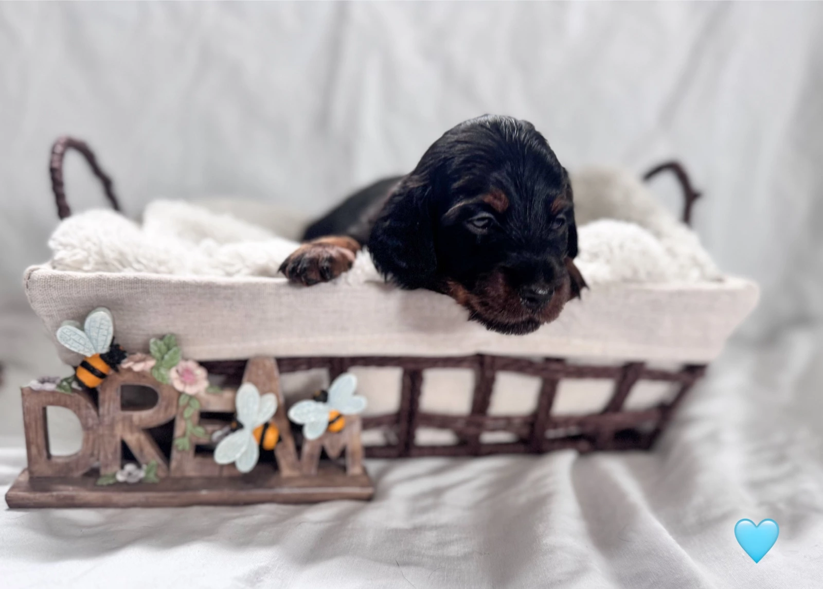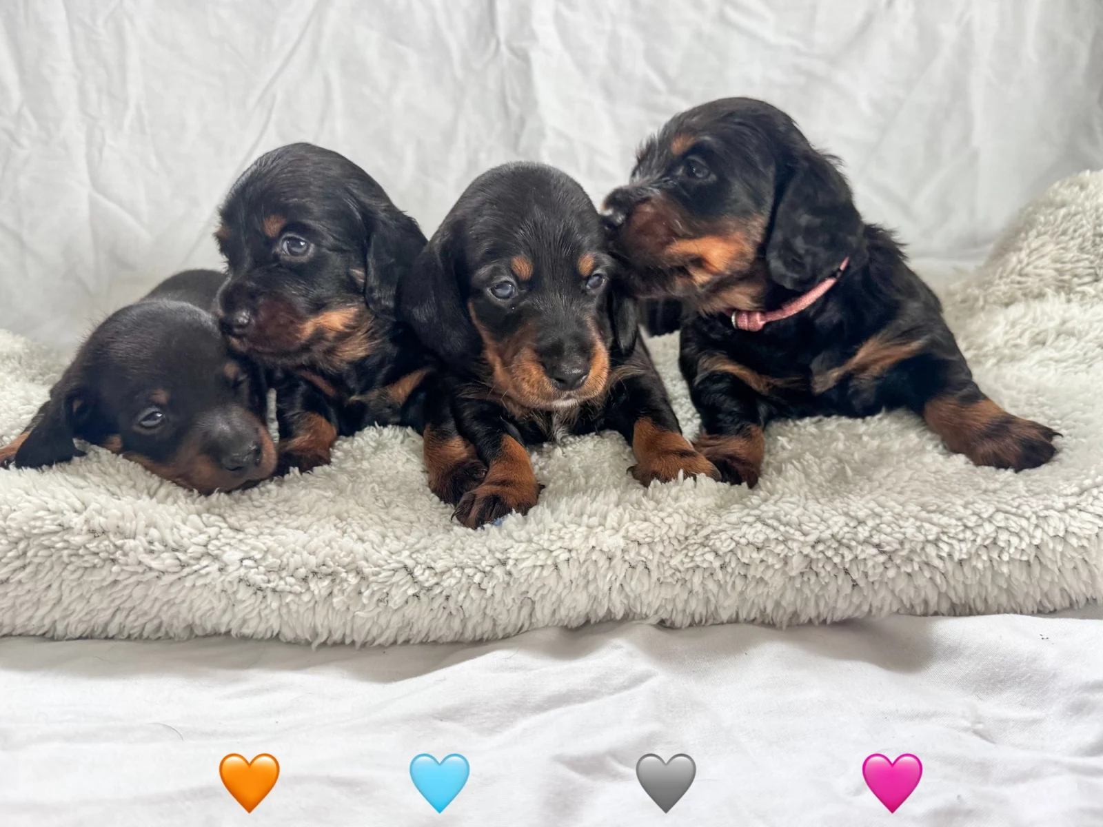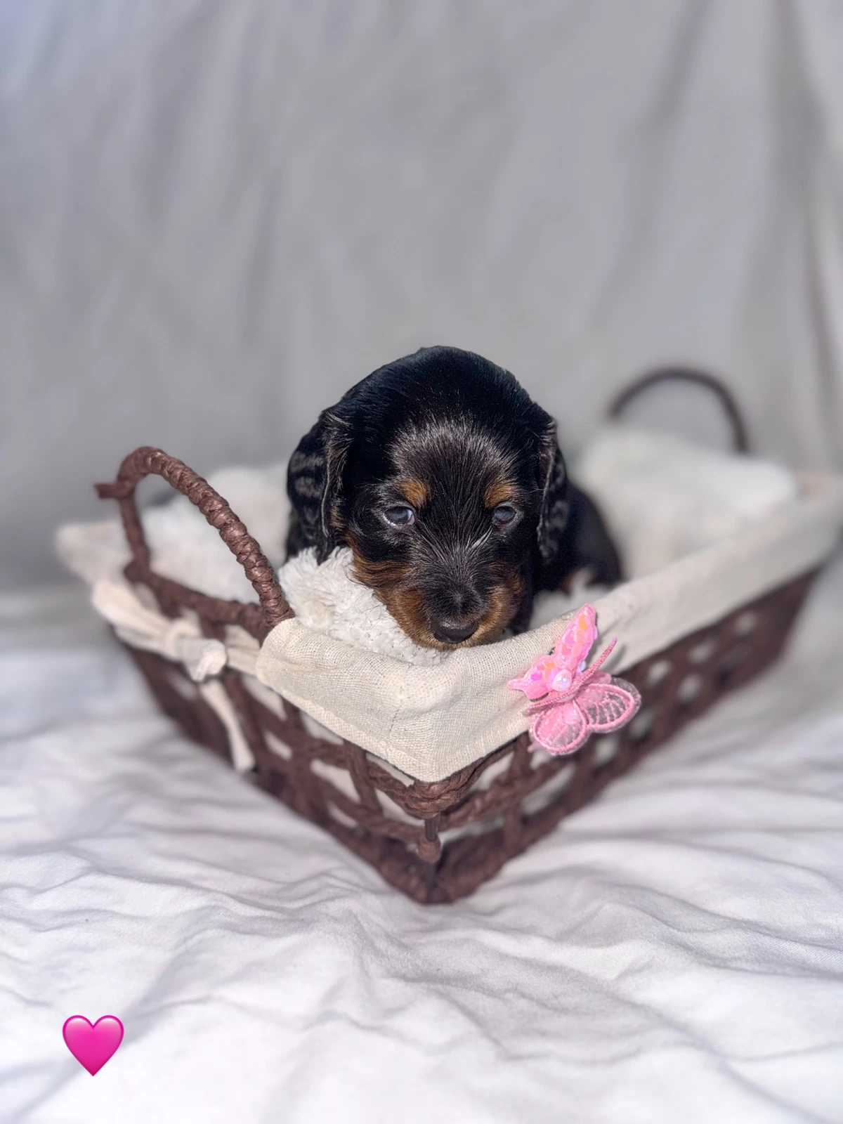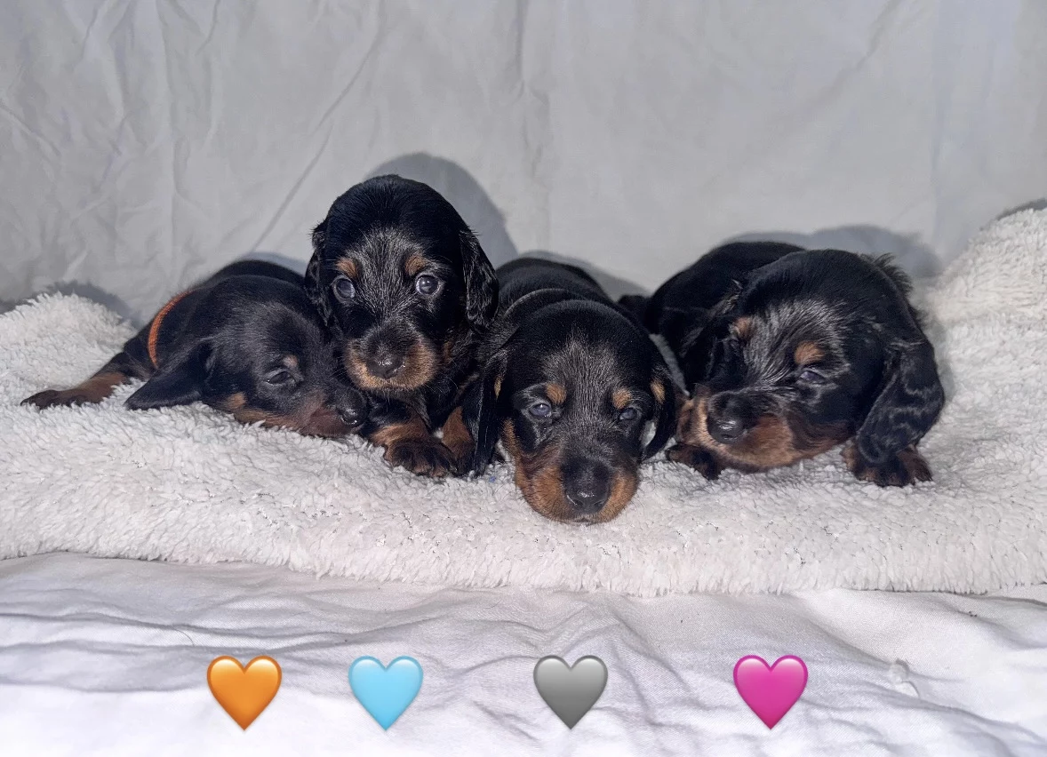 We have two boys & 1 girl available, born on the 27th of Feb 2025 (will be ready at the end of April/early May for their fur-ever homes). Mum (Honey) is a long haired black & tan miniature & Dad (Cash) is a short haired Black & tan small standard.