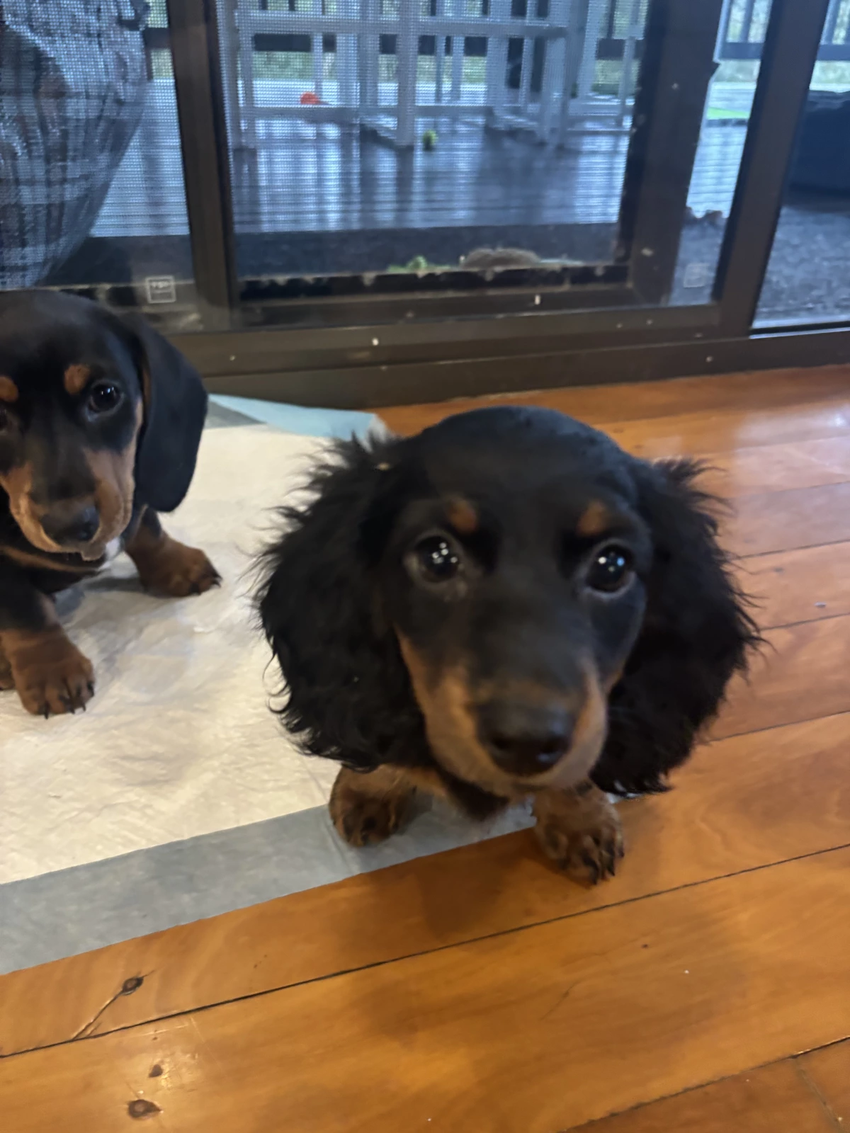 Both parents are mini dachshunds. The dad is a tan long haired Dachshund and the mum is tan and smooth haired