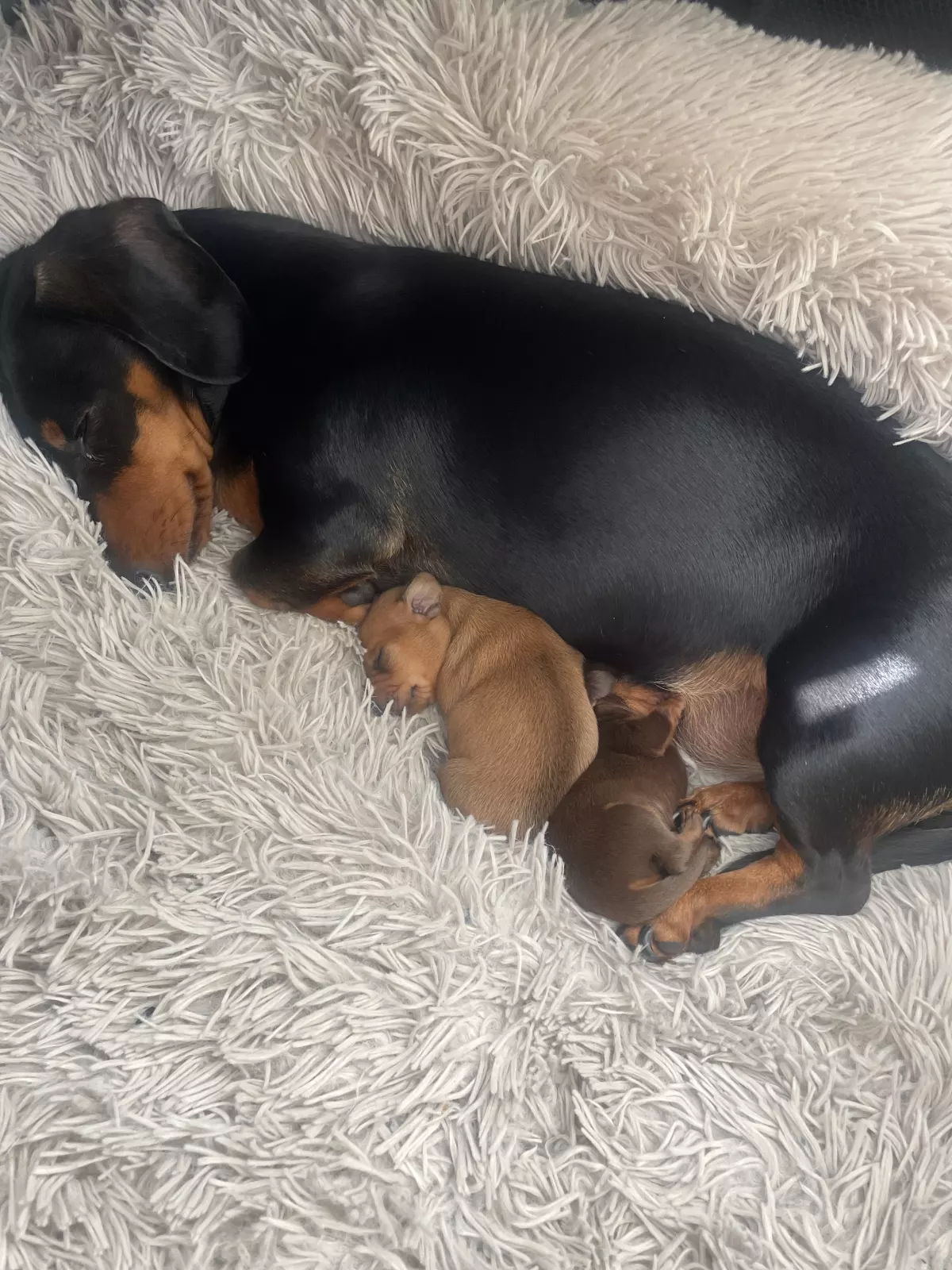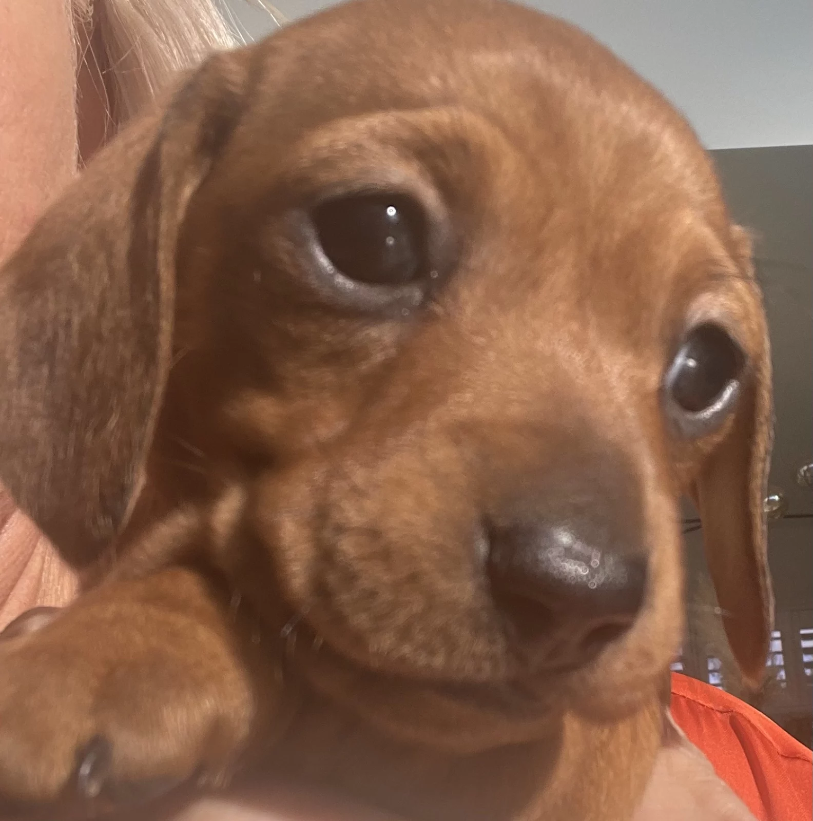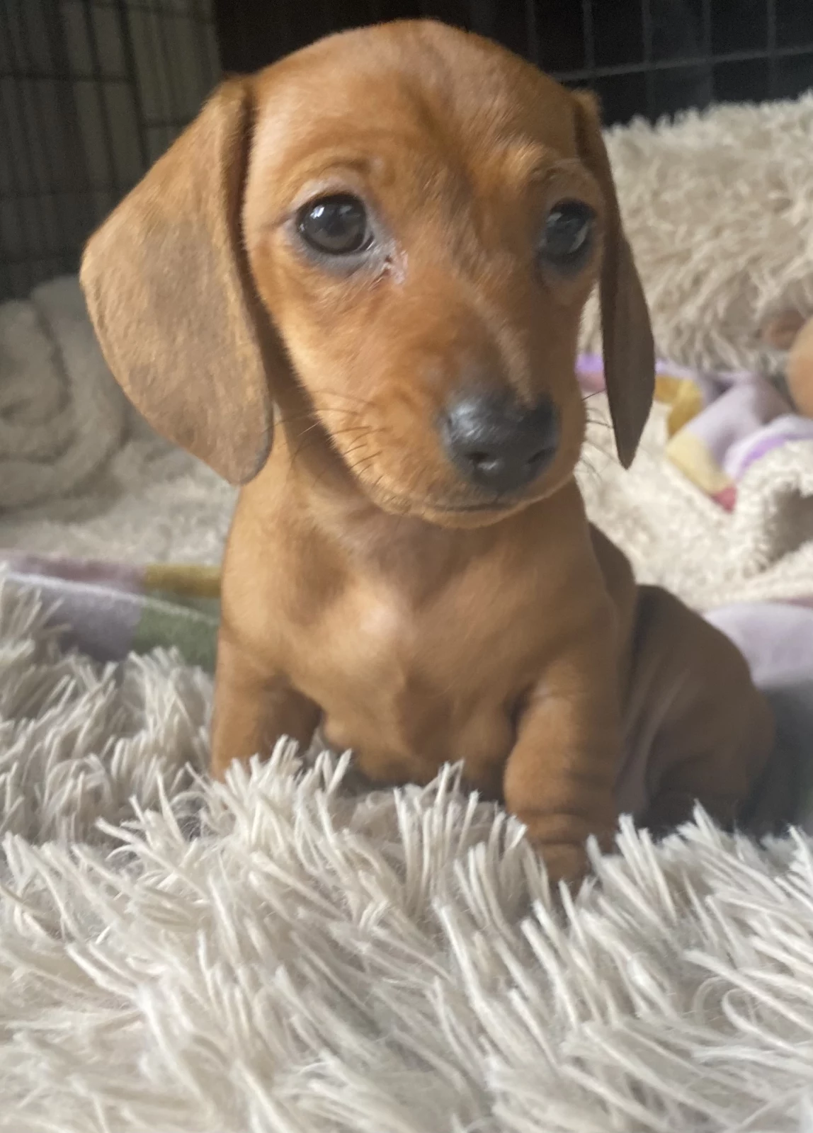 This beautiful little girl is a purebred miniature dachshund, tan in colour, and one of only two pups in her litter.