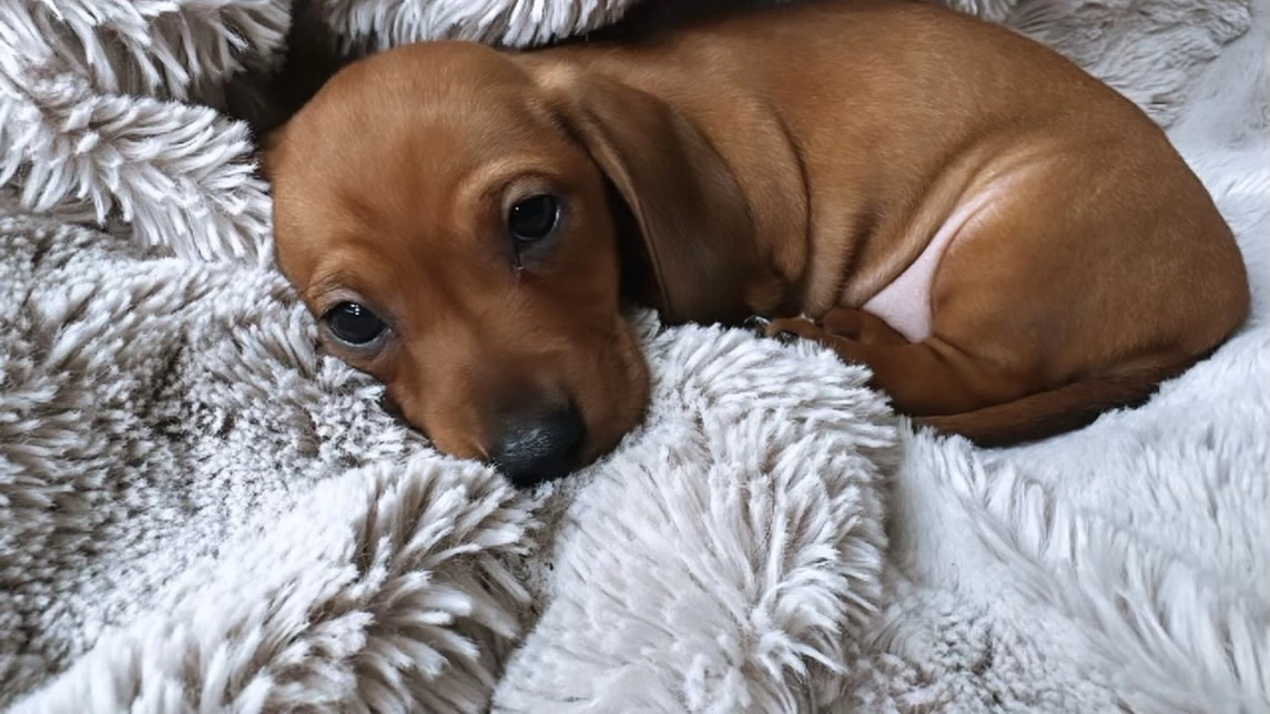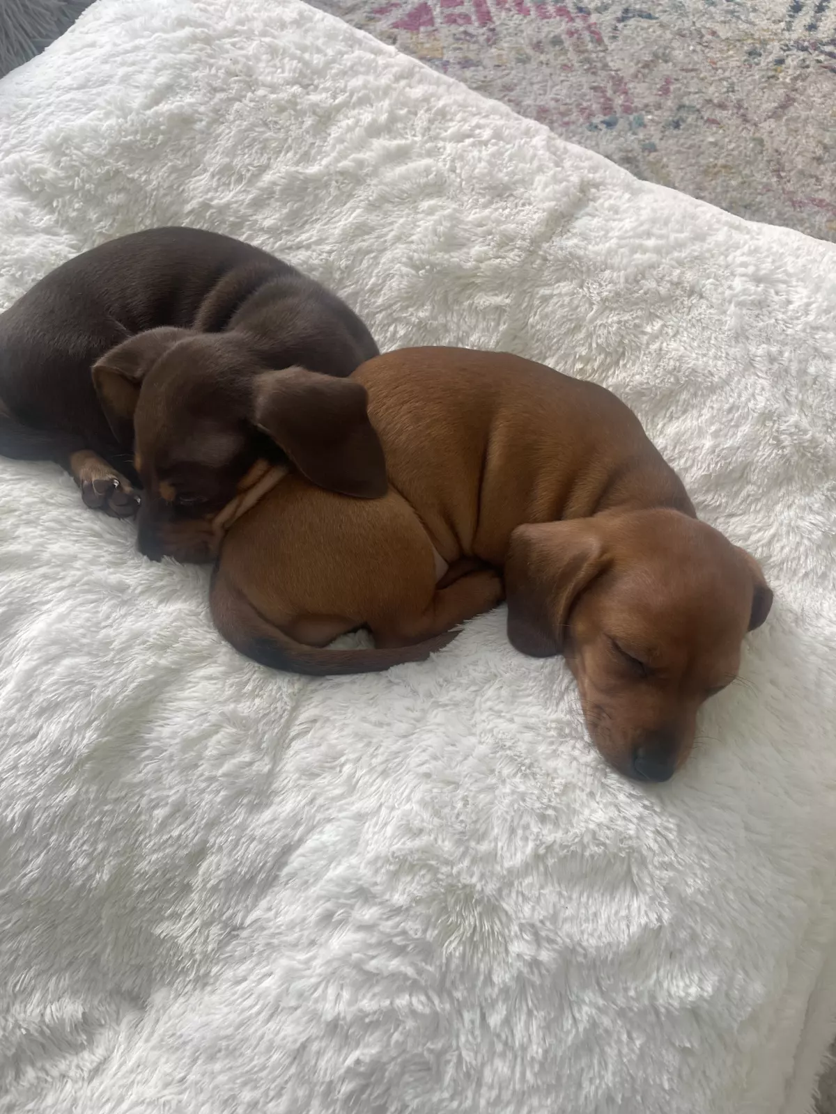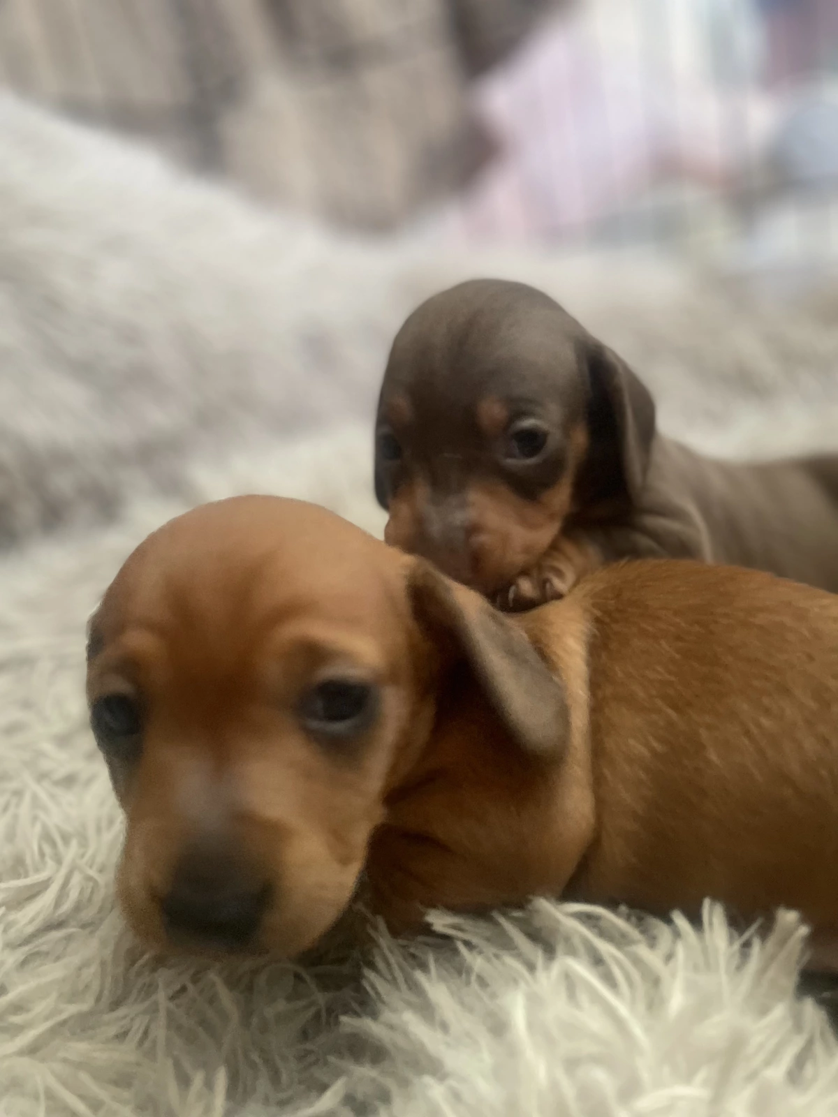 This beautiful little girl is a purebred miniature dachshund, tan in colour, and one of only two pups in her litter.