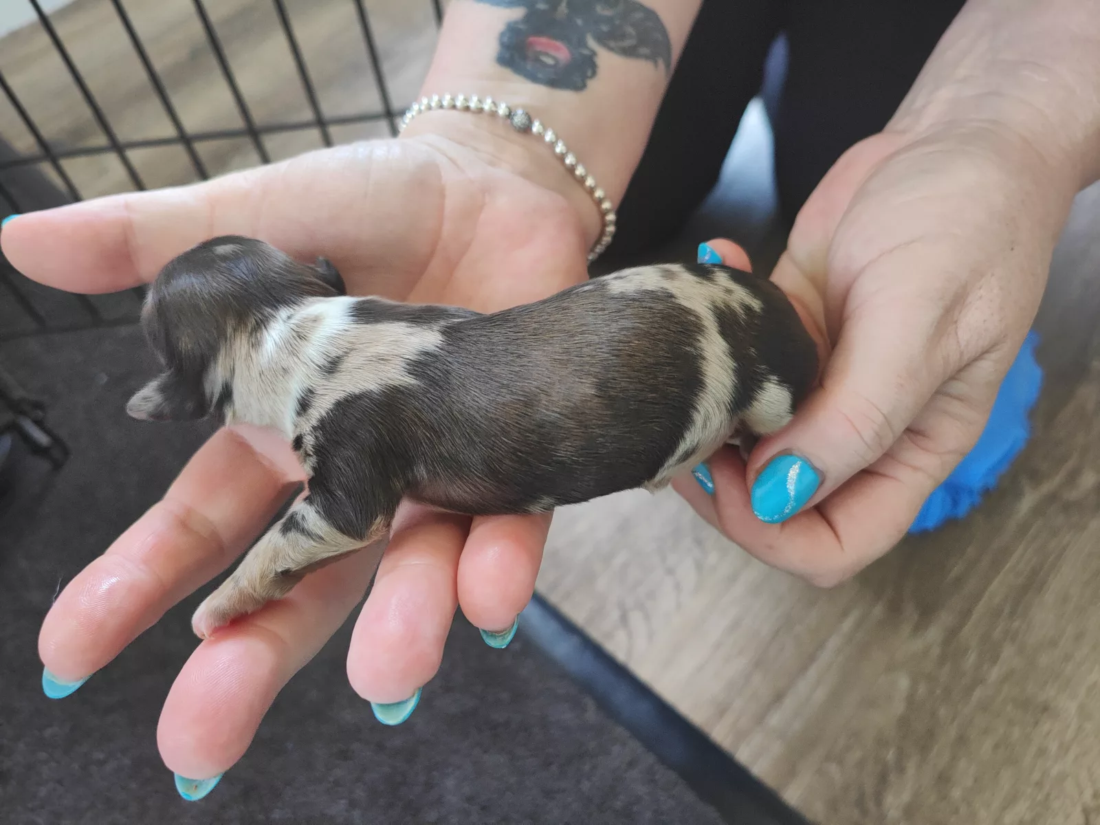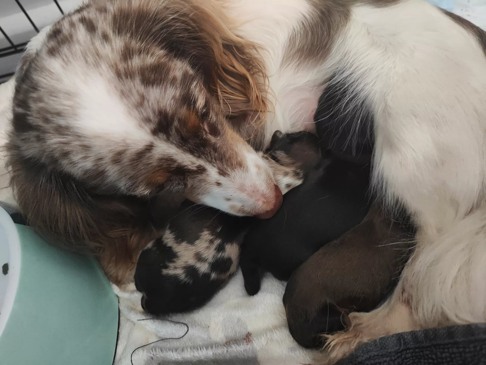 The mum is a purebred white/tan and cream piebald dapple and the dad is a purebred long haired english cream Dachshund.