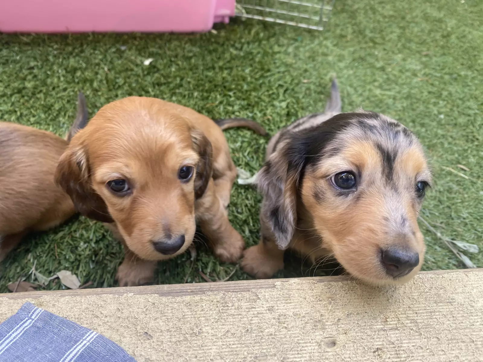 “This litter is from Rocky and Sandy — both gorgeous, healthy, loving dogs with calm, affectionate temperaments. We’ve been breeding high-quality dachshunds for over 10 years, focusing on temperament, health and true breed type, not just looks.”