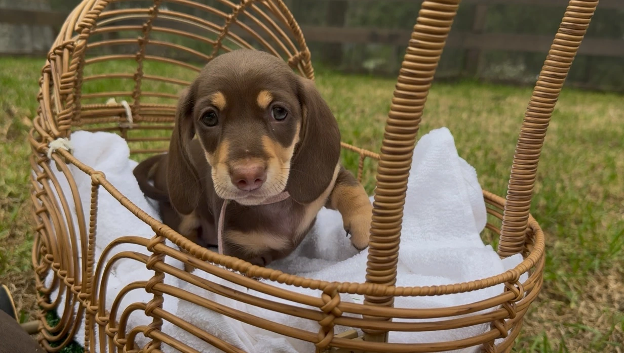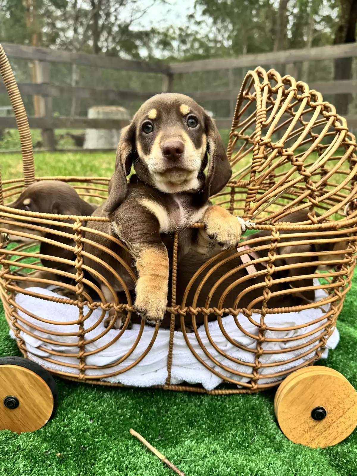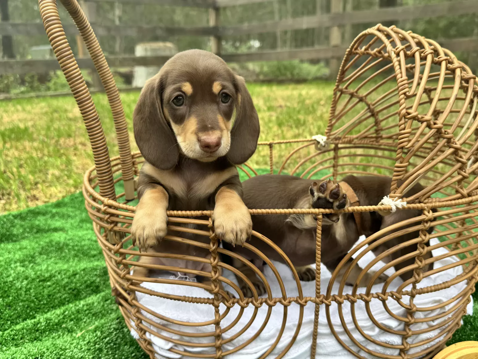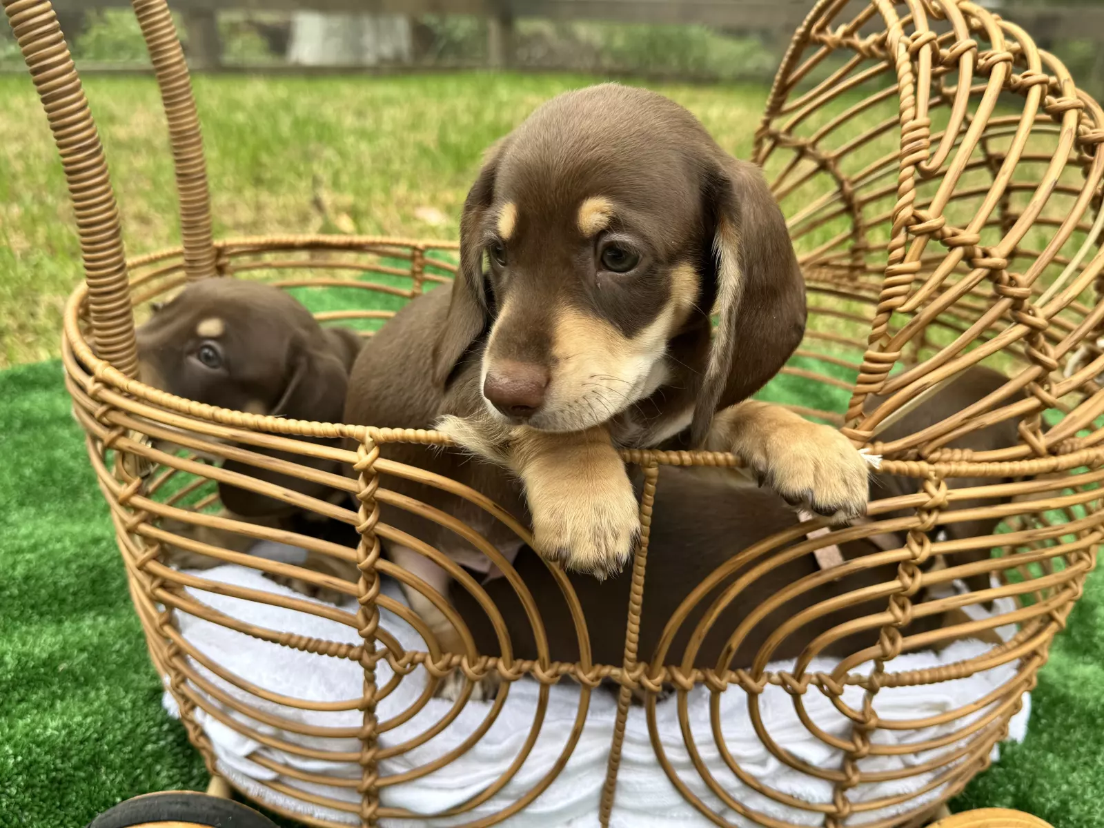 We have 5 adorable chocolate and cream mini dachshunds available.