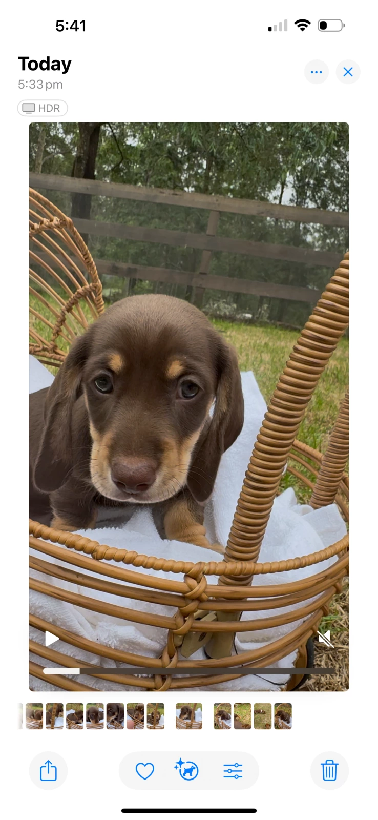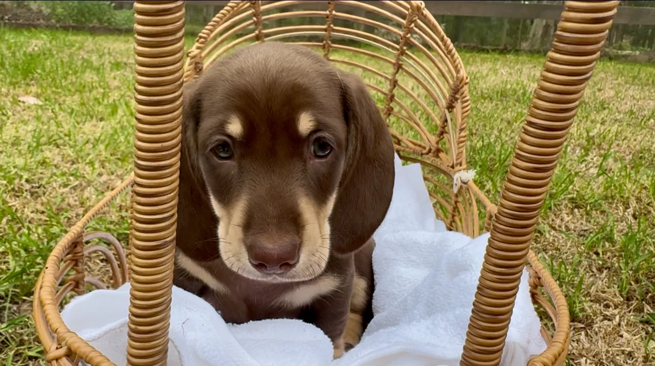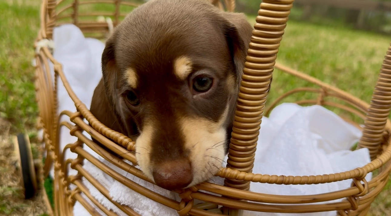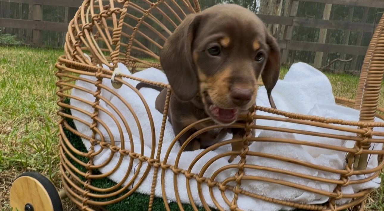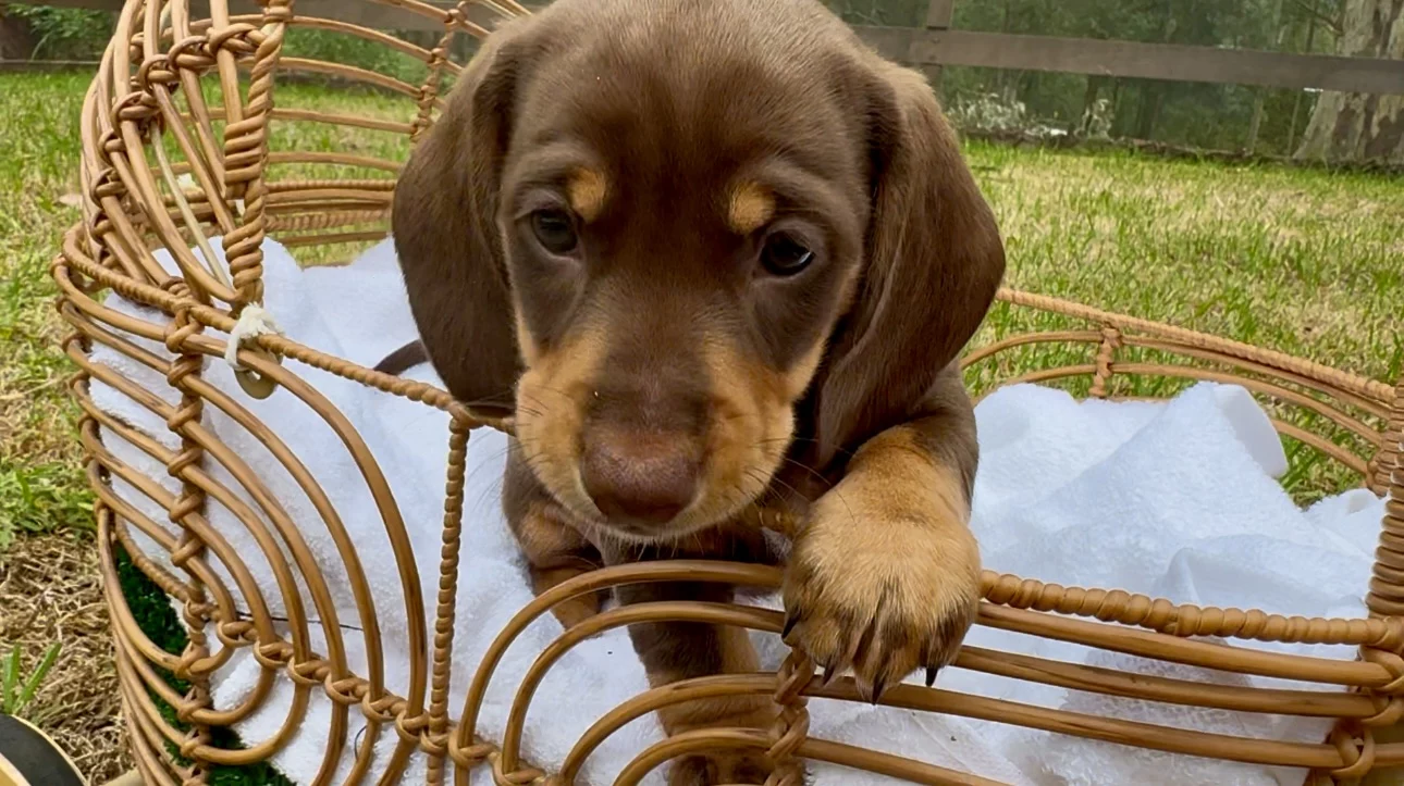 We have 5 adorable chocolate and cream mini dachshunds available.