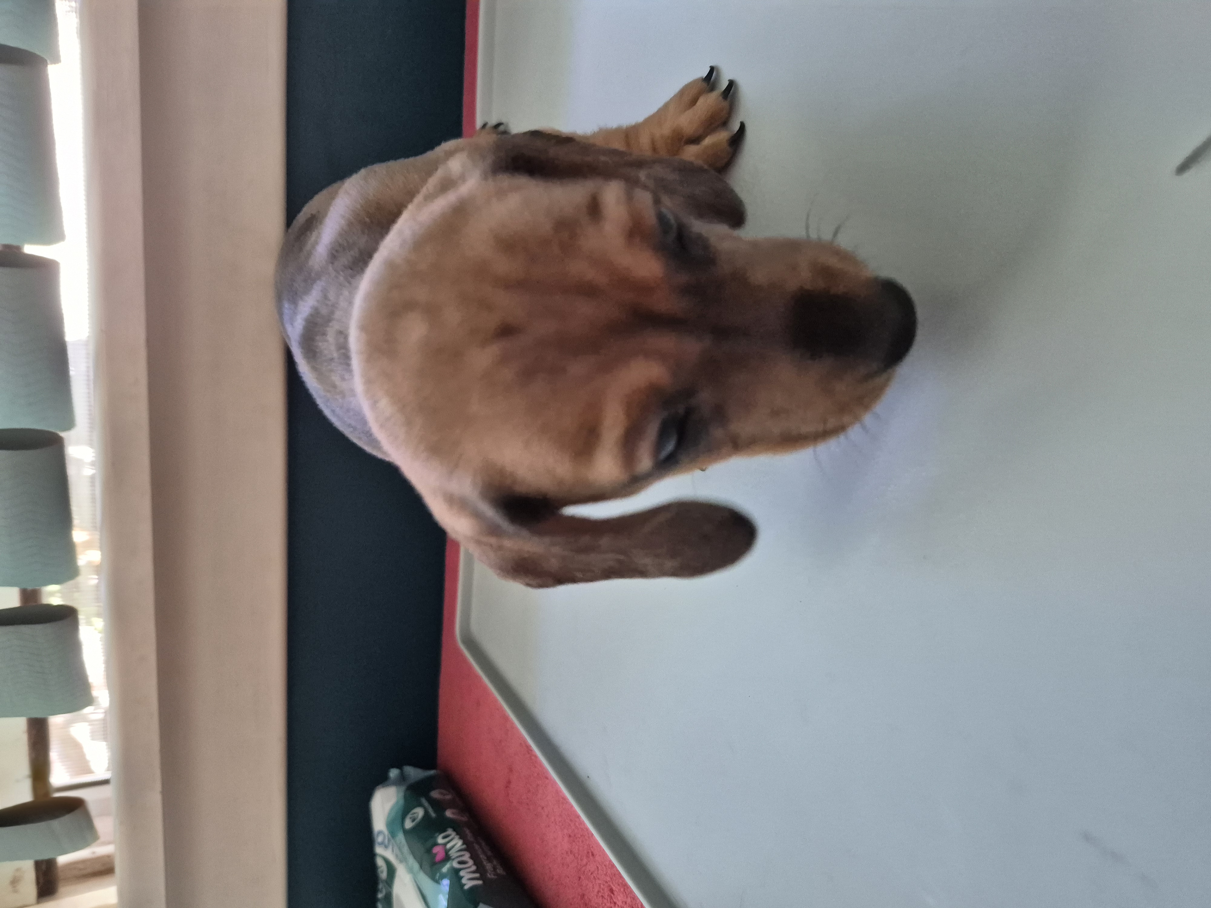 Loads of energy and a big personality. Loves cuddles and climbing dog steps and laying on the lounge.