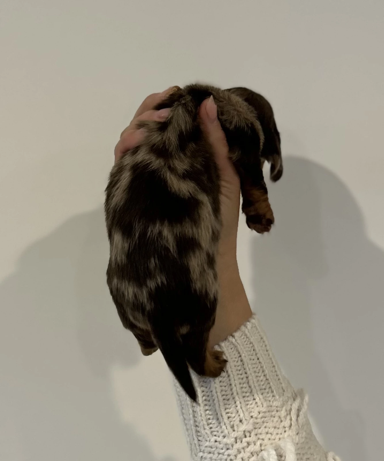 The dad is tan long haired Dachshund.