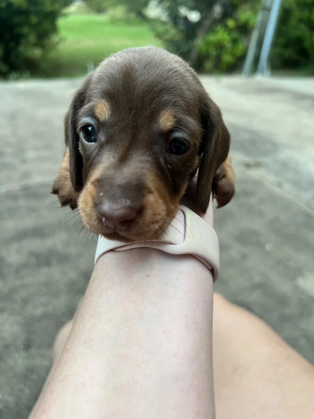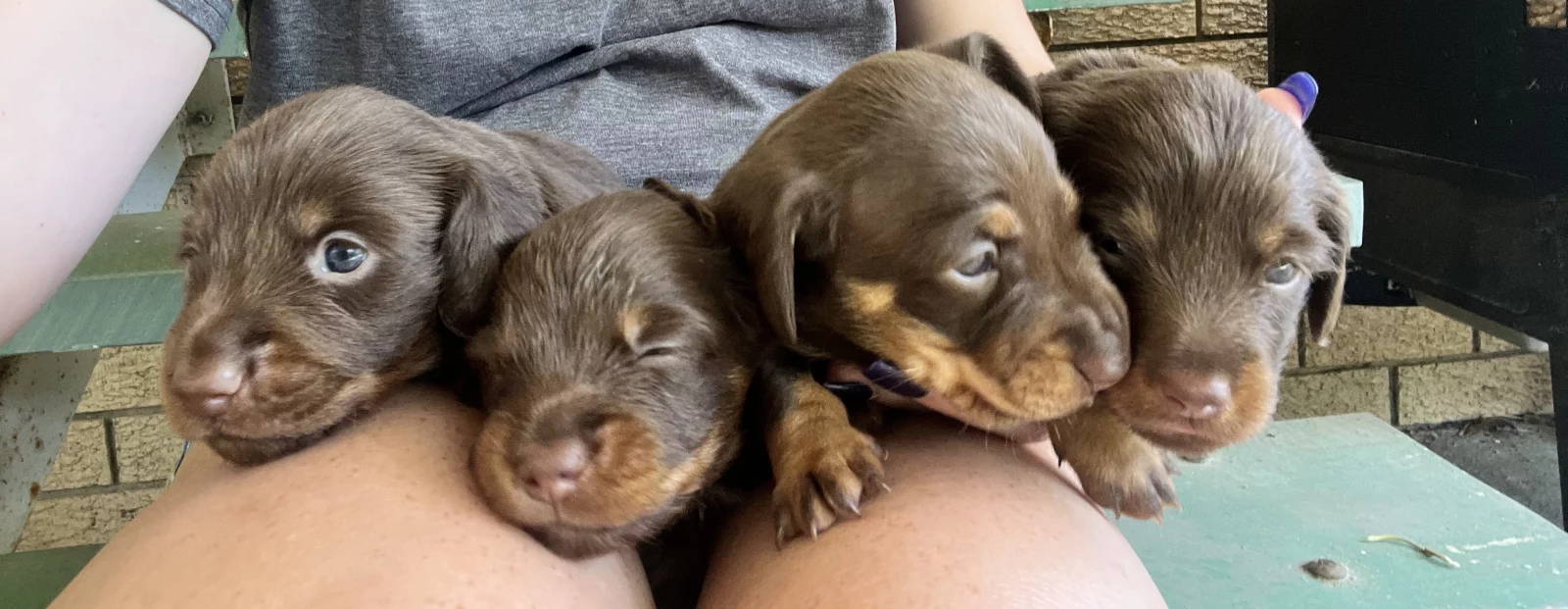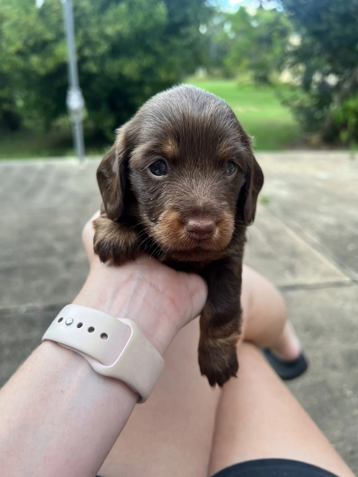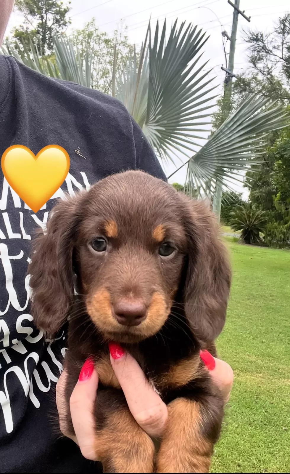 2 beautiful Chocolate and Tan dachshund puppies born 28/1/25. 1 long haired girl and 1 short haired girl. Will come vet checked and microchipped plus wormed every 2 weeks. Ready for their new homes now.