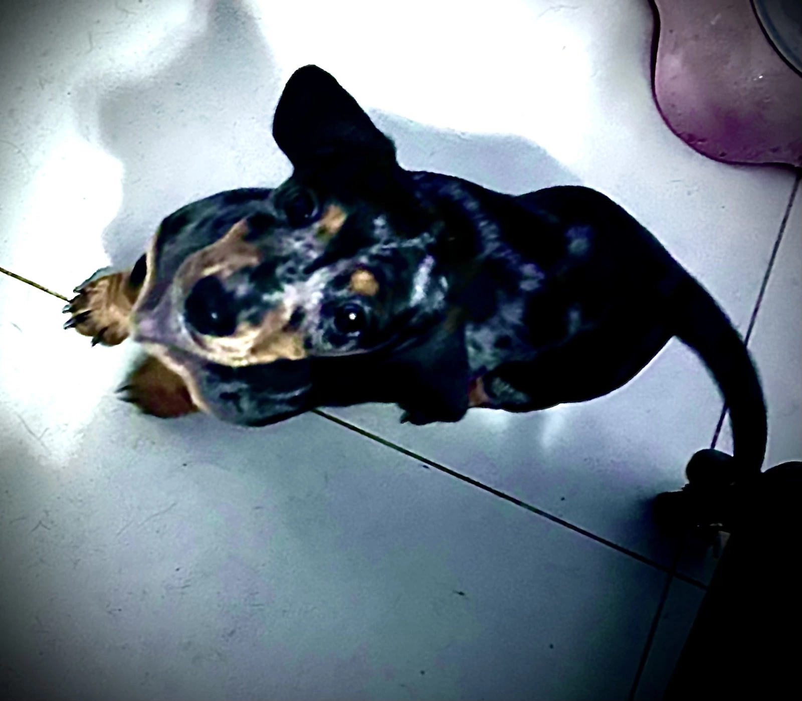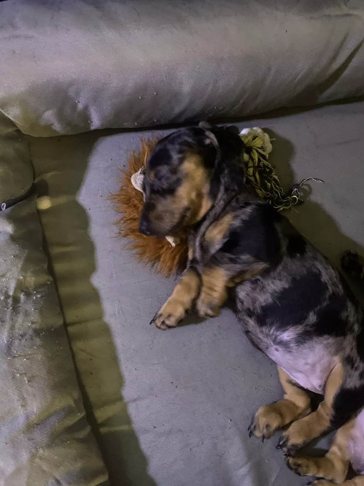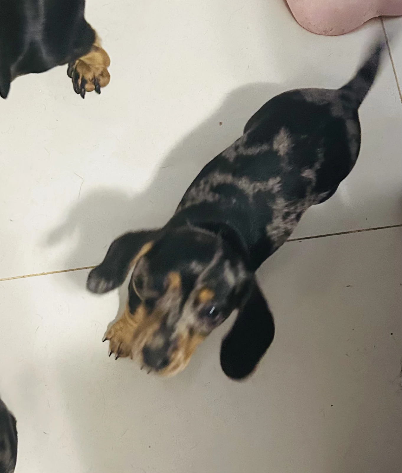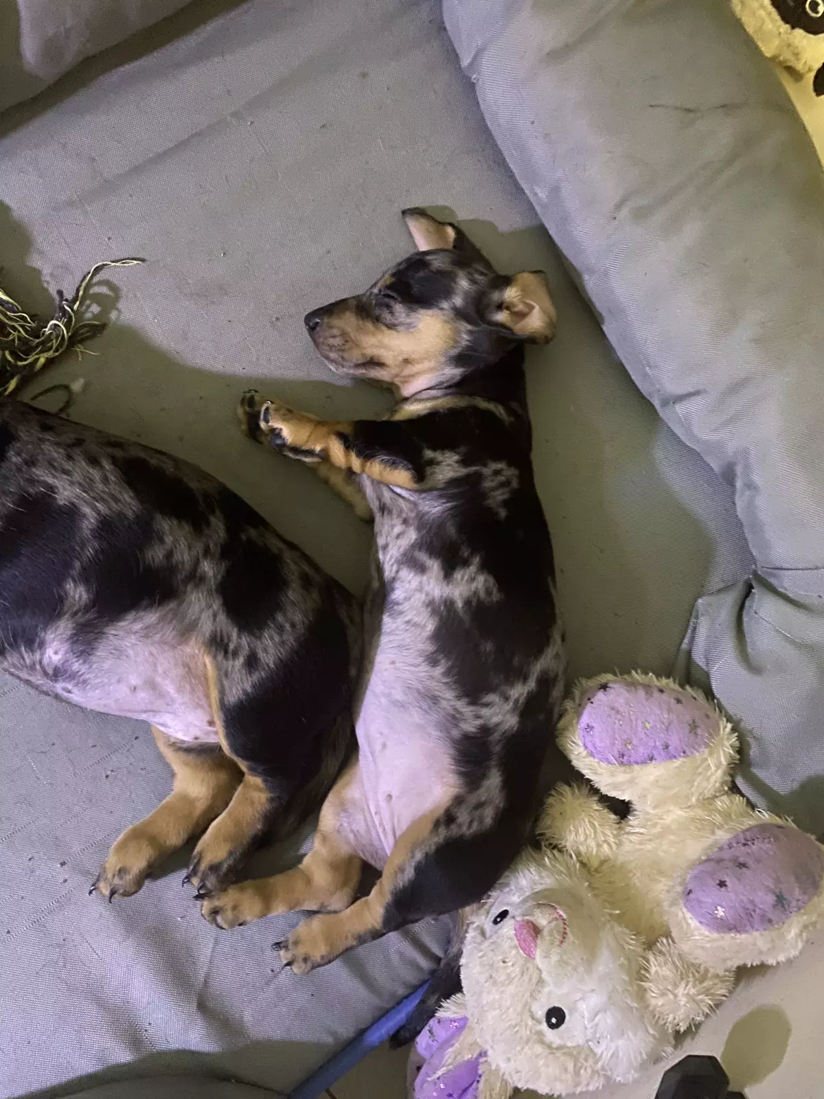 Both girls have been raised around kids and are from a much loved home, raised indoors, with human grade food. Our babies are treated like family and we are always available to give care advice and behaviour advice after you take your baby home. They have been sleeping separately from their mum now for 2 weeks. They are twin girls although 2 different sizes one will grow to be a large mini my approximation of weight will be 5kg like her dad the other girl is very fine like her mother and my approx weight will be 3.5kg grown. Parents have been DNA Tested for disease and Purebred. Mum is chocolate and tan carrying pied and longhair genes, dad is pied carrying dapple and shorthair genes.
