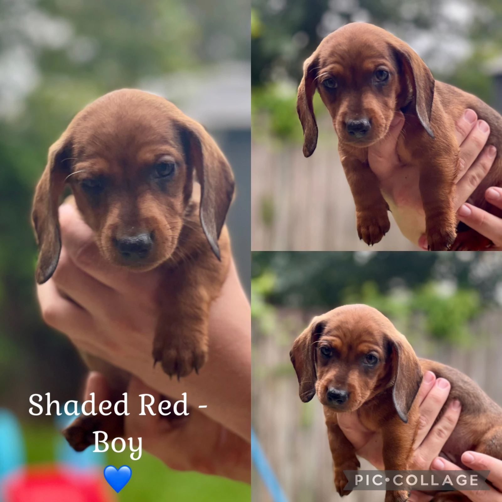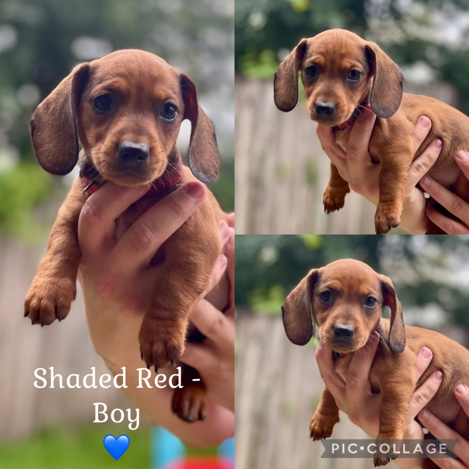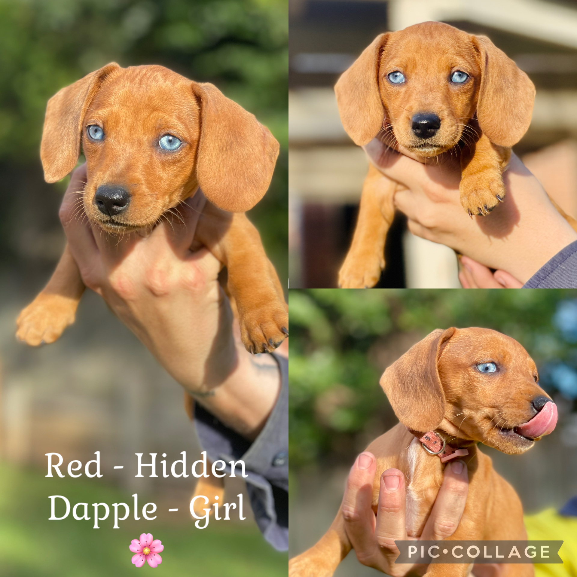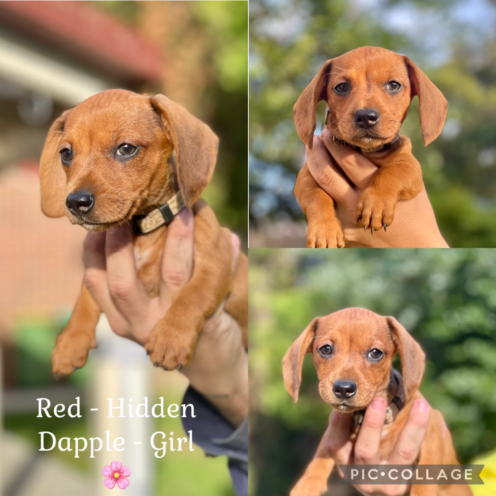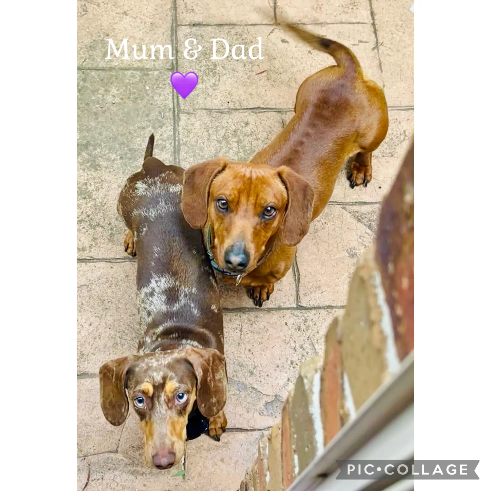Mum, Willow, is a chocolate & silver dapple Miniature Dachshund. Dad, Frank, is a shaded red Miniature Dachshund.