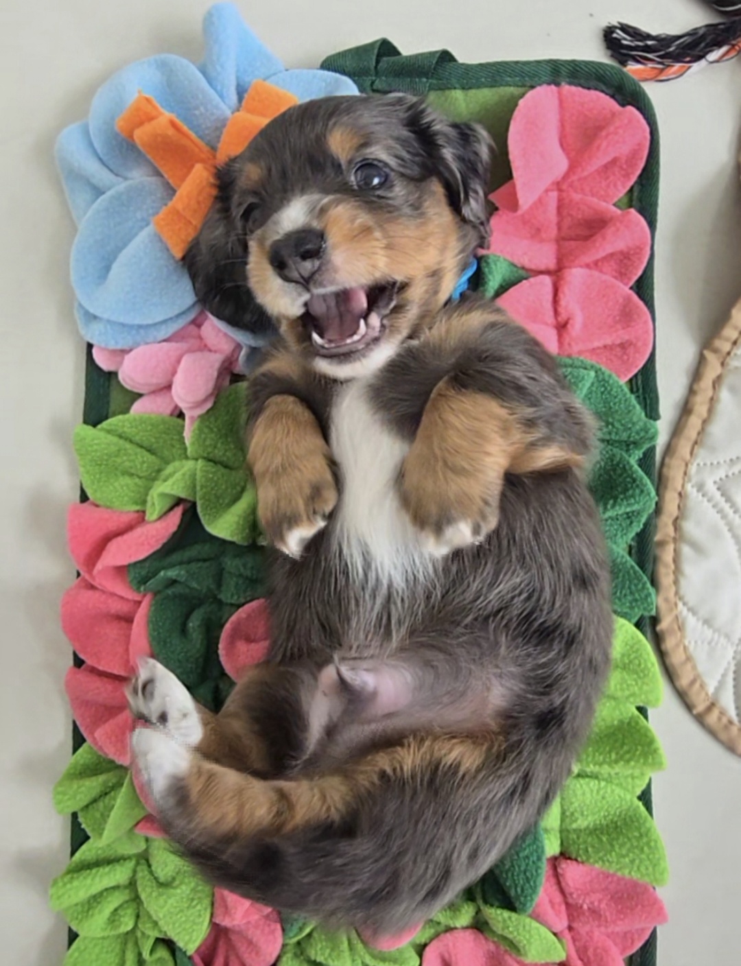 To ease the transition for “Mark” into his new home and family, prospective buyers are invited for puppy play dates and encouraged to supply an item (such as a blanket or toy) that smells like their new environment and pawrents, once a deposit has been paid.