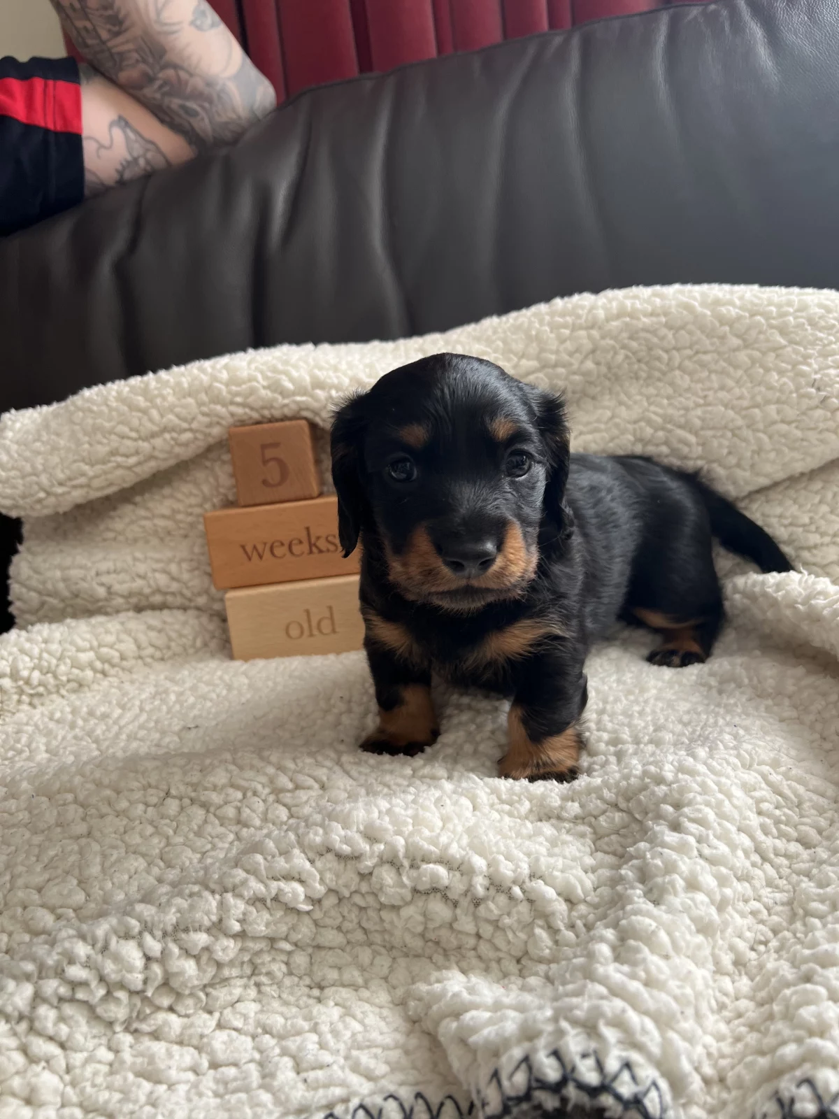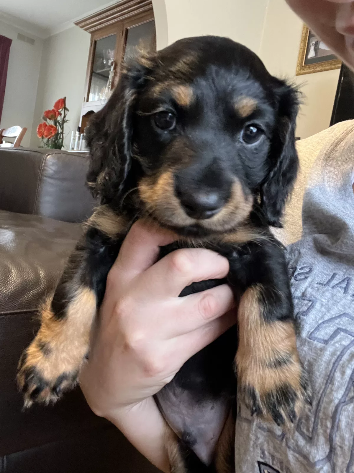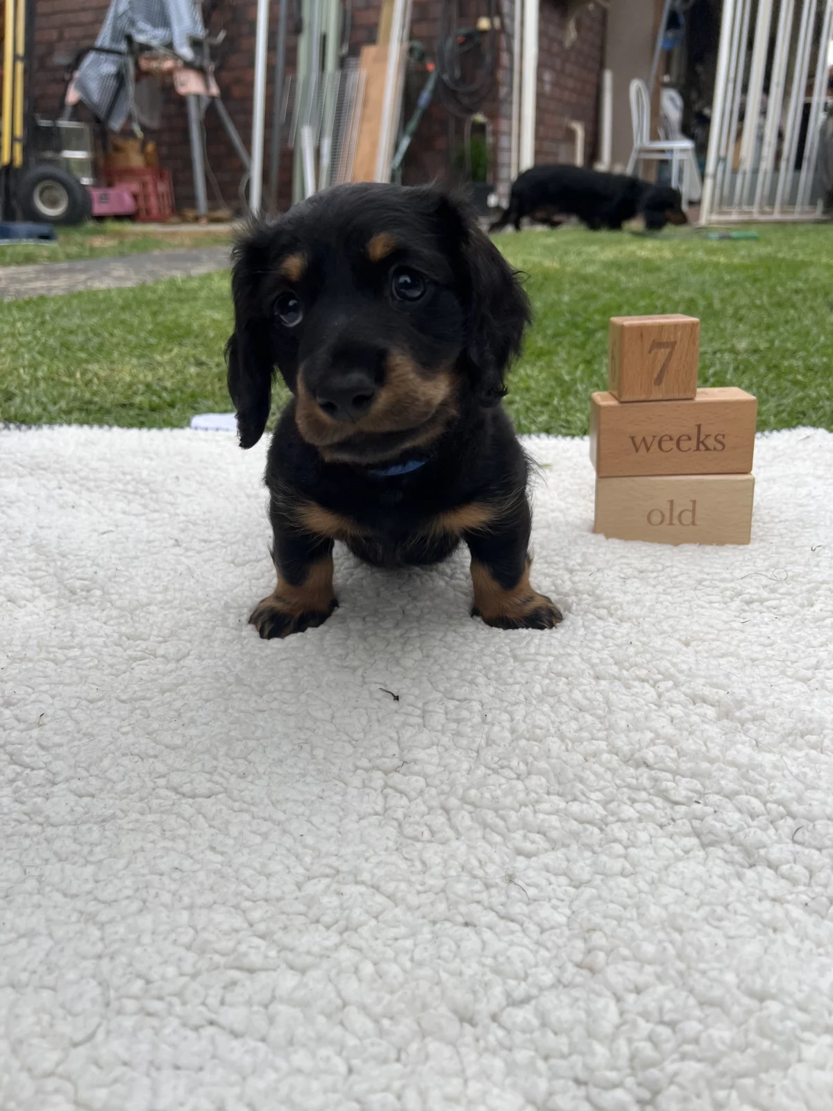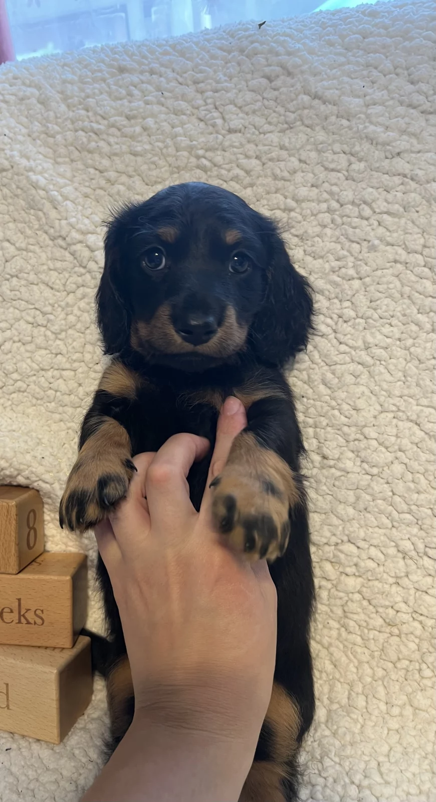 We have a gorgeous black and tan long-haired dachshund puppy who will be ready to go to a loving forever home on 5/12/23. This little one has been raised in a caring family environment with plenty of love, handling, and socialisation, making them confident, affectionate, and well adjusted.
