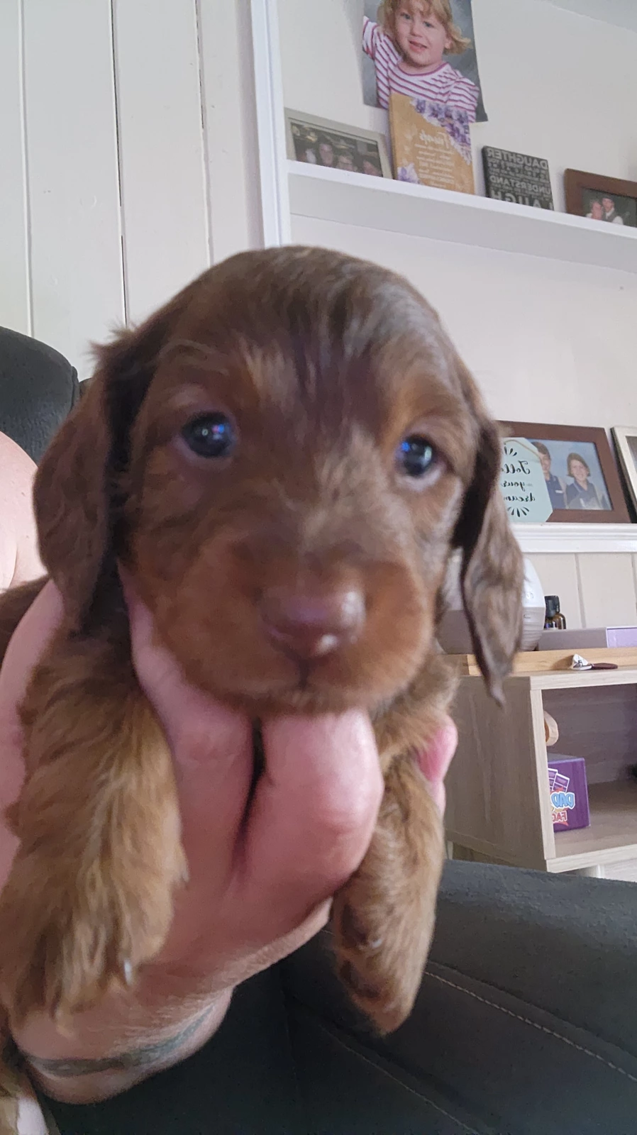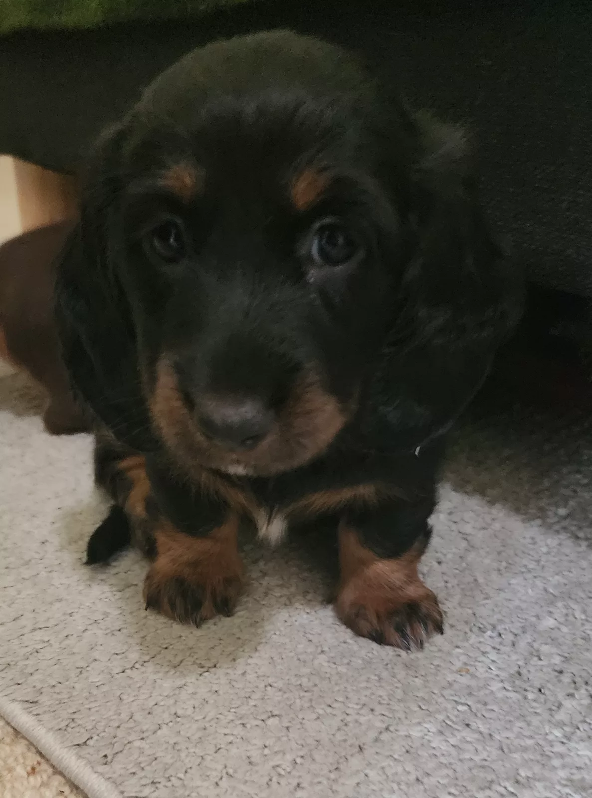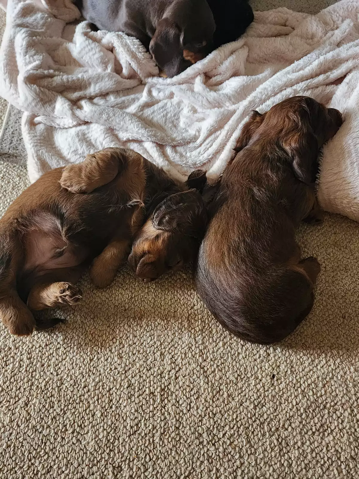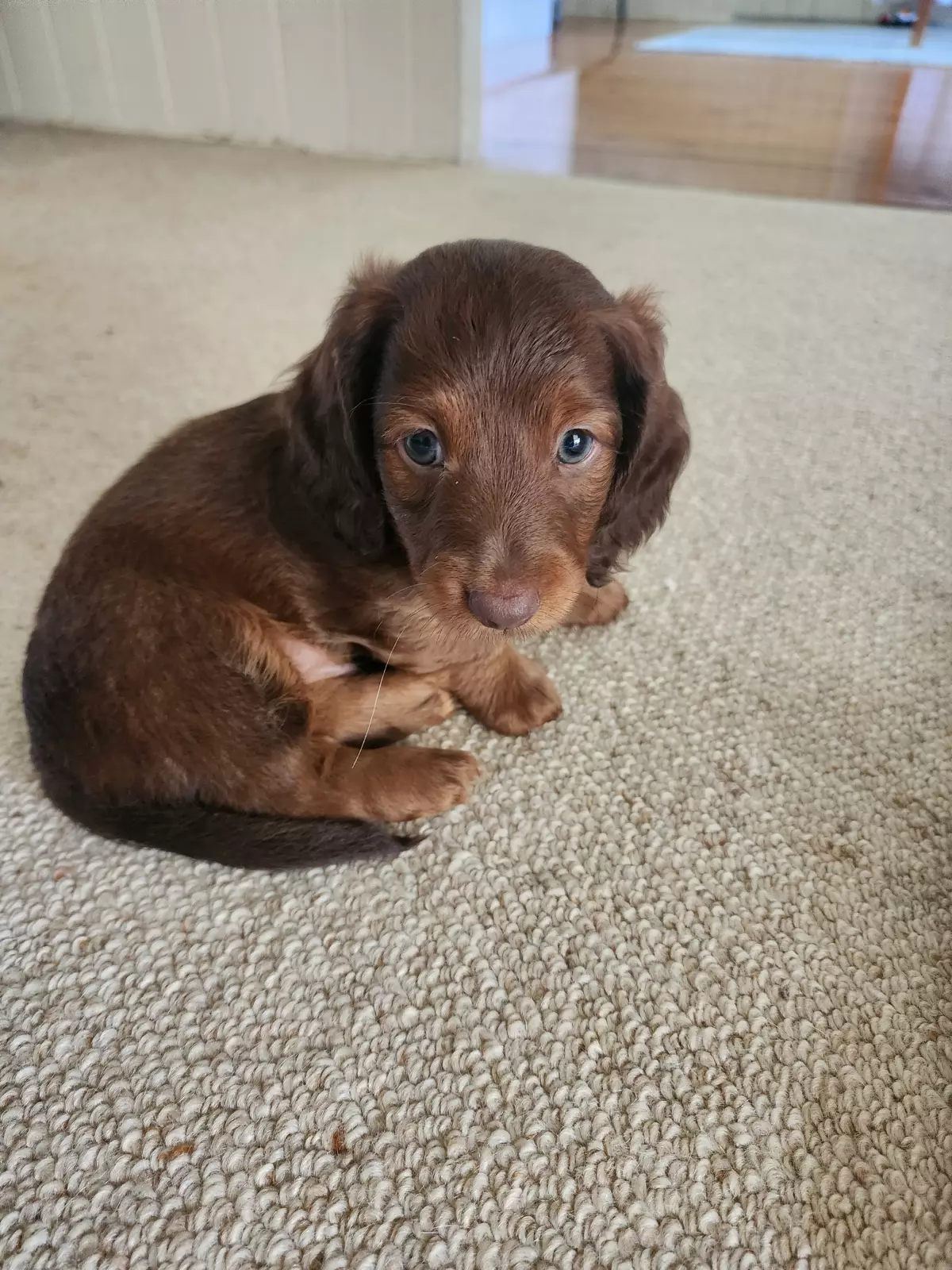 We have three gorgeous longhaired Dachshund puppies ready soon: 2 chocolate males with a striking red tinge and 1 sweet female in classic black and tan.