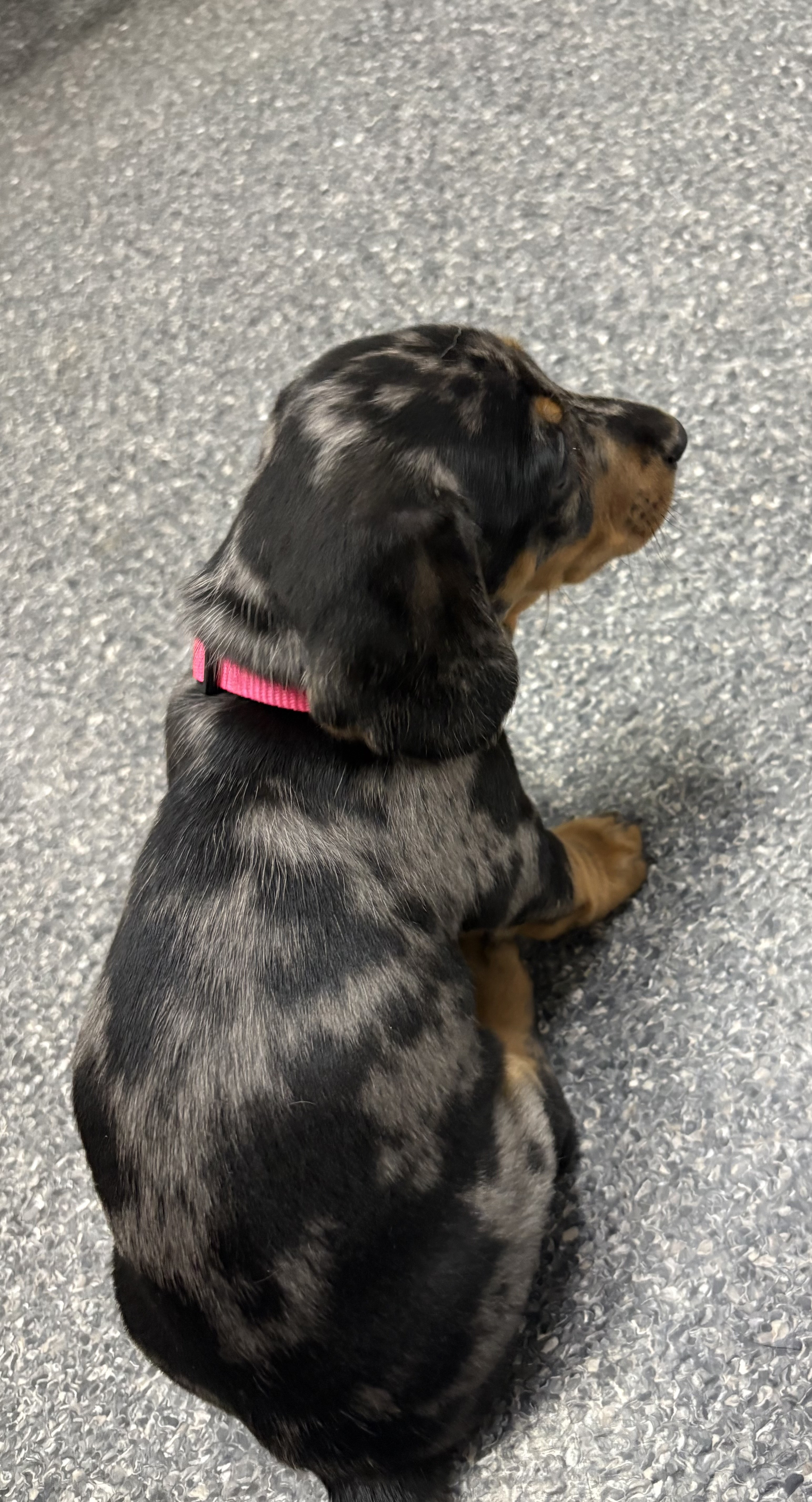 This beautiful little girl with blue eyes is ready to go to her forever home where she will give you cuddles and unconditional love. She is a litter of 5 - Mum is a mini dapple and dad a light chocolate and cream mini dacshund. This little one loves a belly rub, big cuddles. She is extremely playful, curious and adventurous. She will be a wonderful additional to any home.