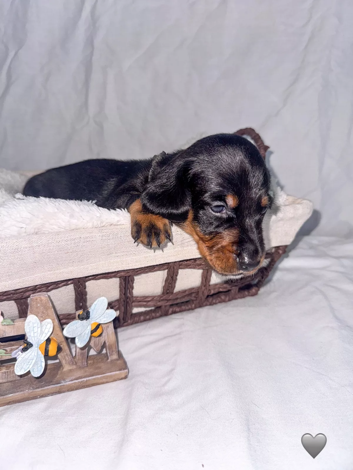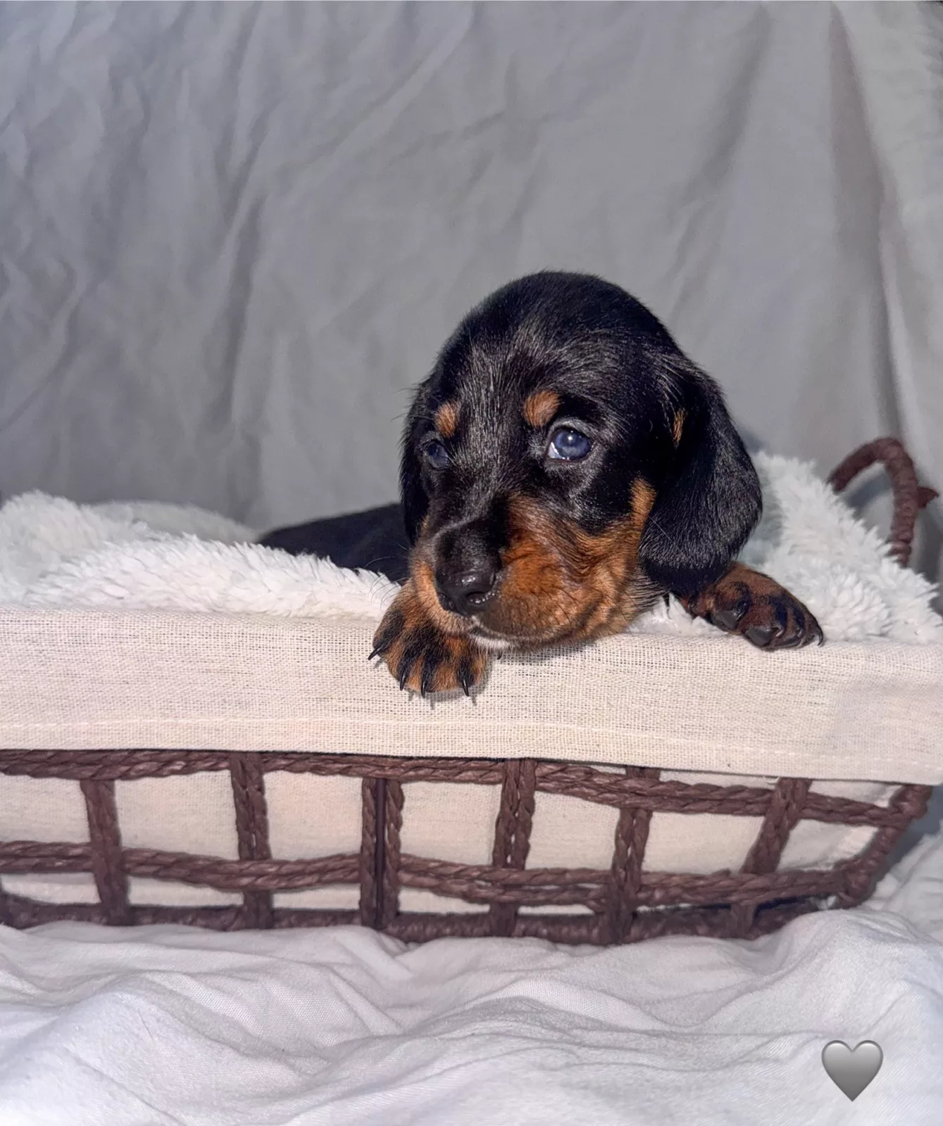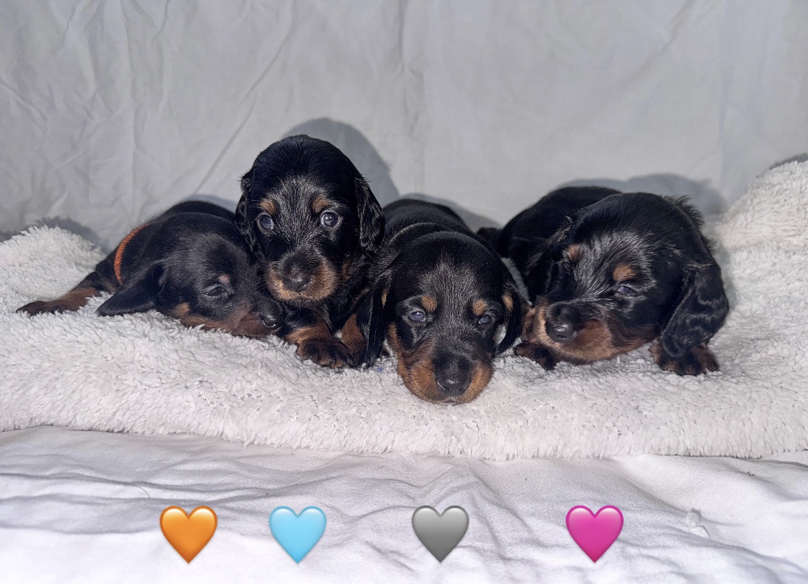 We have two boys & 1 girl available, born on the 27th of February 2025 (will be ready at the end of April/early May for their fur-ever homes). Mum (Honey) is a long haired black & tan miniature & Dad (Cash) is a short haired Black & tan small standard.