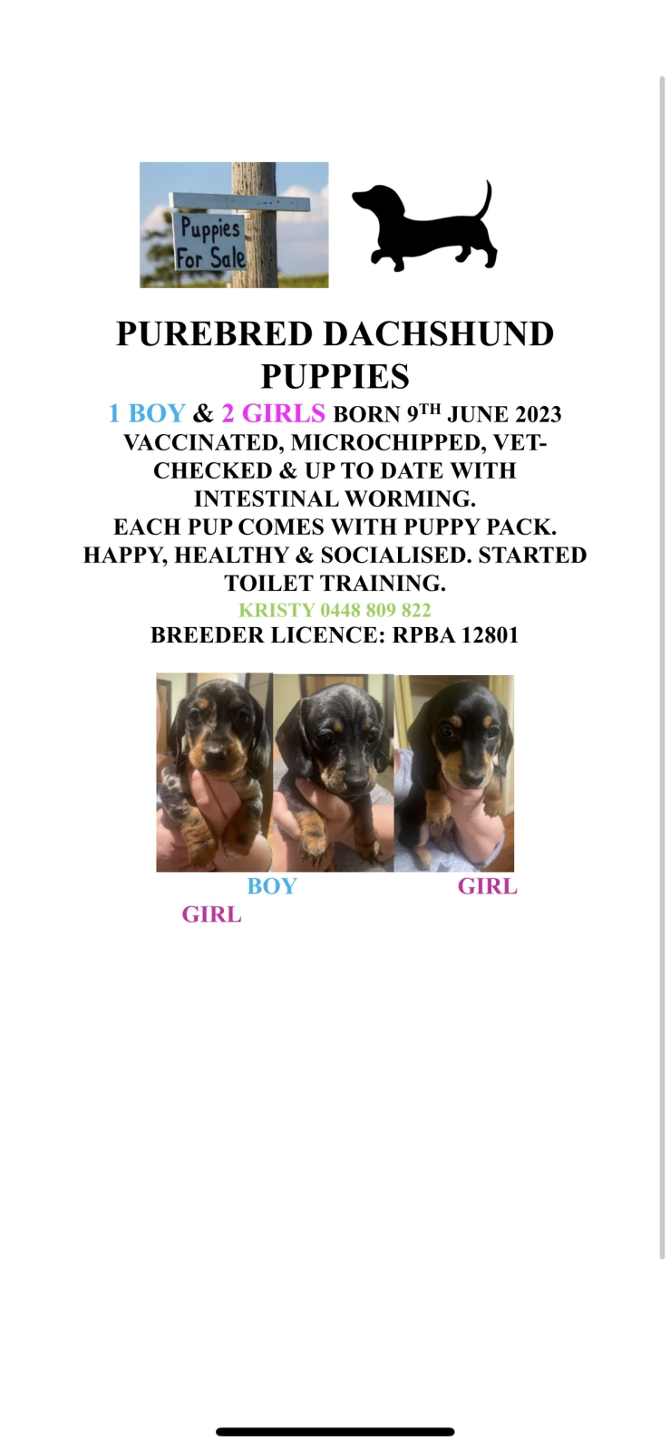We have a gorgeous litter of miniature dachshund puppies born on 09/06/23 that will soon be ready to find new homes. Each pup will come microchipped, vet checked, and with their first vaccination completed when we release them. They will also be up to date with worming and raised in a loving, well-socialised environment, making them confident, affectionate companions.