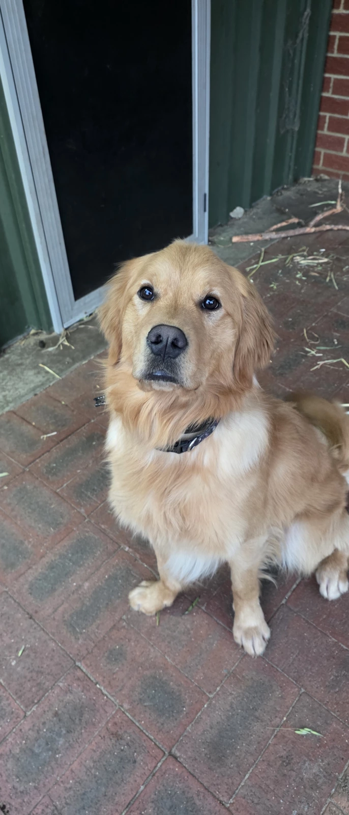 Golden Retriever- 1.5 years old. Loves people, thinks he is a lap dog. House trained, great with kids. Very gentle and friendly. Dark golden, desexed.