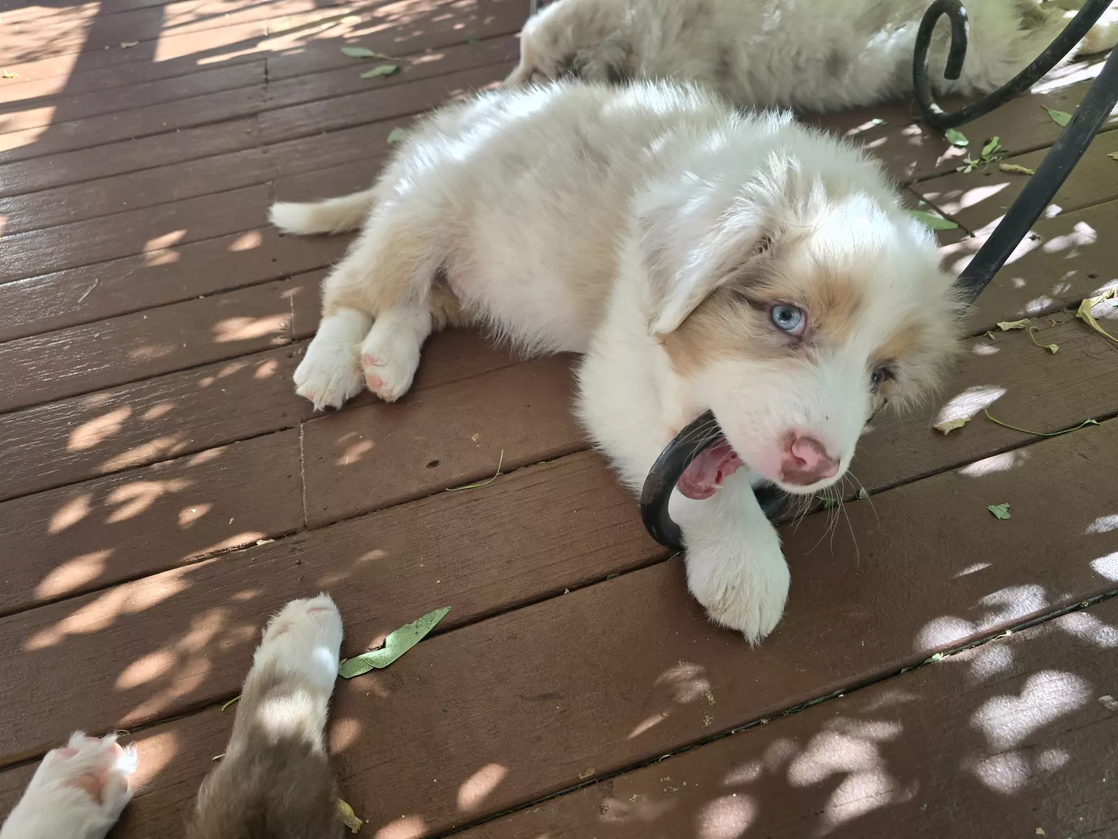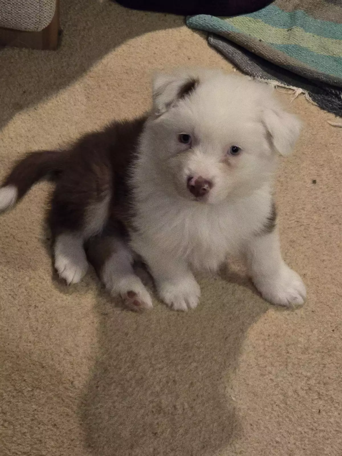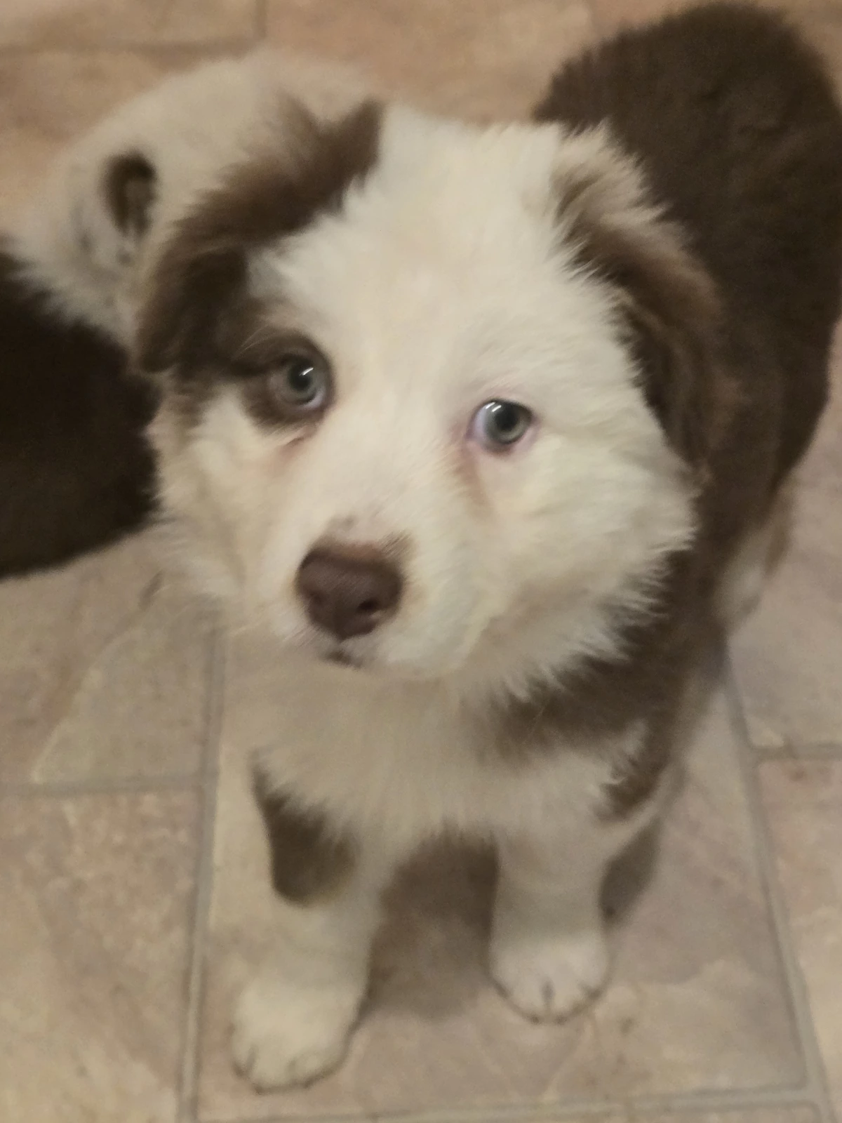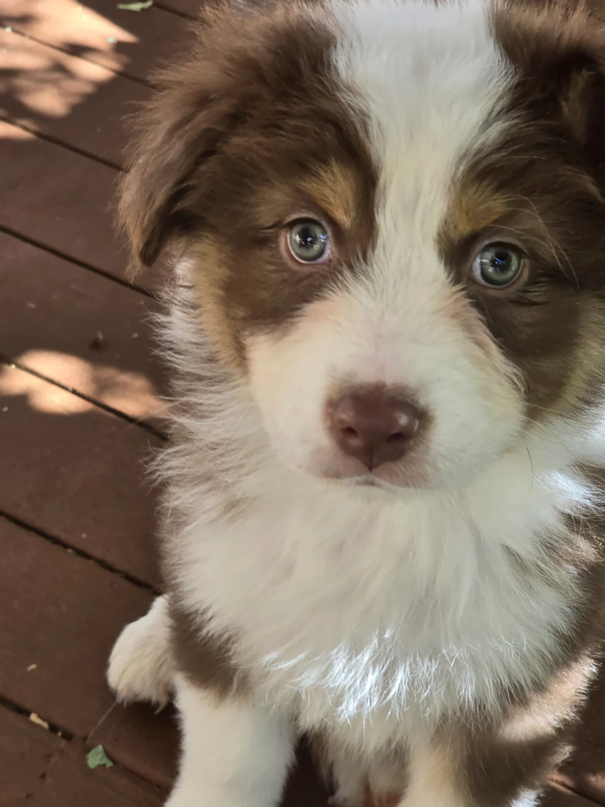 Parents are Lenore a red tri bob tail girl and Bowie a red Merle boy with green and blue eyes.