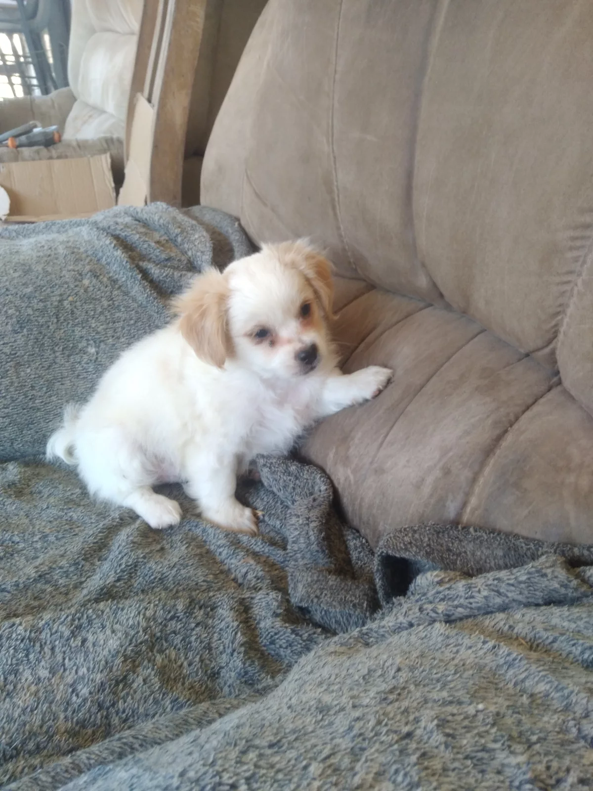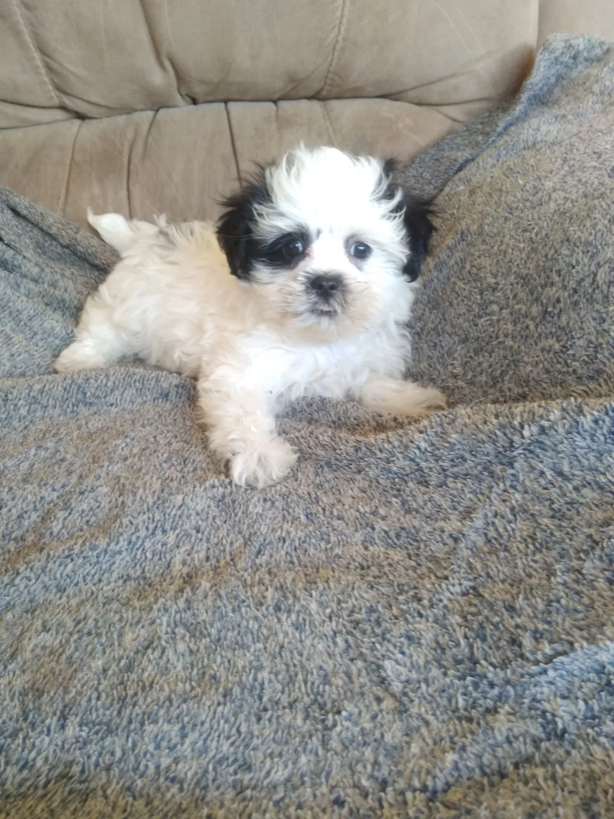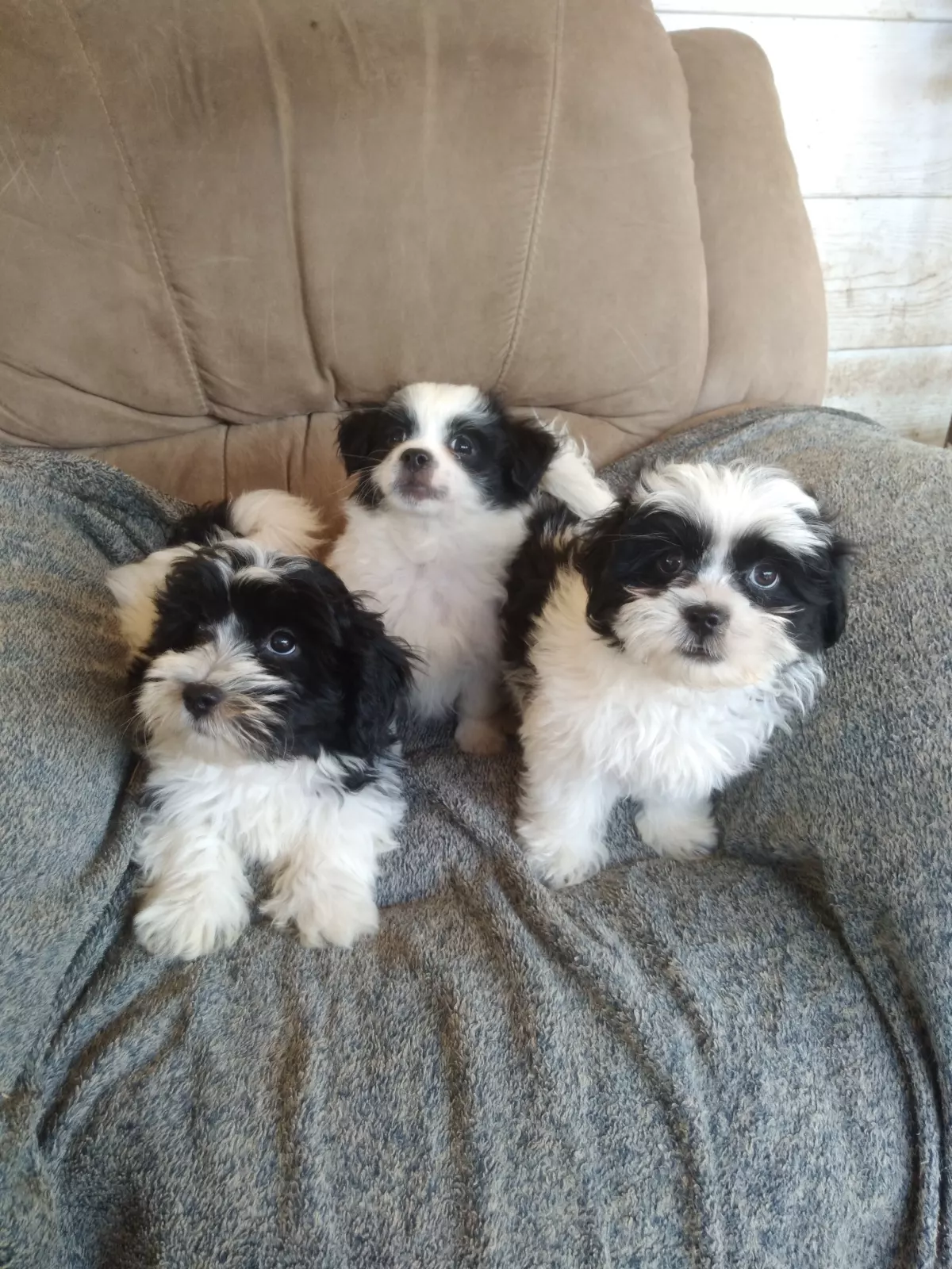 There are 3 black and white males 1 black and white female , 1 white and apricot male and 1 white and apricot female.