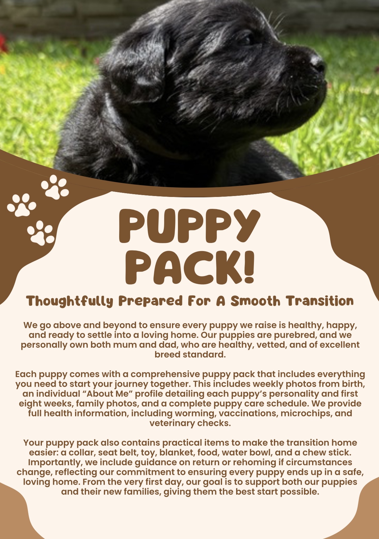 To help each puppy settle happily into their new home, we provide an extensive puppy pack, including: