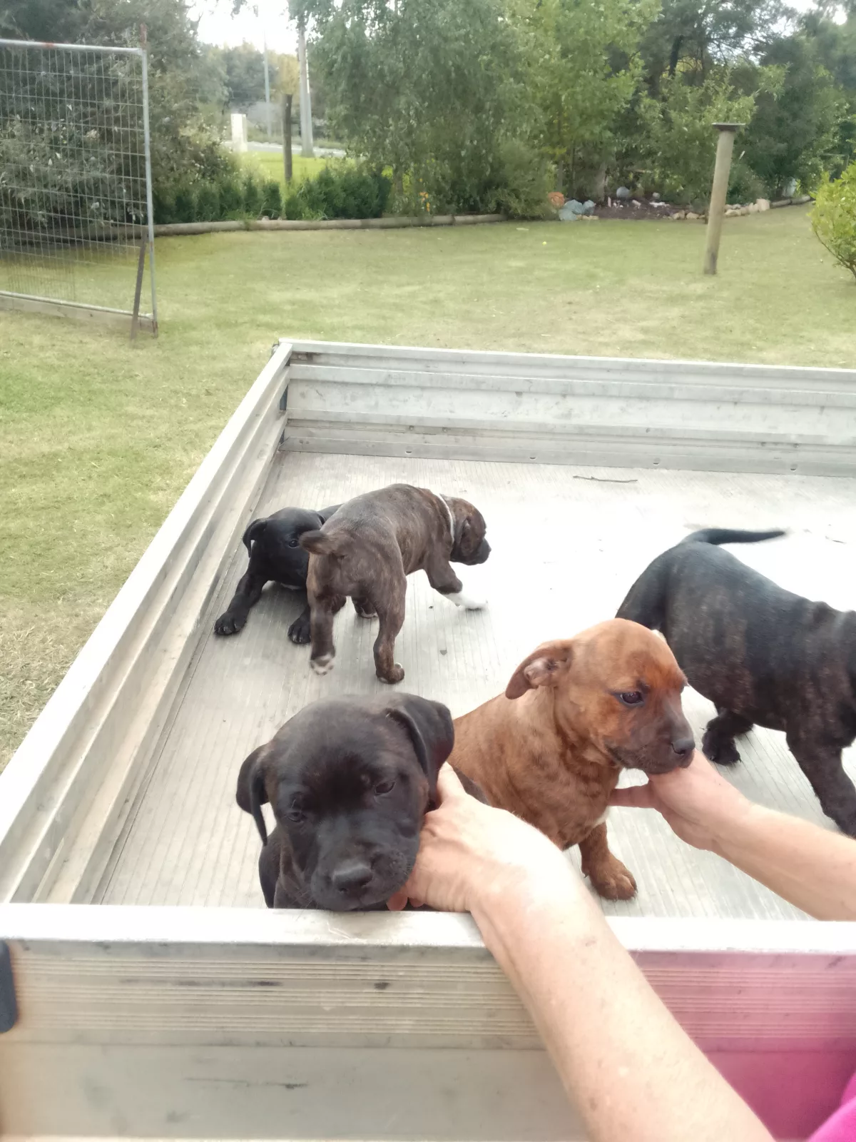 3 girls 1brown brindle 1 dark brindle white around neck 1 black brindle 2 boys both black brindle