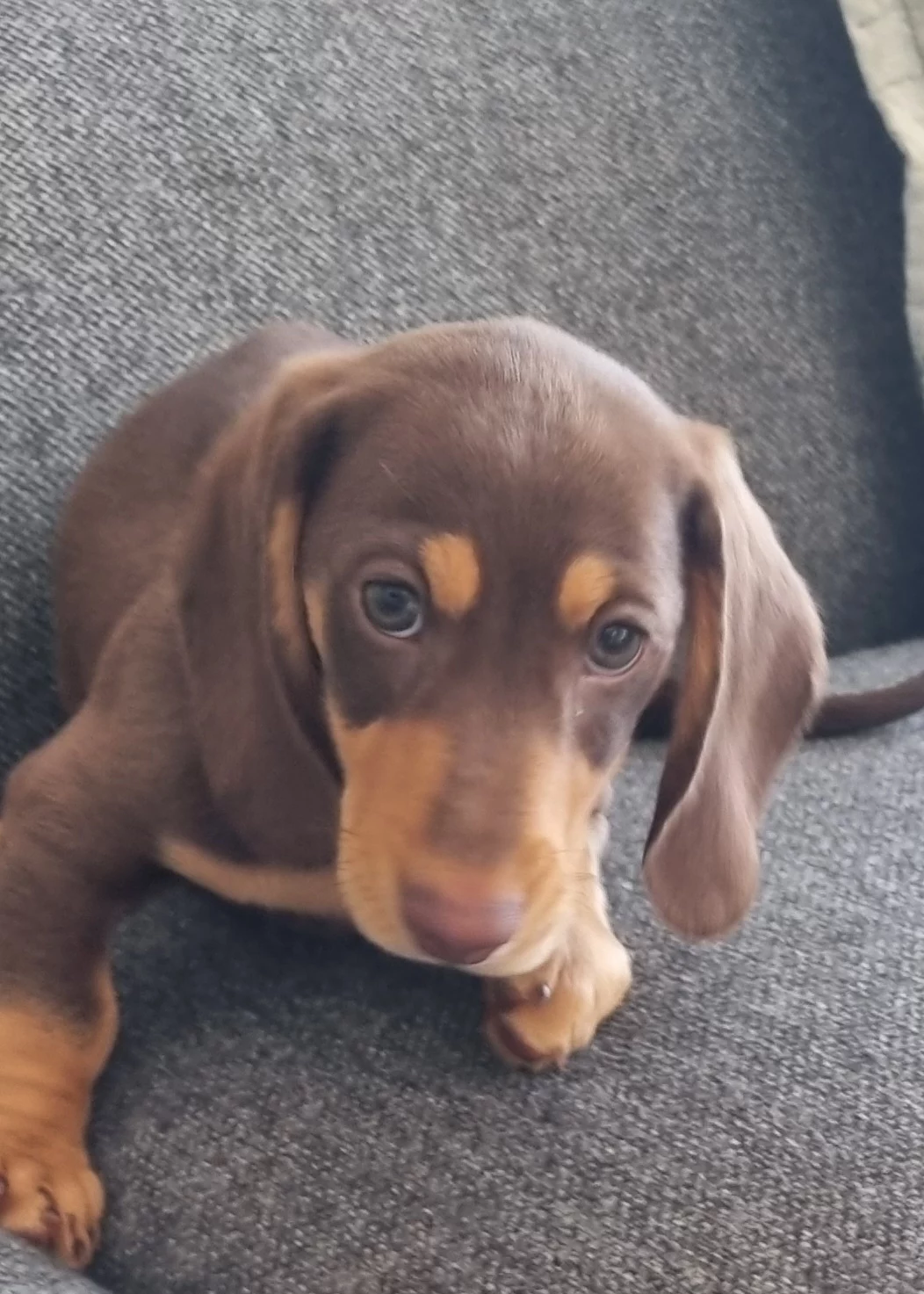 1 chocolate and light tan – this little man is pretty chilled. He goes with the flow with what his litter mates are doing, loves a cuddle and playtime.