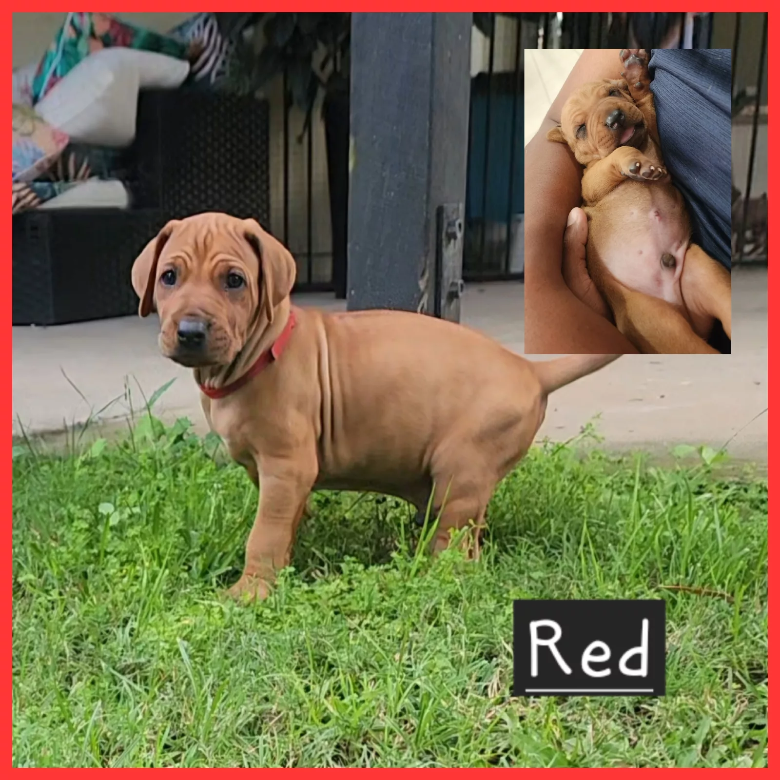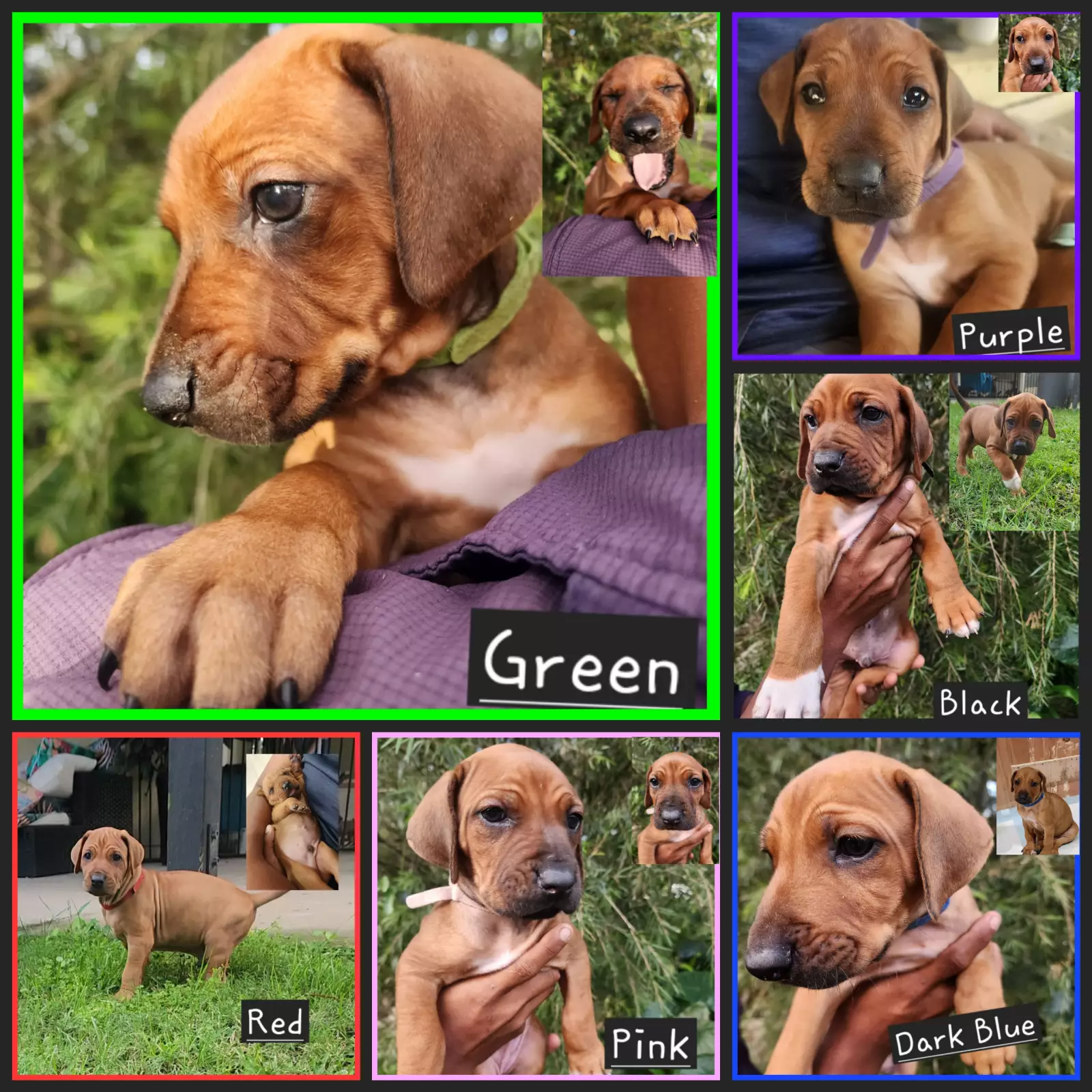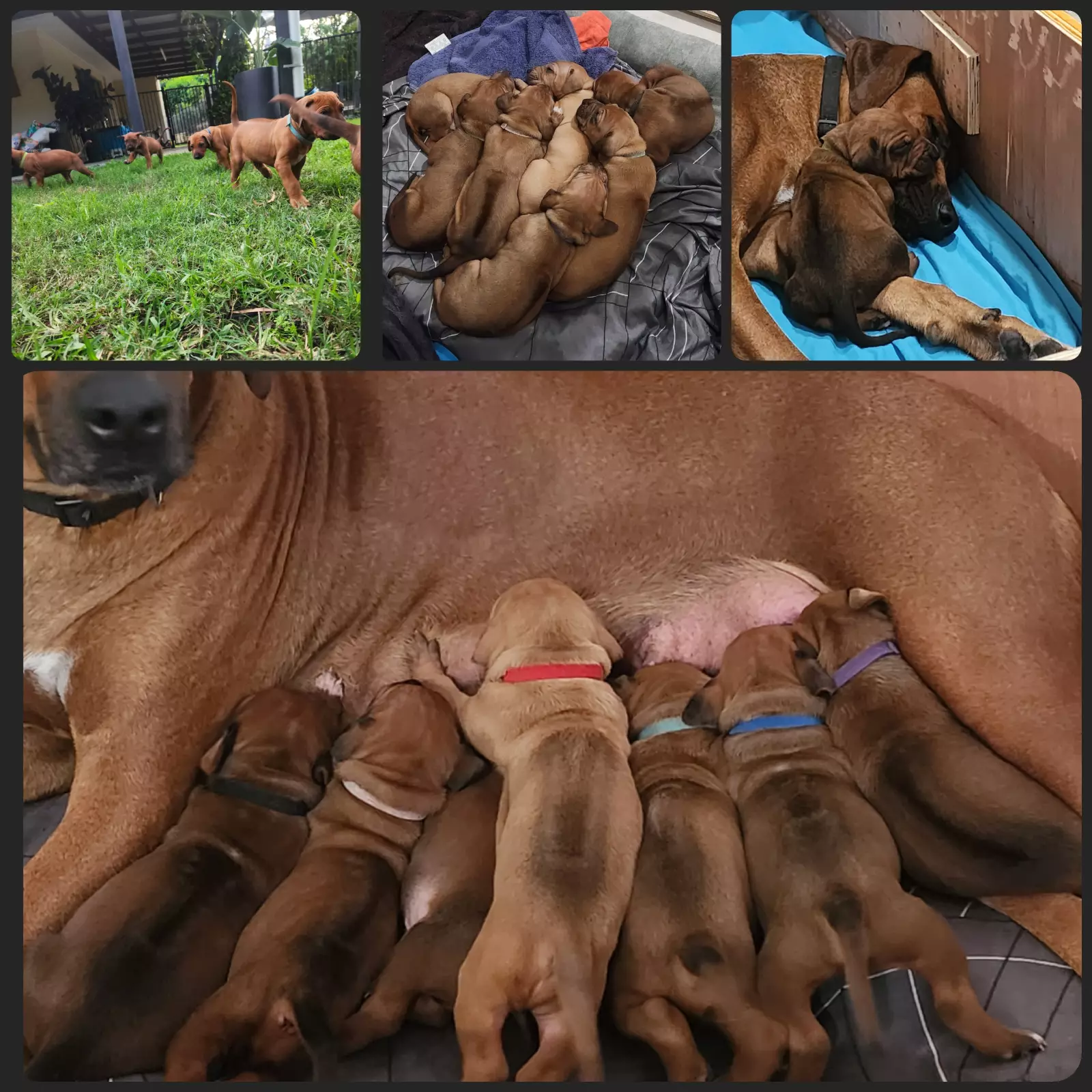 Our puppies are gently nurtured and cared for in a family environment. They develop socially and emotionally as they grow and explore their home, the many animals and spend time growing up with our family. This will also be the only litter for Wolfe and Balter. Both parents completed a full vet check before breeding including hip and elbow dysplasia, dermoid sinuses and a full blood panel check. Both dogs are fit and healthy. Wolfe is 2.5 years old and Balter is 3.5. All puppies will be microchipped, are wormed at 2,4,6,8 weeks, tick/flea treated, regular health checks, 1st vaccination including protection from parvo virus. They will have great social skills, understand routine, trained to use puppy mats and grass for toileting and some simple commands where possible. We invite prospective families to choose their puppy at about 5 weeks of age when their characters are starting to show Puppy Details: The puppies come with their own puppy passport which contain the puppy’s microchip details, medical history and an information pack to help care for your puppy. Pups are a mixture of red , light and dark wheaten. As both parents are our family pets, they are both available to meet. Big Blue: FOREVER HOME FOUND. The biggest of the bunch. He is playful, friendly and loves the toys. He has big paws already and will grow to be a very large male ridgeback. Red: The second biggest and competing to grow bigger than Big Blue. He is the lightest colour of the puppies, and we have nicknamed Junior as he looks so much like Dad (Balter) with a similar personality. One of the first to go to sleep, he settles quickly. Black: He is darker in colour with a beautiful white front paw. He loves to play and stare into your eyes! He is confident, loves food and a good cuddle. Dark Blue: He is lighter in colour and likes to cuddle. He is happy to play with the others or go walk around on his own. Green: Darker in colour, sweetest in nature. Green is quiet, likes to watch first and has the most perfect puppy dog eyes. He will sleep on you for hours, eat slowly and wake up to a little kiss Purple: The smartest and most independent of the group. She has the most perfect face and softest fur. She likes to cuddle, play with new toys and is usually the last to sleep as she is having so much fun Pink: Sweet Pink. She is the smallest girl but the biggest personality. She is sassy, fearless and puts the boys in their place. She has no problem wrestling with the big boys or crawling on top for the prime position during naps! Breeder register number. BIN0016410974679 Note: They are NOT HUNTING DOGS, they are family pets.