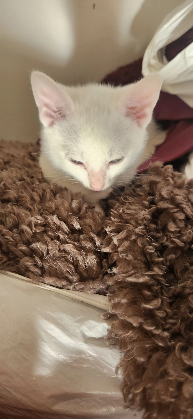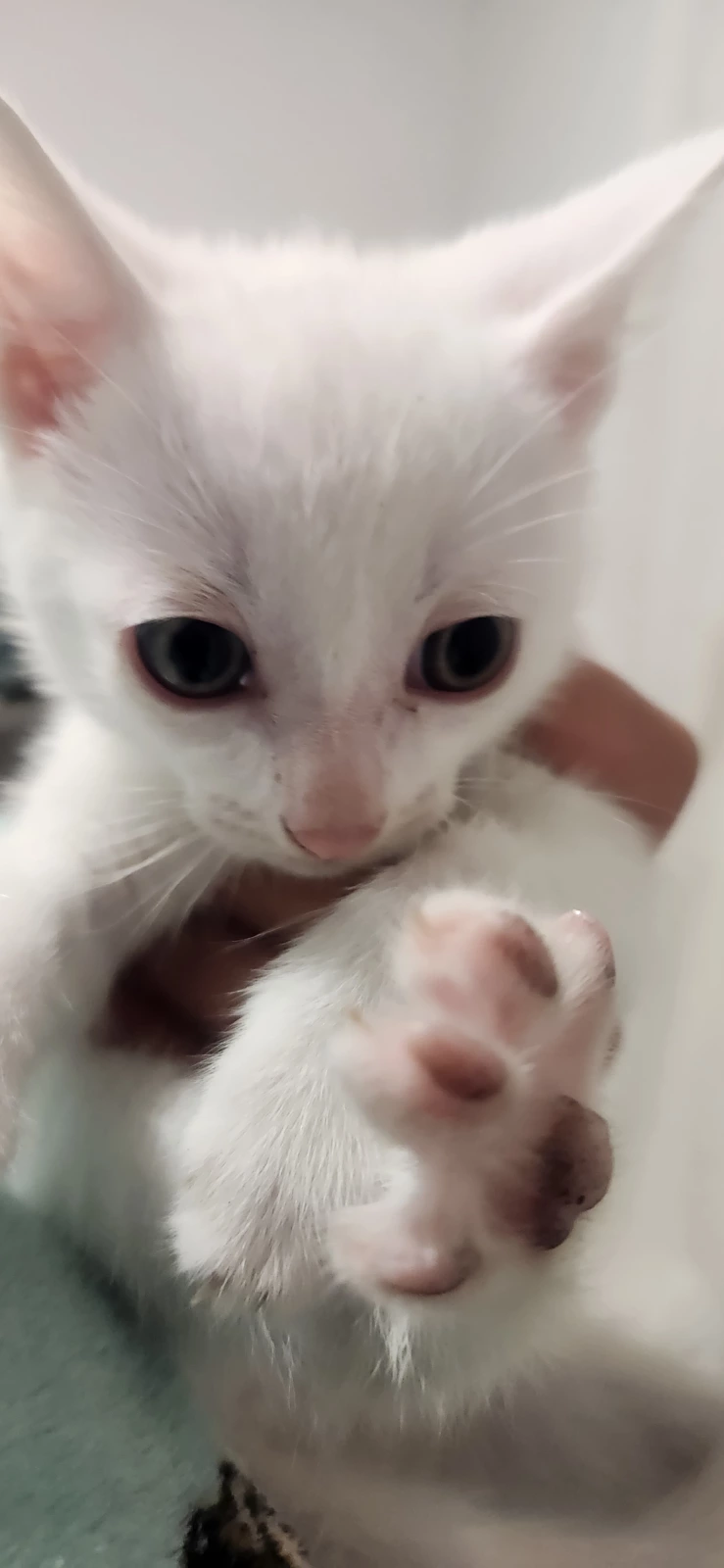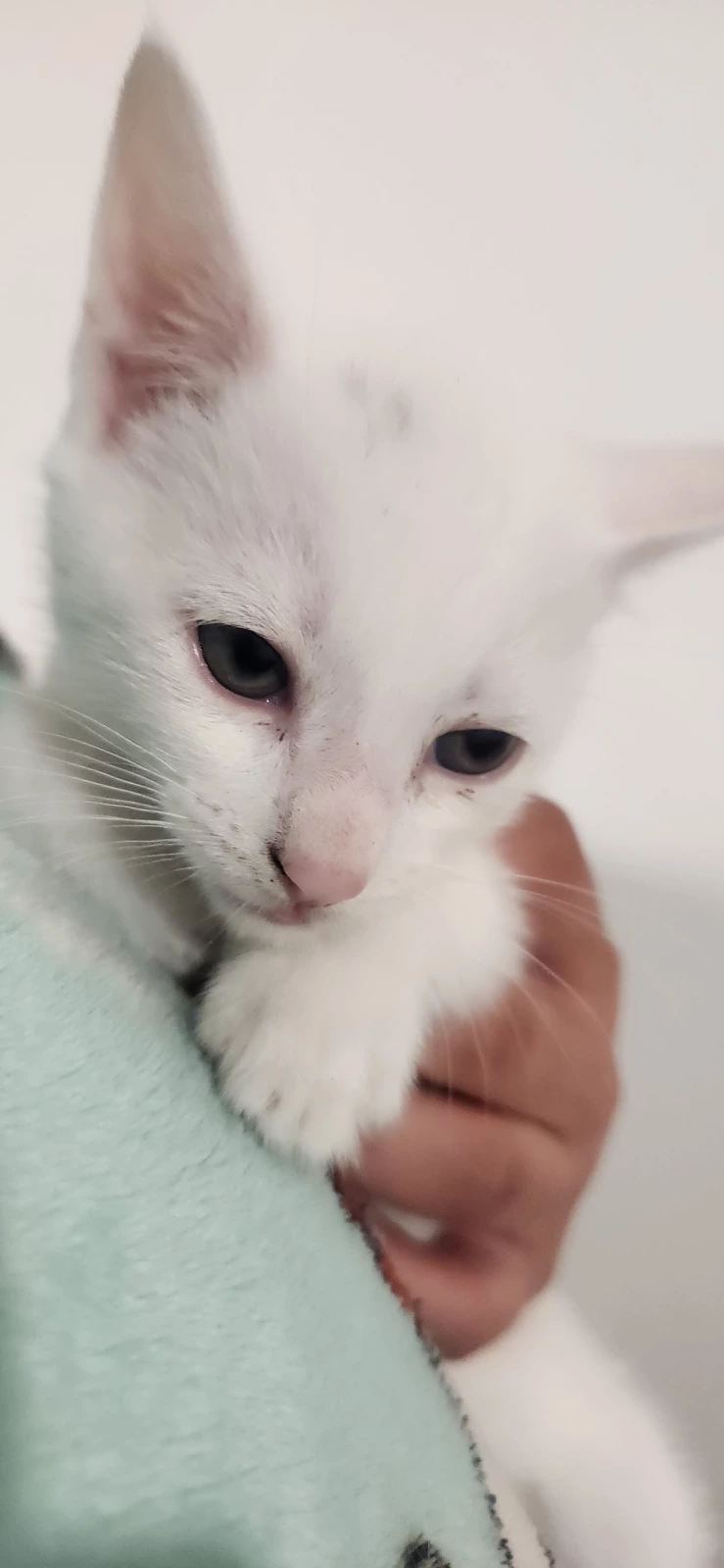 1x white male with a small black fur patch on his head
