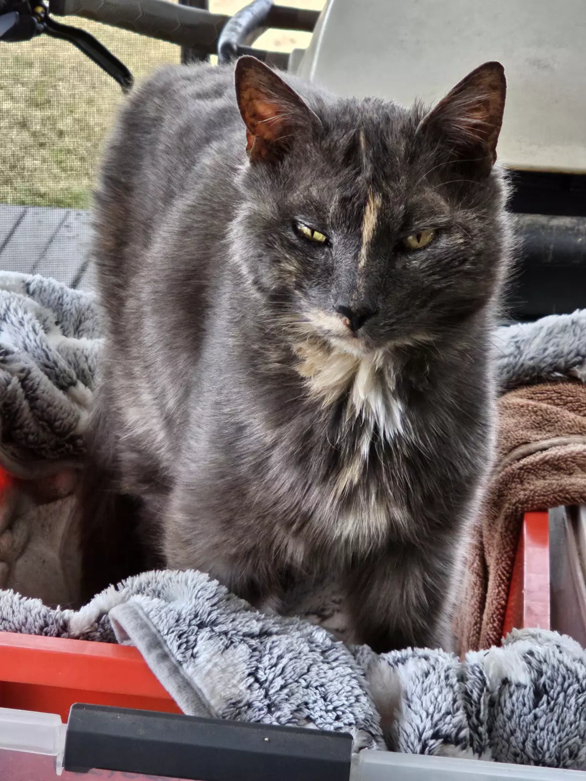 9.5 year old grey tortashell female cat to give away. We are moving and unable to take her with us. Very good natured.