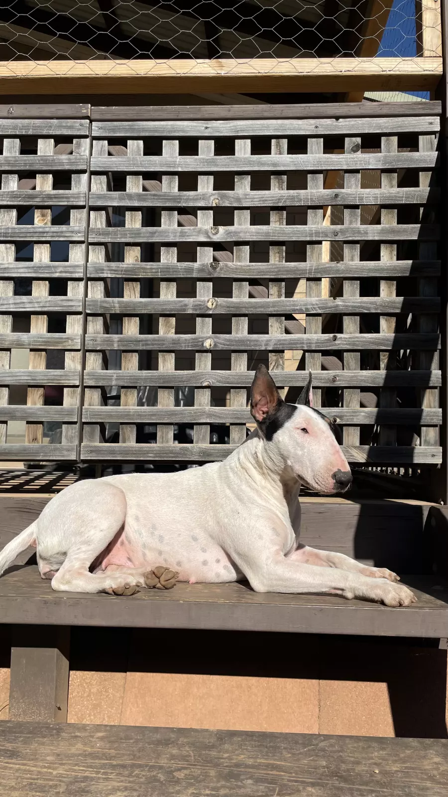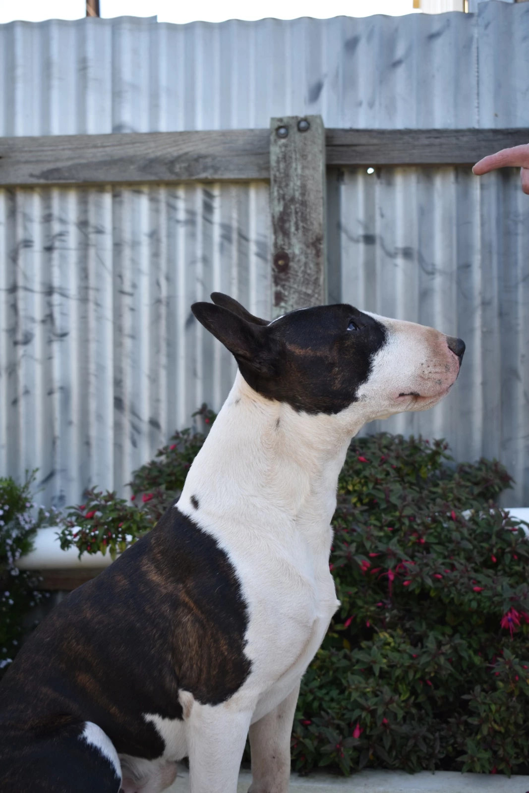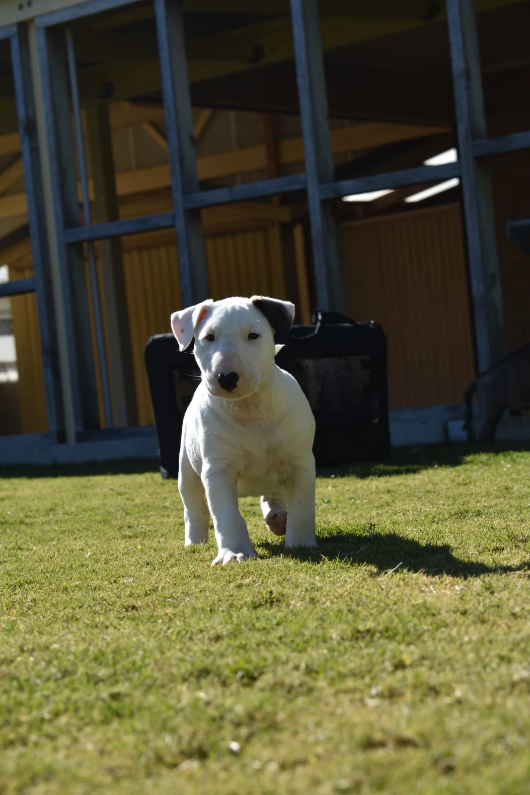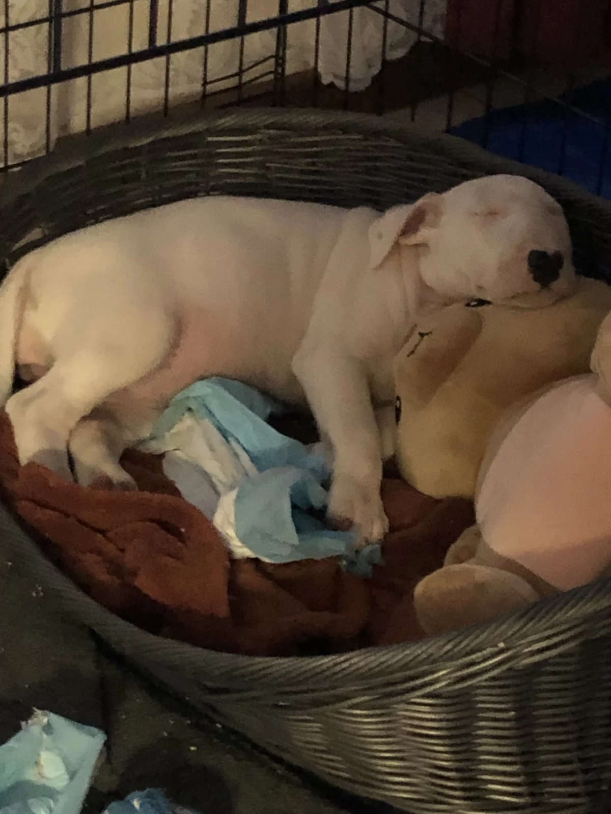 Beautiful little purebred English Bull Terrier puppy girl, white with a brindle ear and a lovely heart-shaped black nose that is hard to resist.