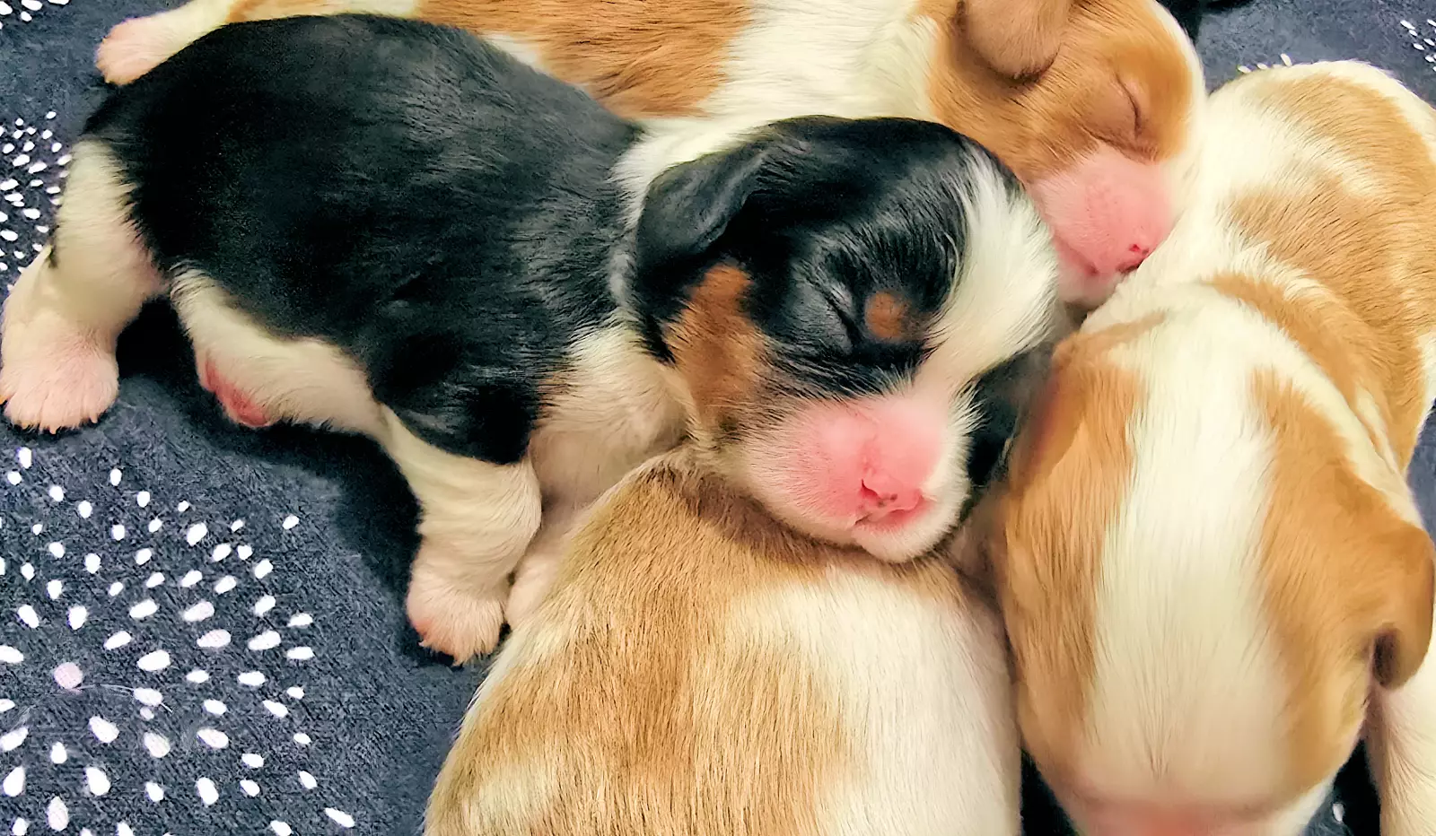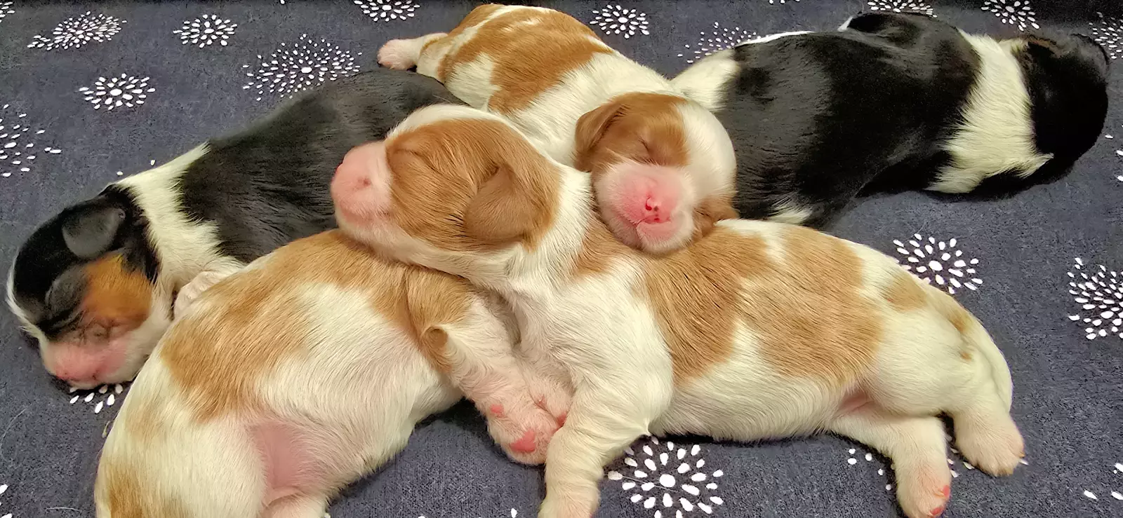 Meet the Stars of Thorenvale Cavaliers’ Latest Litter, featuring three beautiful Blenheim girls and two handsome Tri-colour boys.