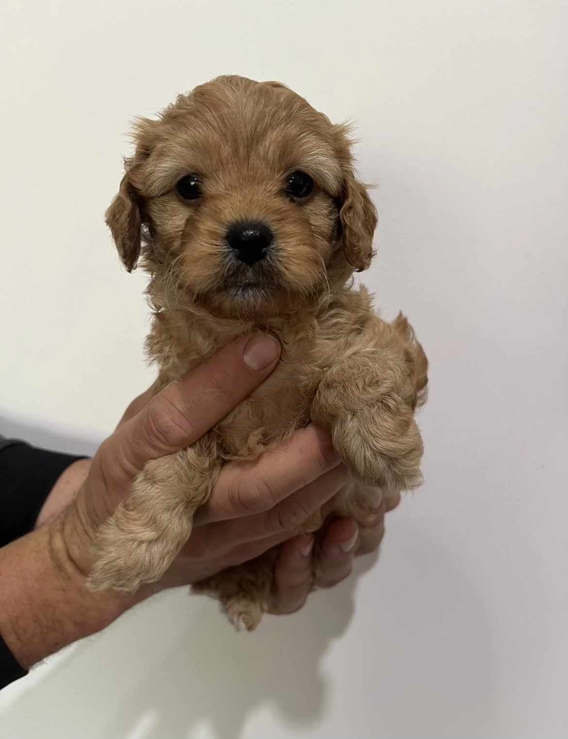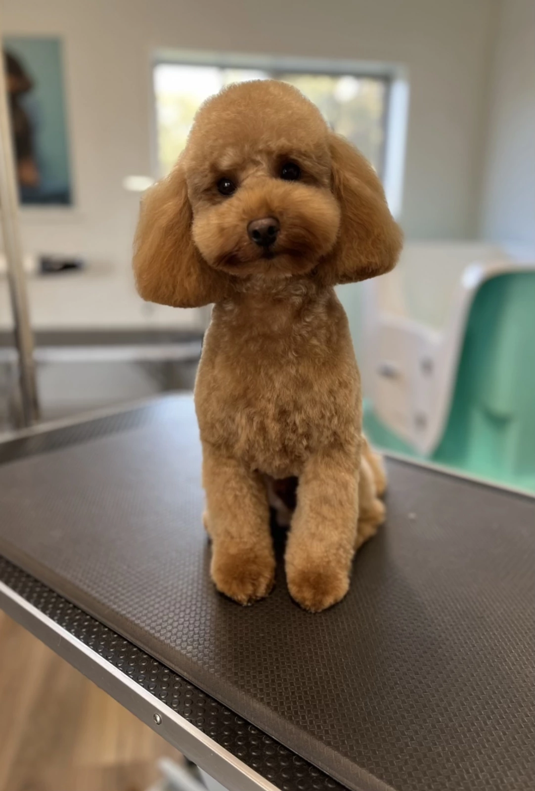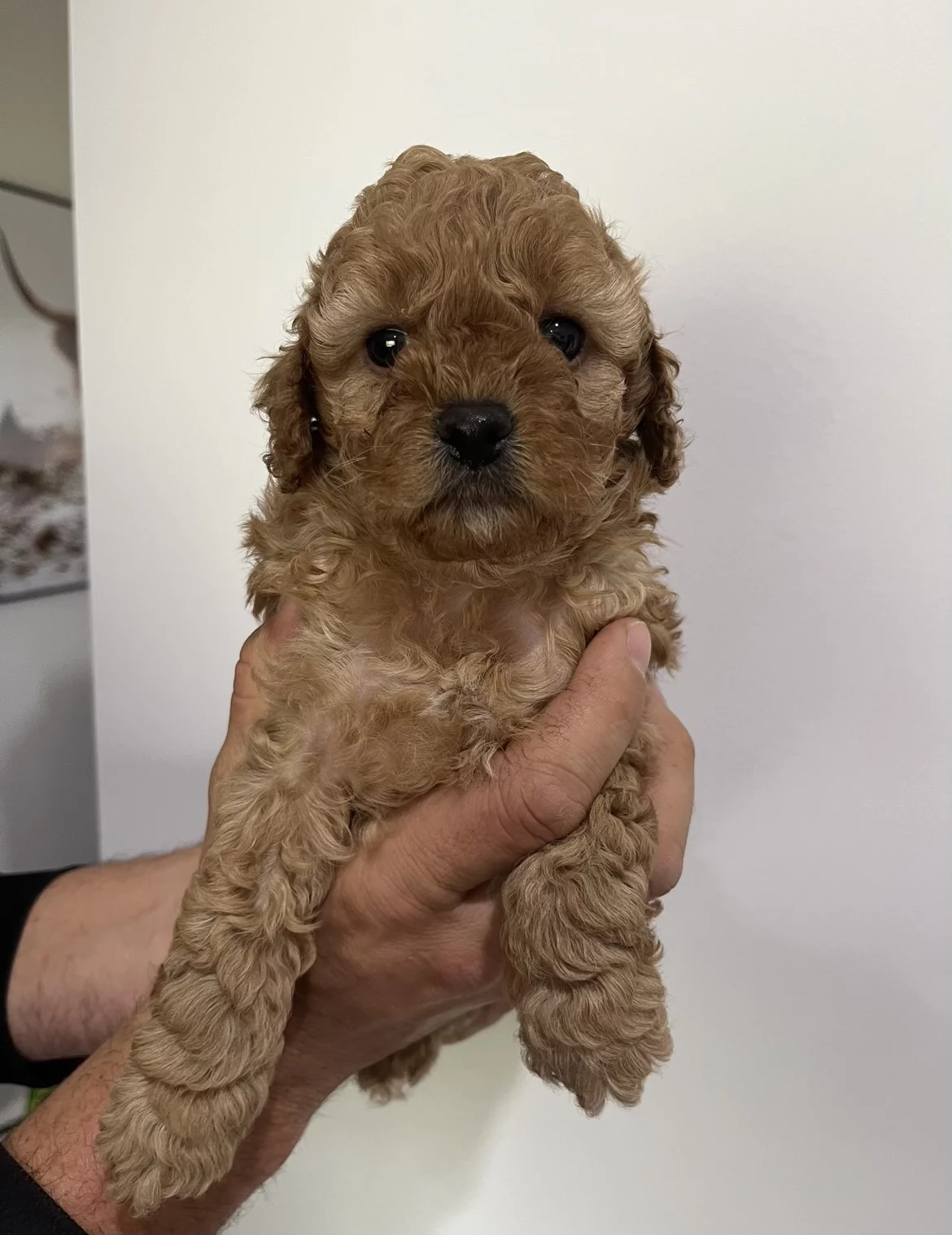 Dad is a purebred toy poodle, apricot in colouring, weighing 3.5kg.