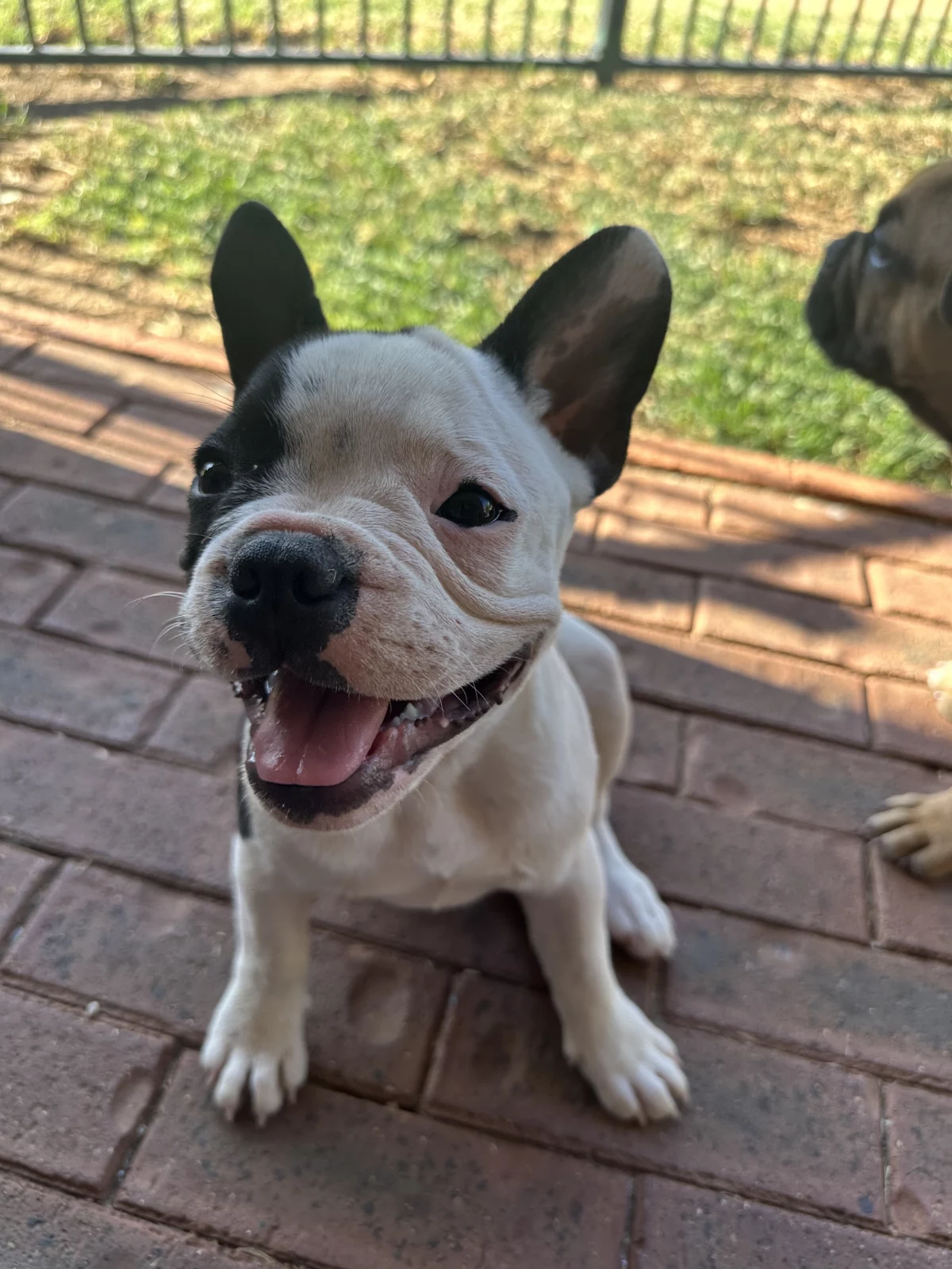 Moo is a white and black pied girl. She is vivacious, spunky, sassy, cuddly and cheeky. She is very intelligent and is just happy to be with you wherever you are…. Moo does have a belly button hernia which the vet recommended she get done at 5-6 months old and if you’re getting her desexed at 6 months get it done at the same time! This is a must to be rectified! The only reason it hasn’t been corrected as of yet is that I am following vets directions. It doesn’t impact her now but it is a must to be corrected! Other than that she is a happy healthy energetic puppy!