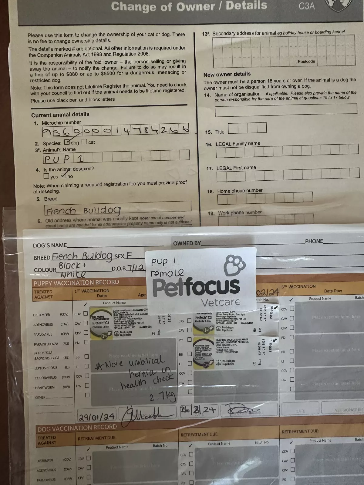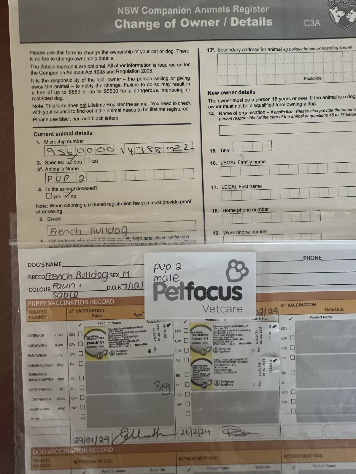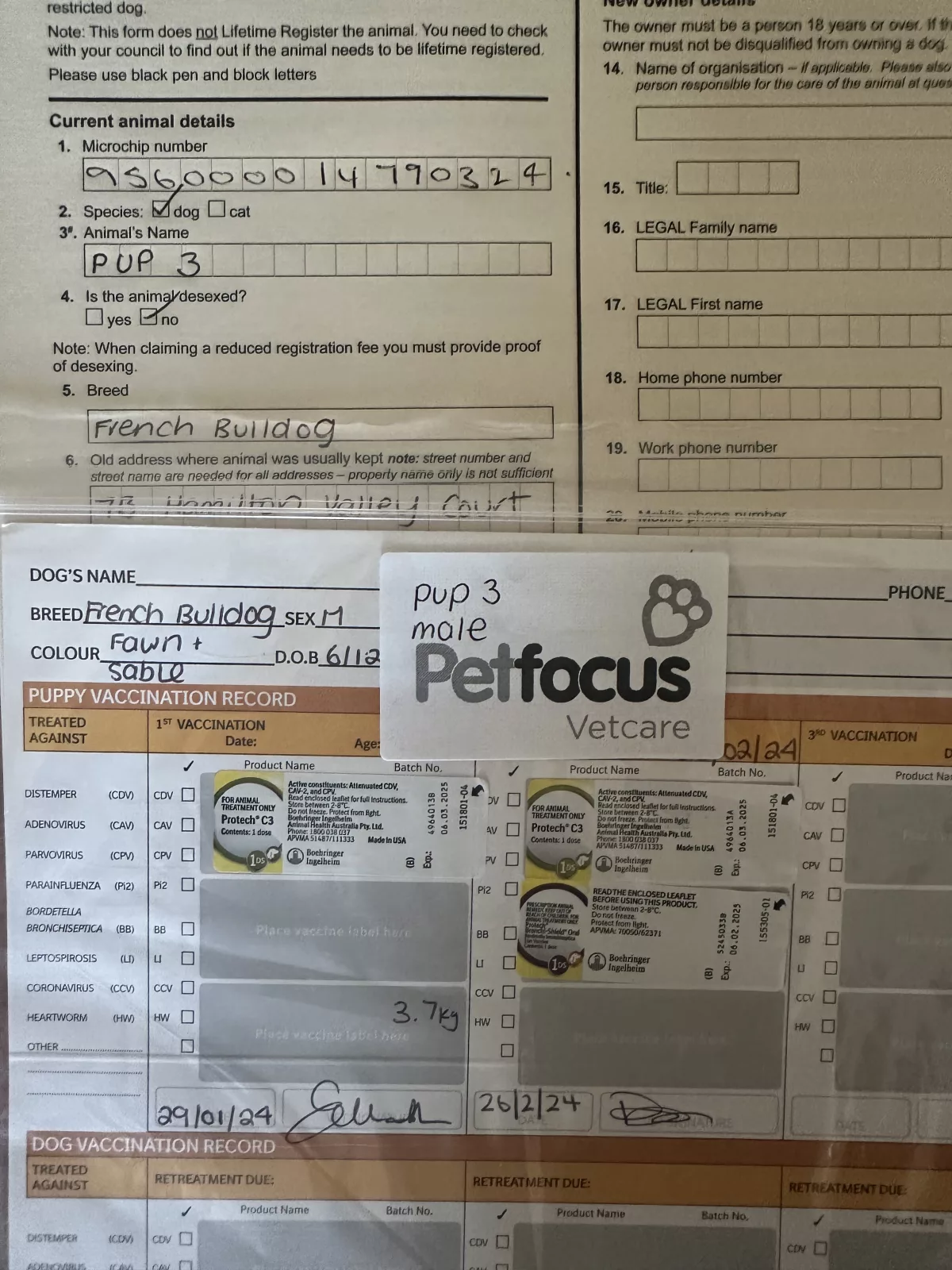 Pups were getting wormed every 2 weeks up till they were 12 weeks and are now getting wormed and flea treatment monthly. Pups are currently 15.5 weeks old(todays date 18/03/24)