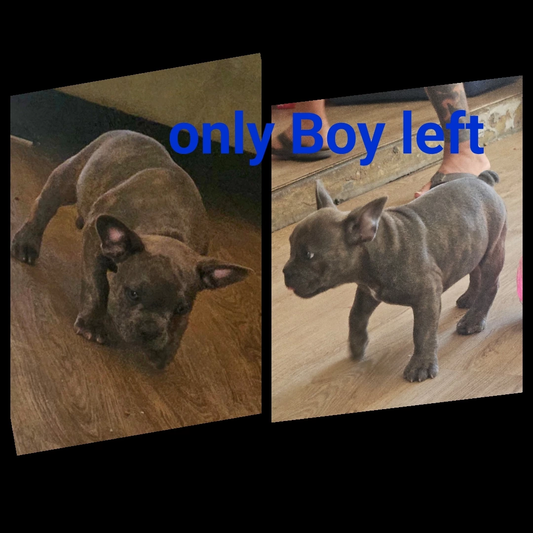 We have 8 beautiful puppies available and ready for their new homes as of 27/01/2025. Born on 2/12/2024, the litter includes 1 male and 4 females. They are a unique blend of 3/4 French Bulldog and 1/4 American Bully.
