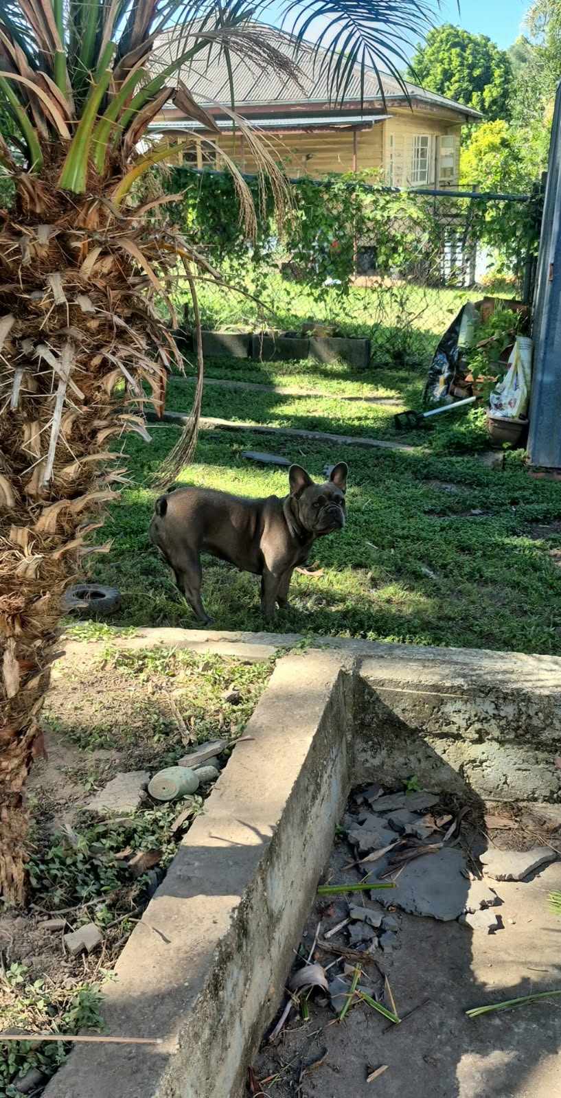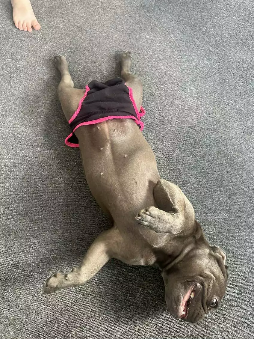 shes a blue frenchie with brown throughout her coat. shes just had her 1st time on heat.