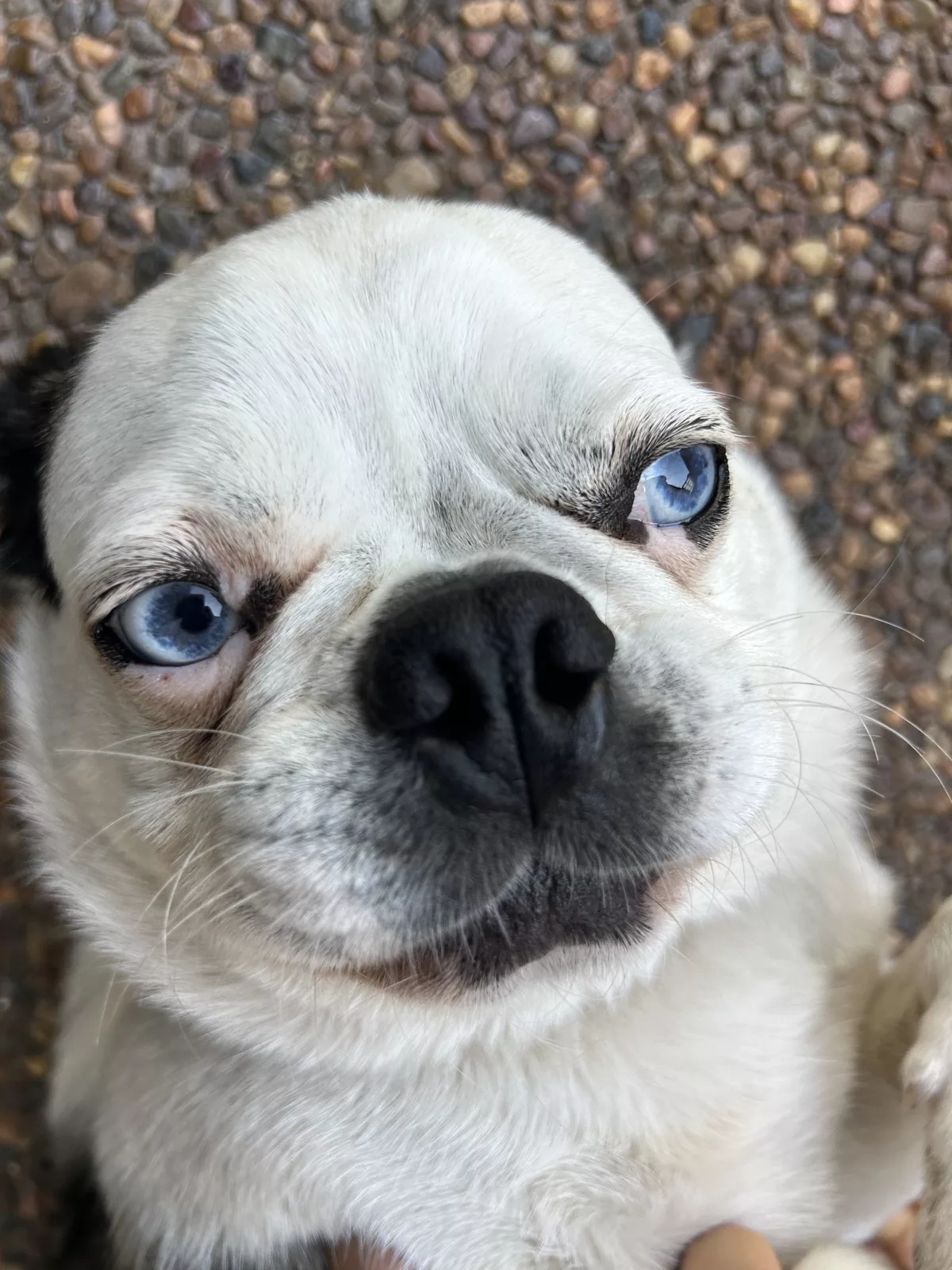 1x Female (white/brindle) – 50% French Bulldog and 50% Pug. She is 3 years old and has been well cared for in a family home. She has a lovely, gentle nature and has been raised around young children, making her a friendly and affectionate companion.