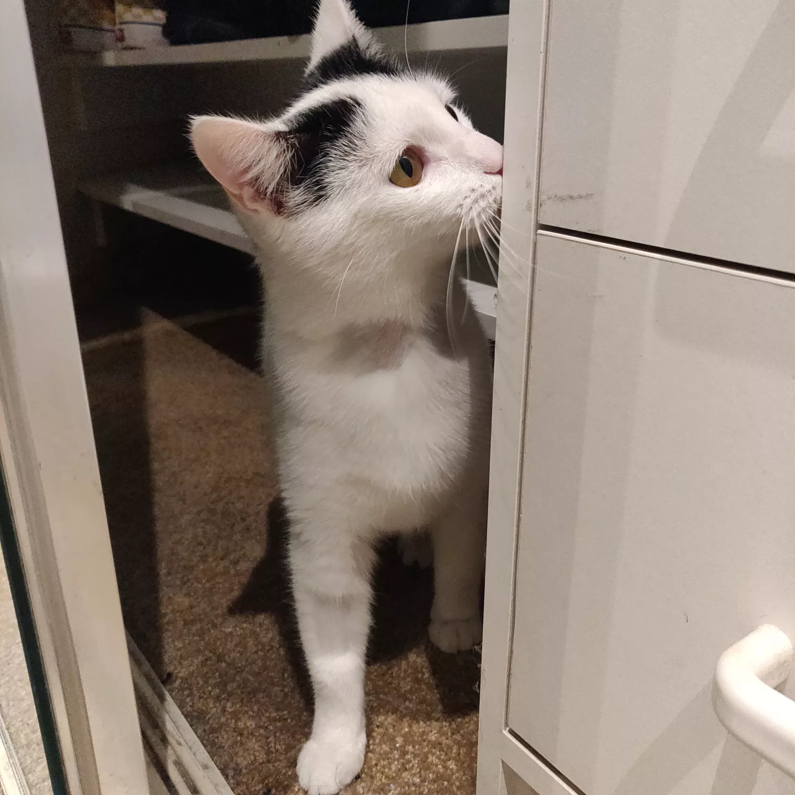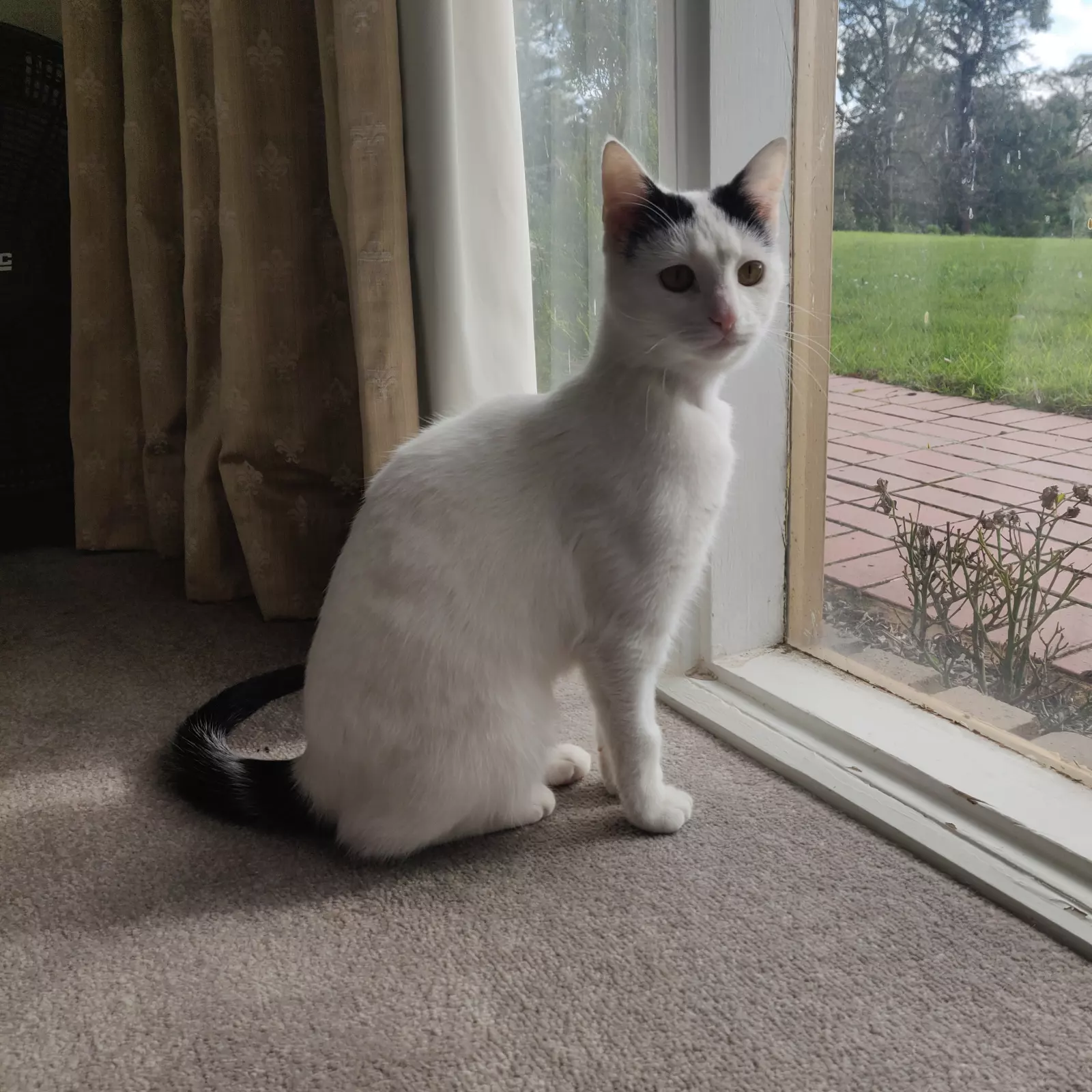 Very friendly female cat with short white fur and black spots on her head and tail. She has already been Desexed and vaccinated. Domesticated (tends to stay indoors). Ideally would be best to keep her indoors only for the first few months to ensure she is settled and comfortable before you allow her outside so that she doesn't get lost in a new environment.